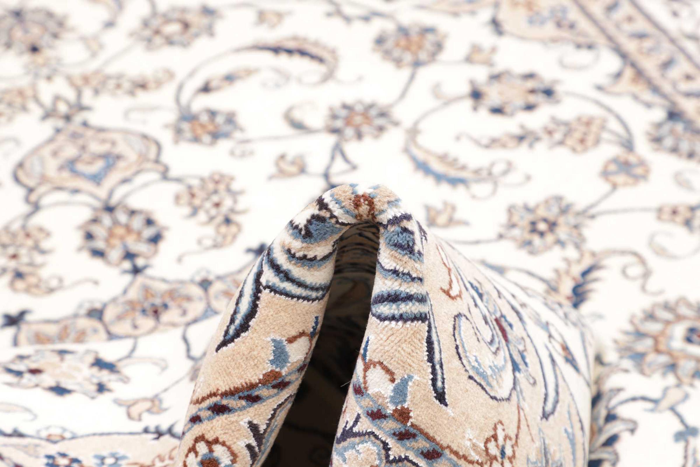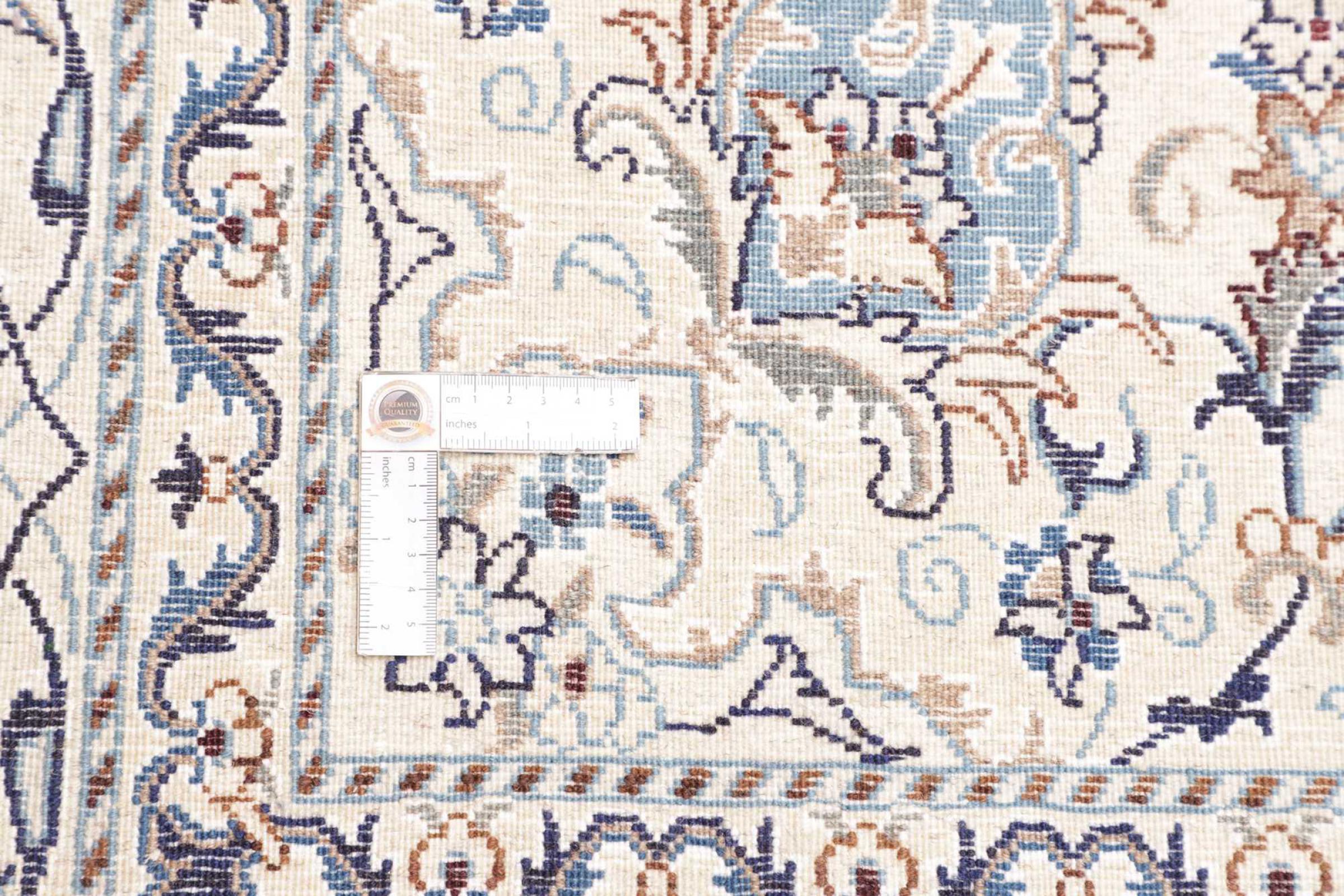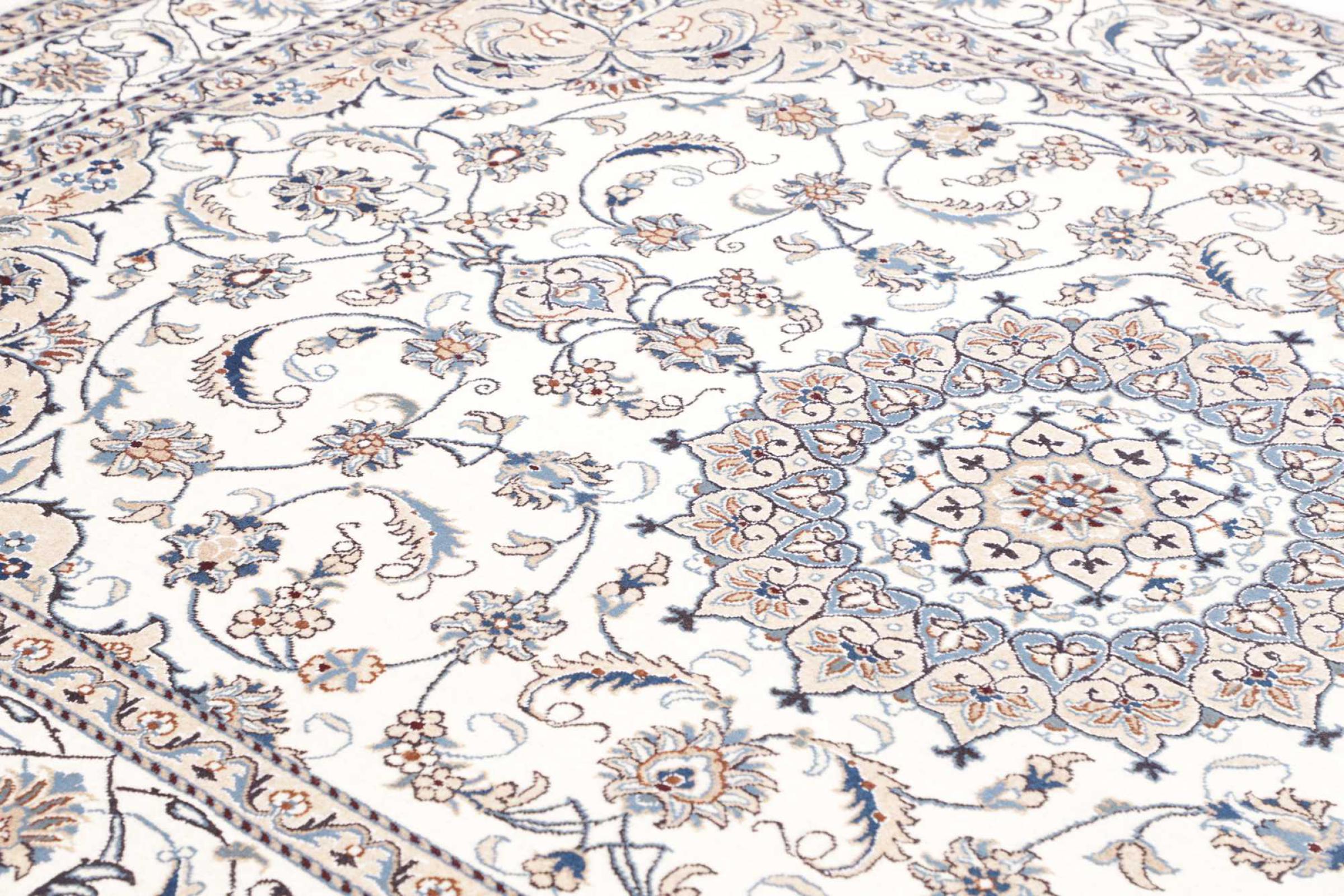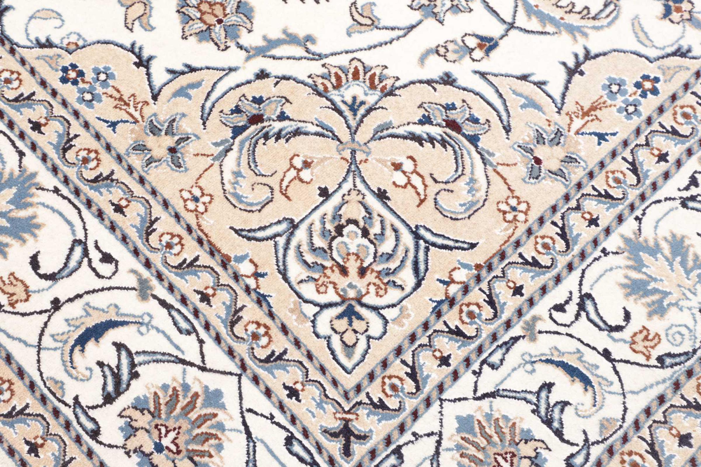 This Nain rug is classified as 12La. Its typical Nain colour scheme gives it an elegant and sophisticated look. This Persian rug was hand-knotted in the city of Nain, which lies on the western edge of the Dasht-e-Kavir desert, using high-quality wool and natural silk. At 12La, it is not as finely detailed with ornamentation as a Nain 9La or 6La.