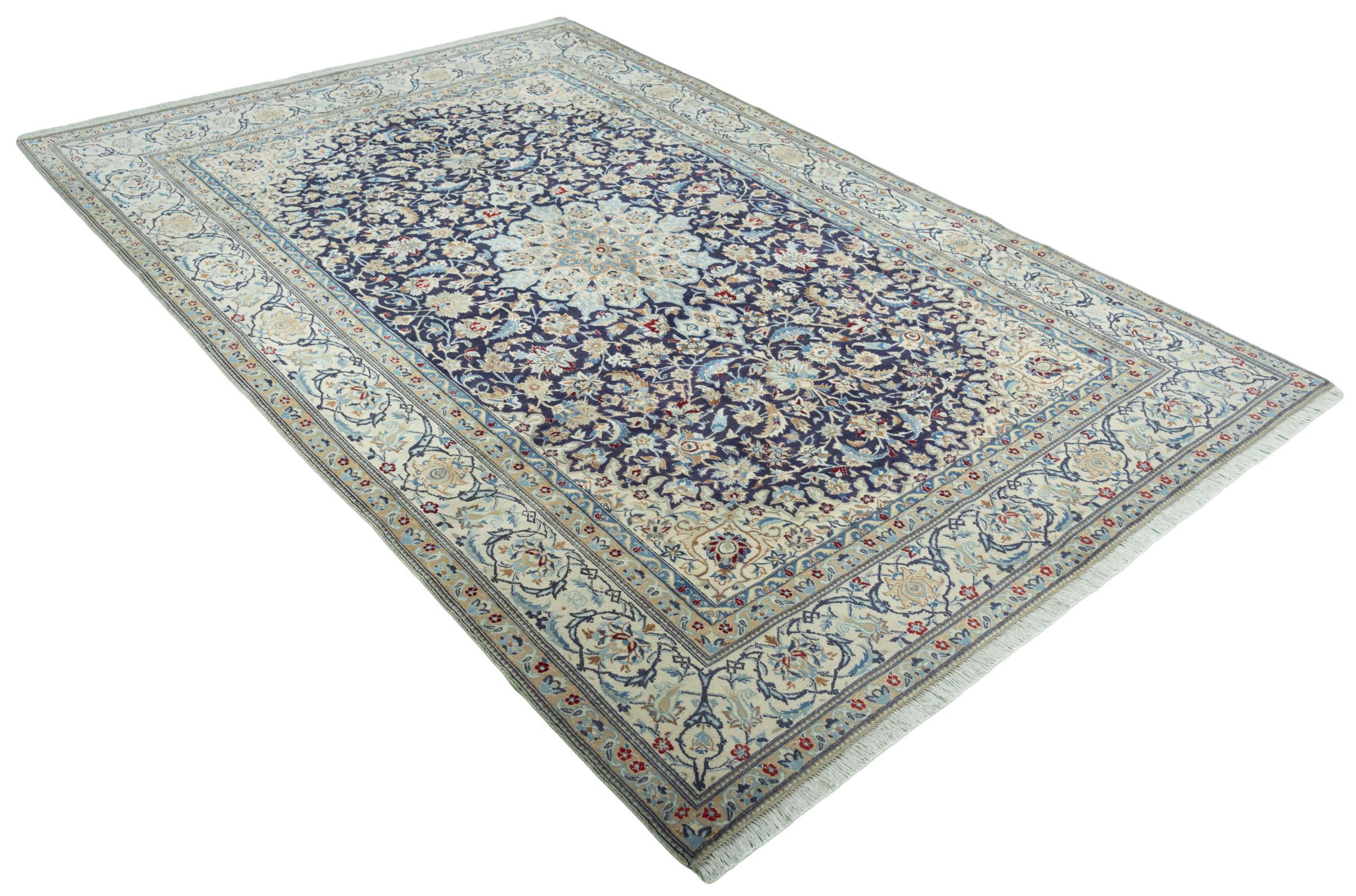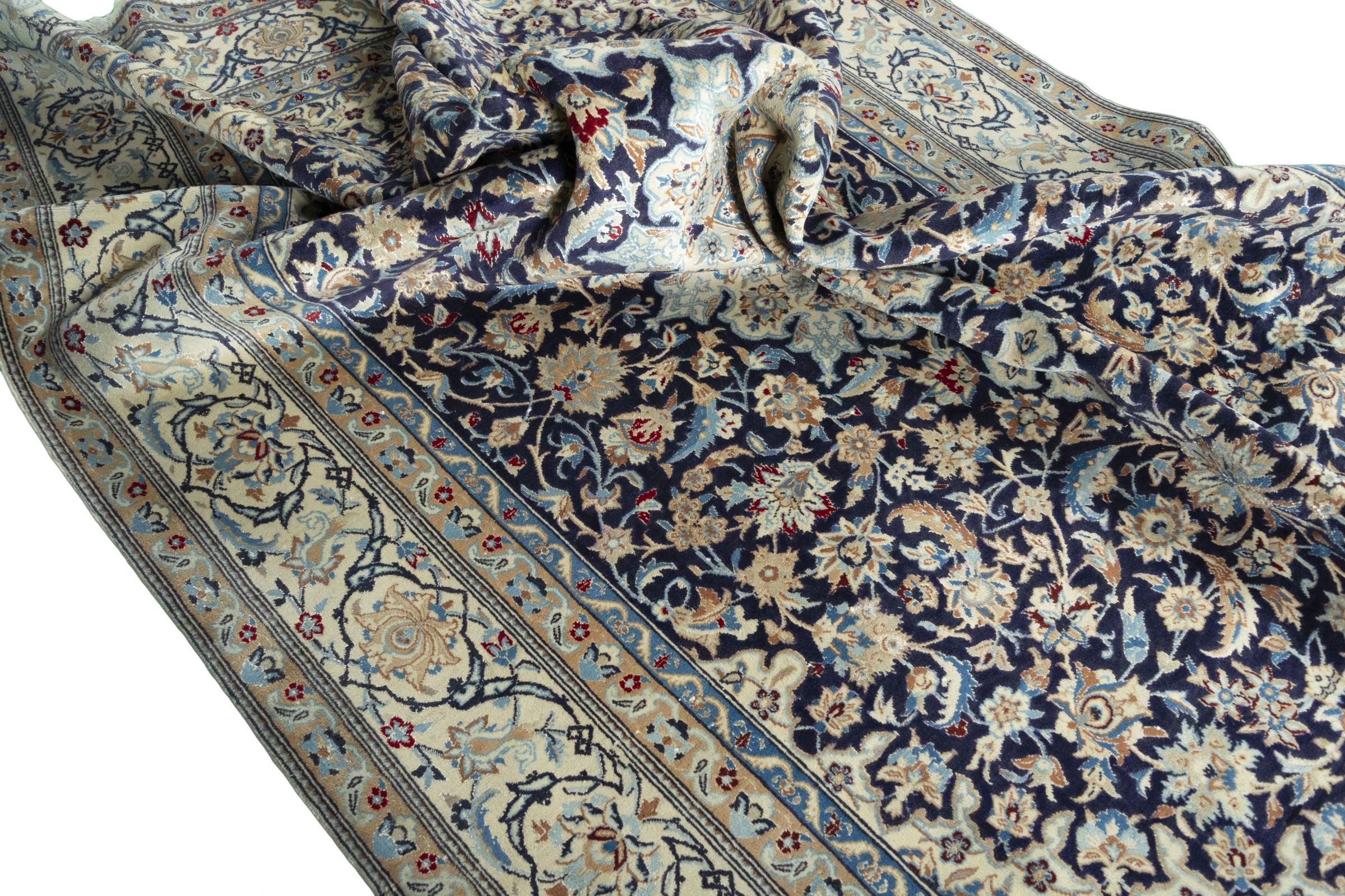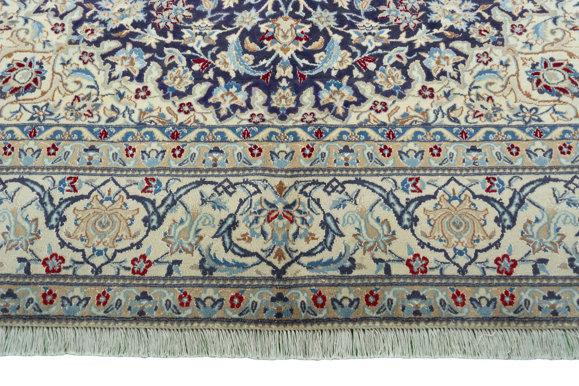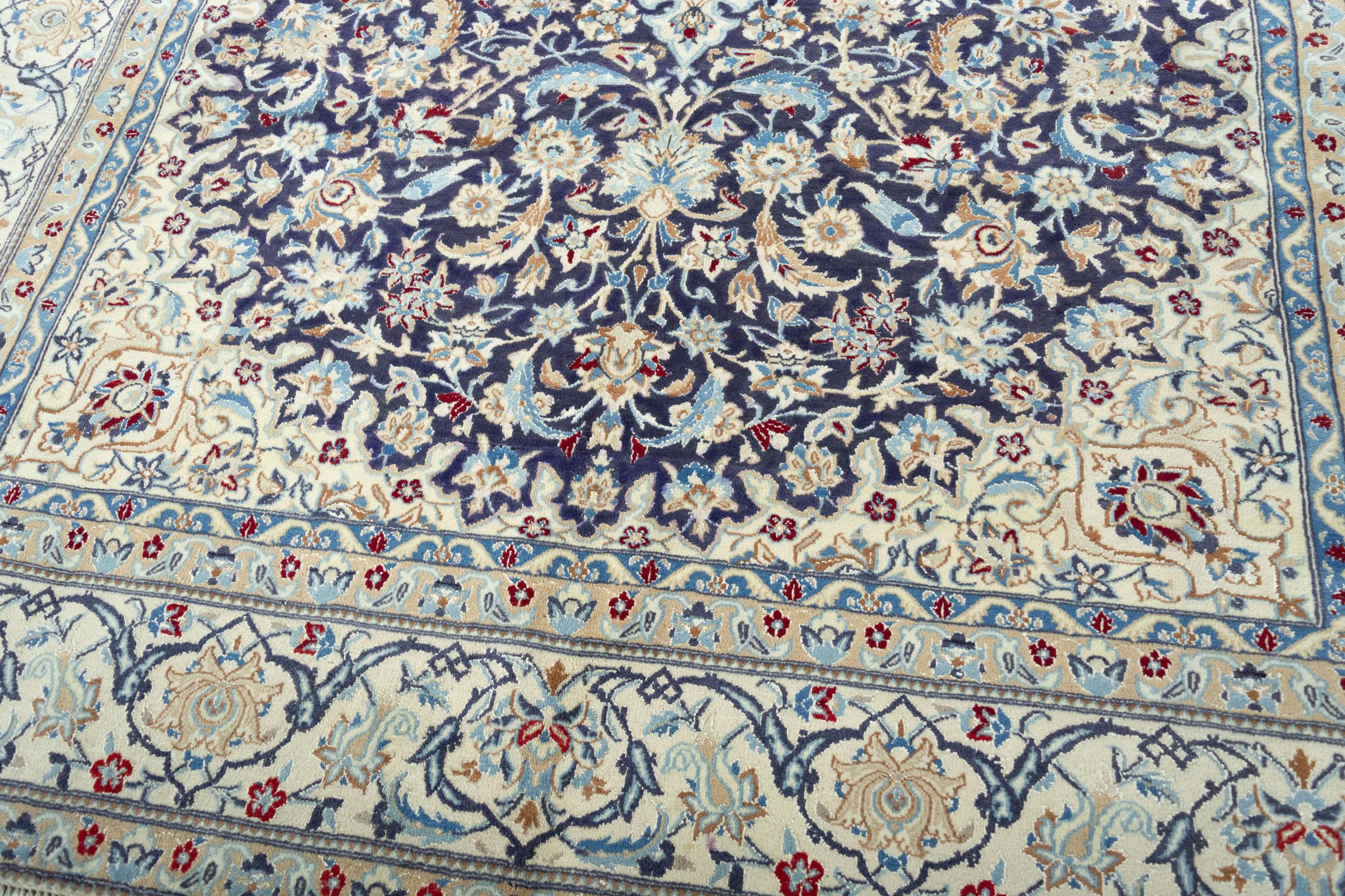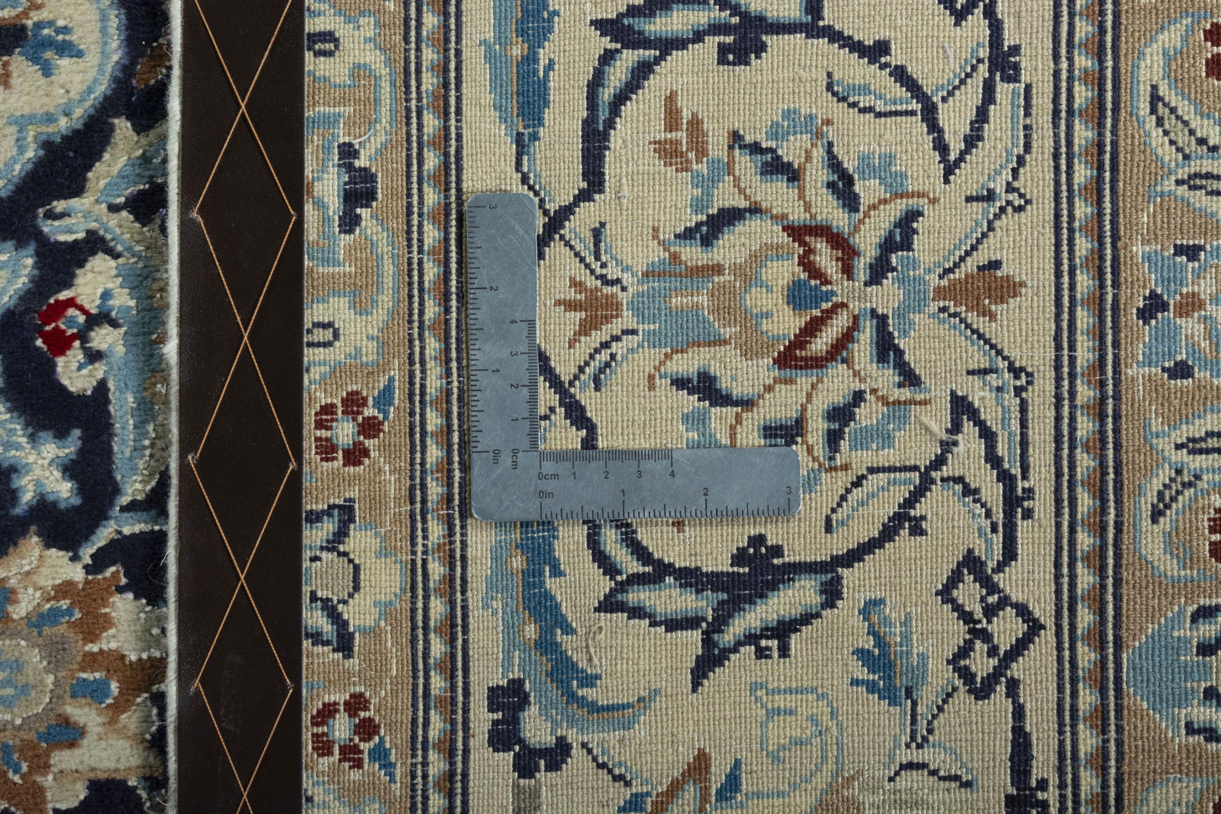 This Nain rug is classified as 9La. The excellent quality, the beautiful oriental design with its curvilinear patterns will delight every buyer. This Persian rug was hand-knotted in the city of Nain, which lies on the western edge of the Dasht-e-Kavir desert, from high-quality wool and natural silk. 9La Nain rugs are significantly finer than a 12La and already show beautiful details.