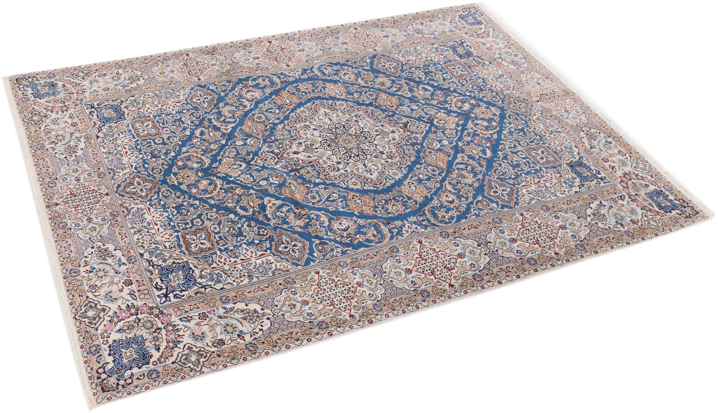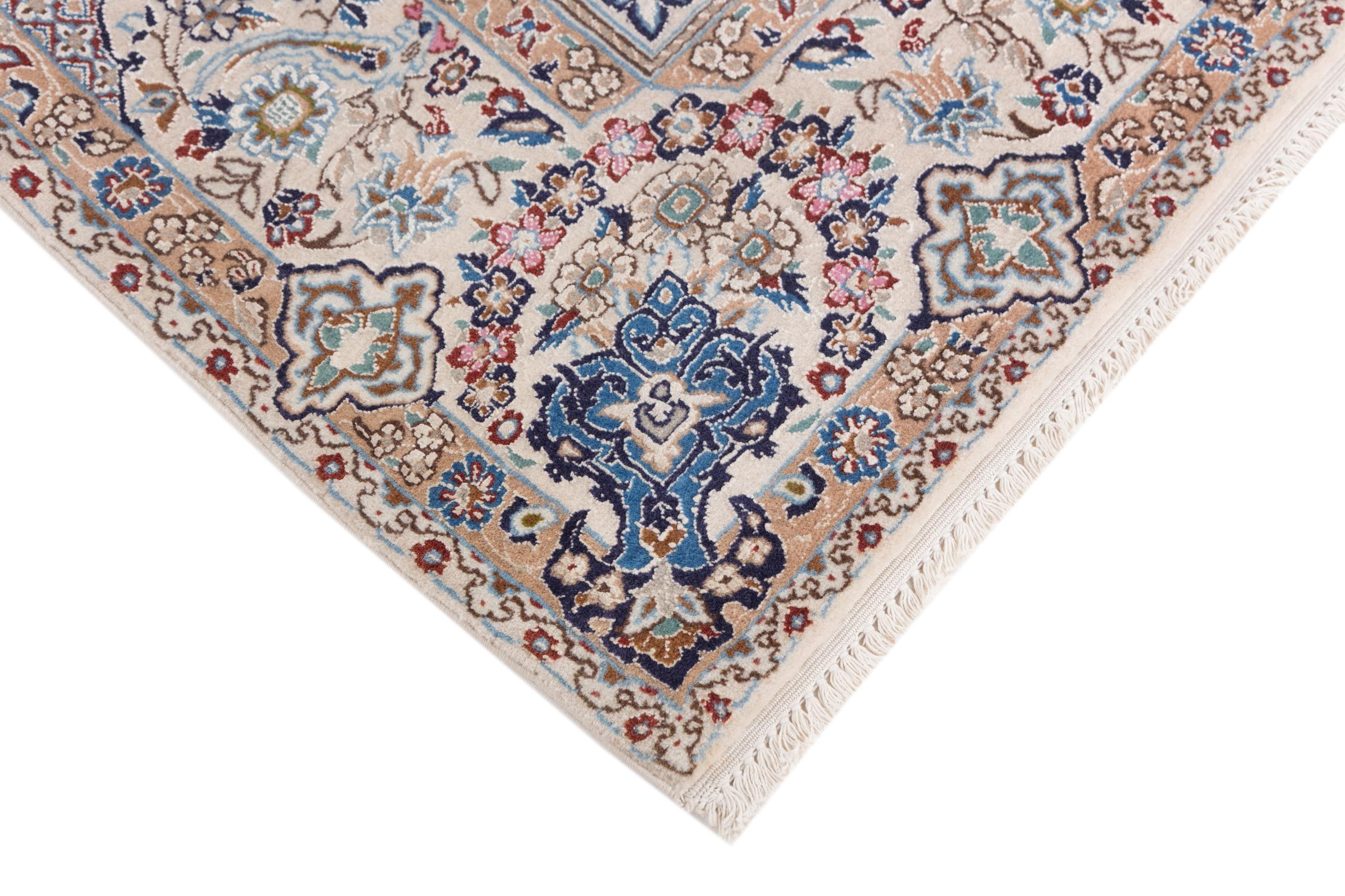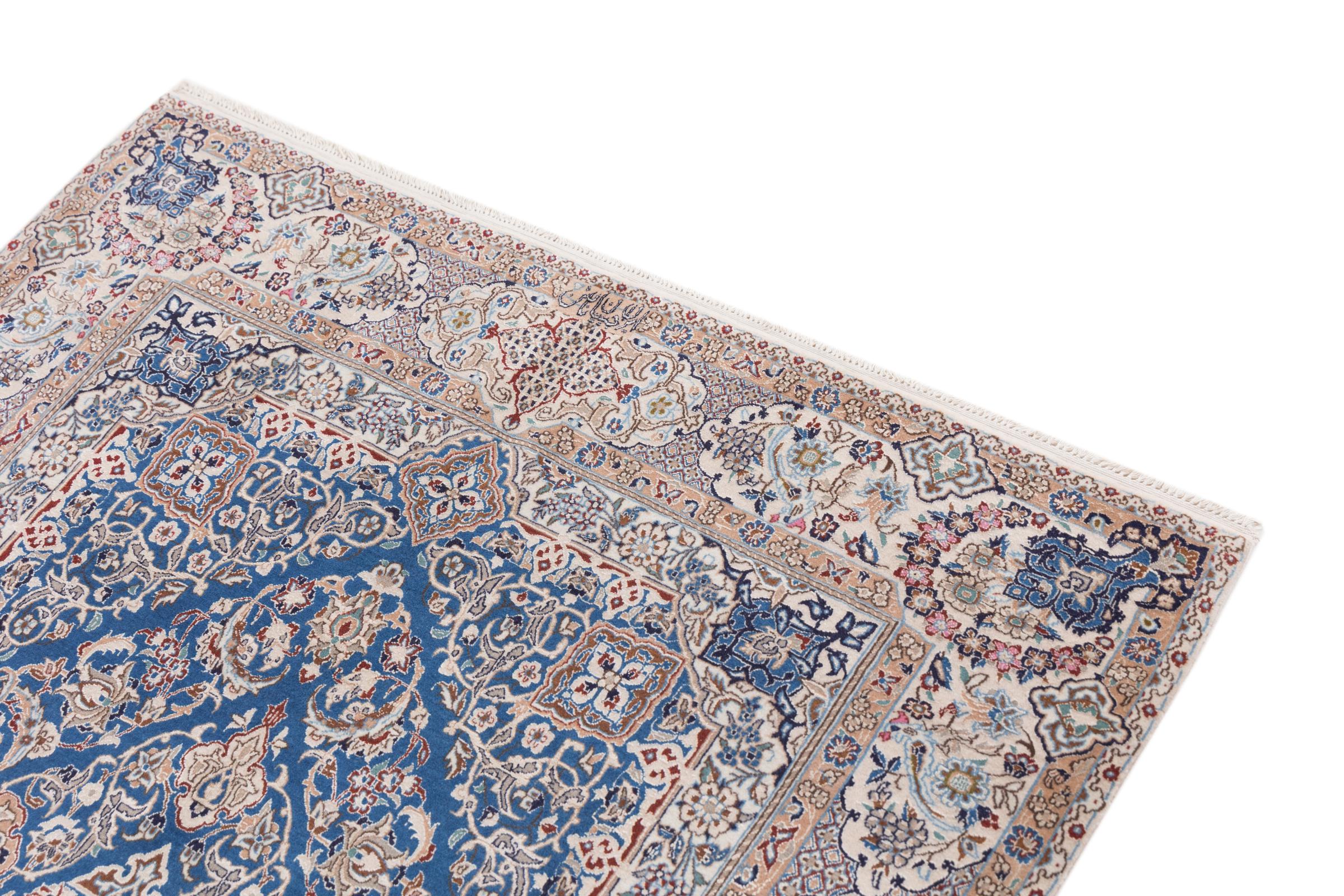 This Nain rug combines quality, tradition and an unmistakable design. It was hand-knotted from high-quality cork wool and natural silk in the desert town of the same name, Nain. Lovers of valuable rugs from Iran will love this Persian rug. With Nain rugs in the 6La and 4La classifications, you have a real work of art with an incredible level of detail that you can really lose yourself in. Nain 4La rugs are almost impossible to find today, as they are extremely elaborate to produce.
