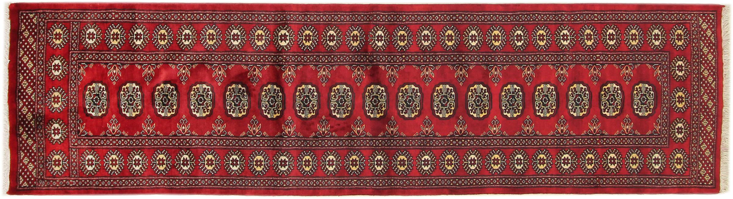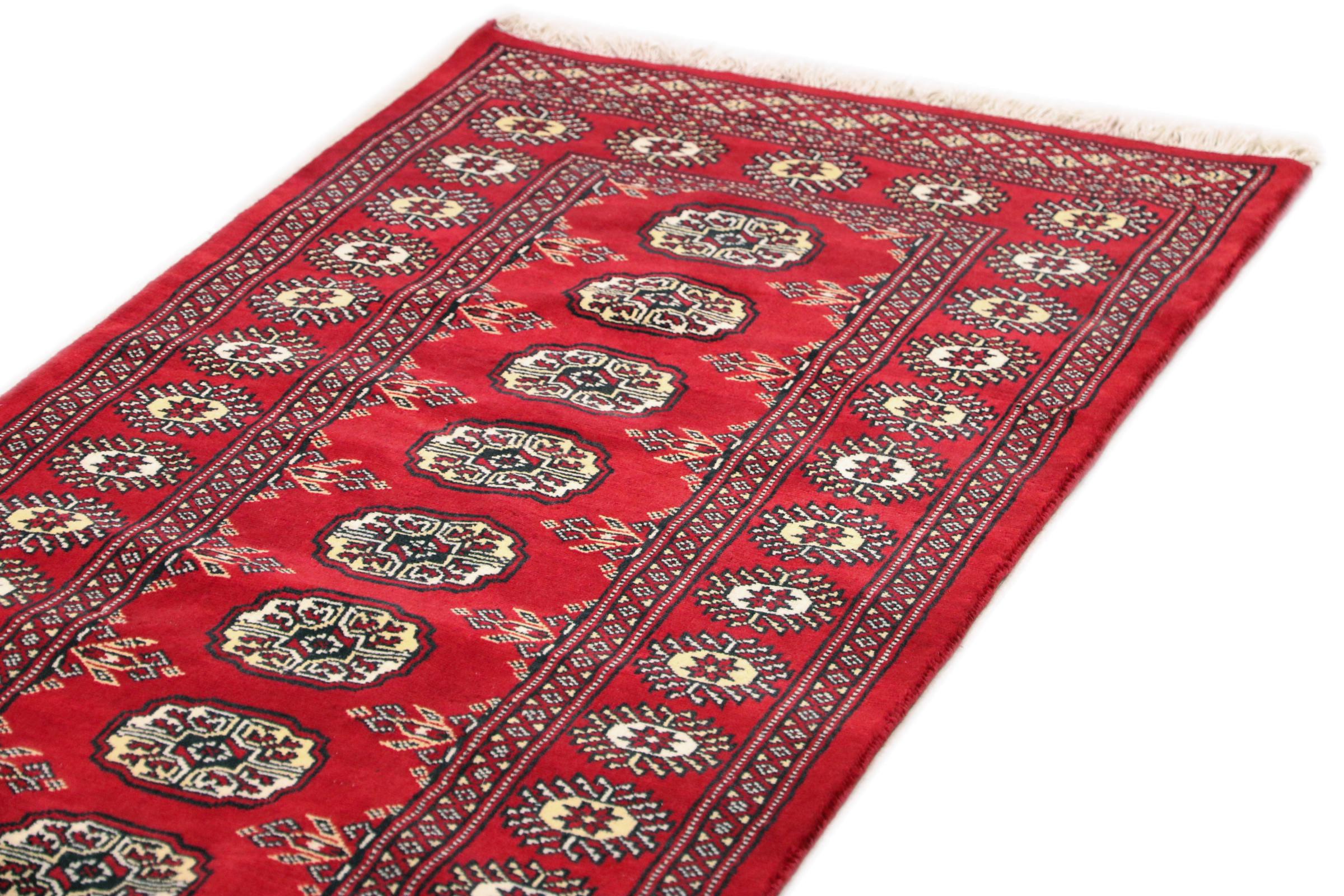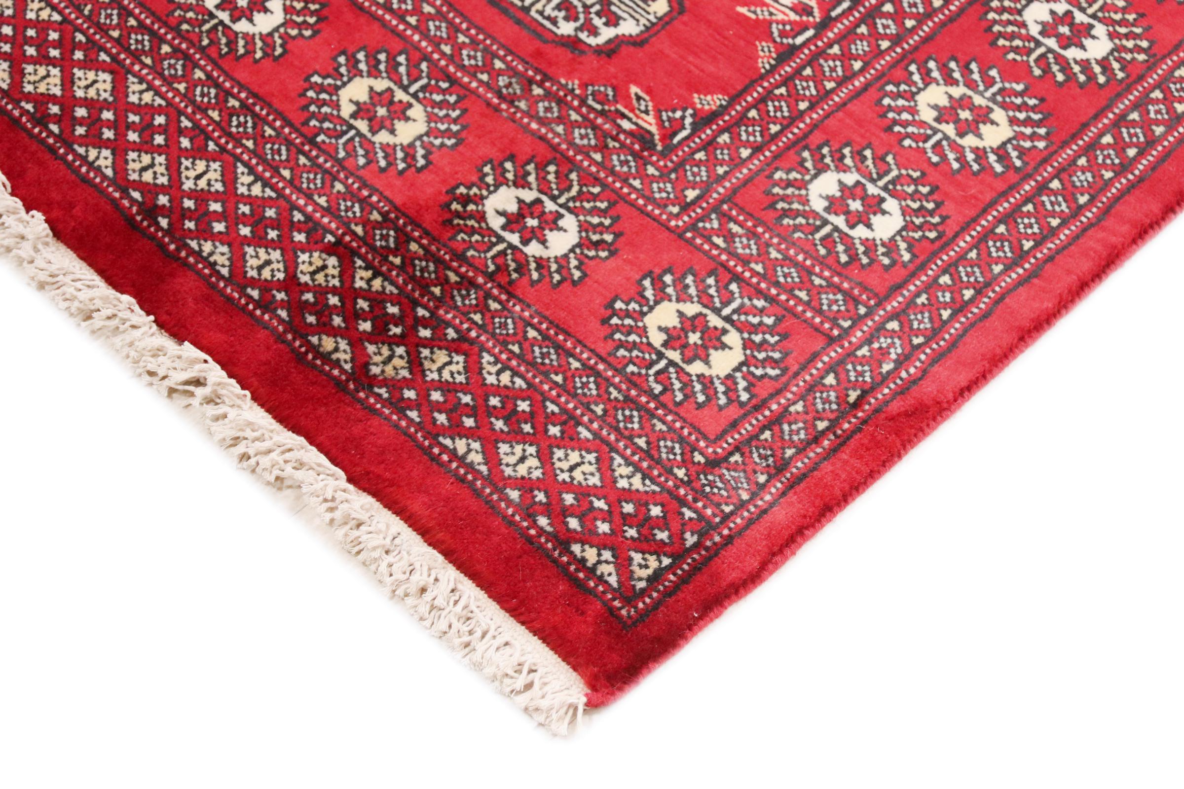 A large part of Pakistani rug production takes place in and around the cities of Lahore and Karachi. Many of the rug knotters of that time fled to Pakistan during the war with India and settled there. Today, especially hand-knotted Pakistan Bukhara rugs are well-known. Similar to the Afghan oriental rugs, Pakistani rugs are also made in dark colours and mostly have shades of red. Even the well-known elephant foot pattern (repeating octagonal pattern) can be found on a Pakistani.