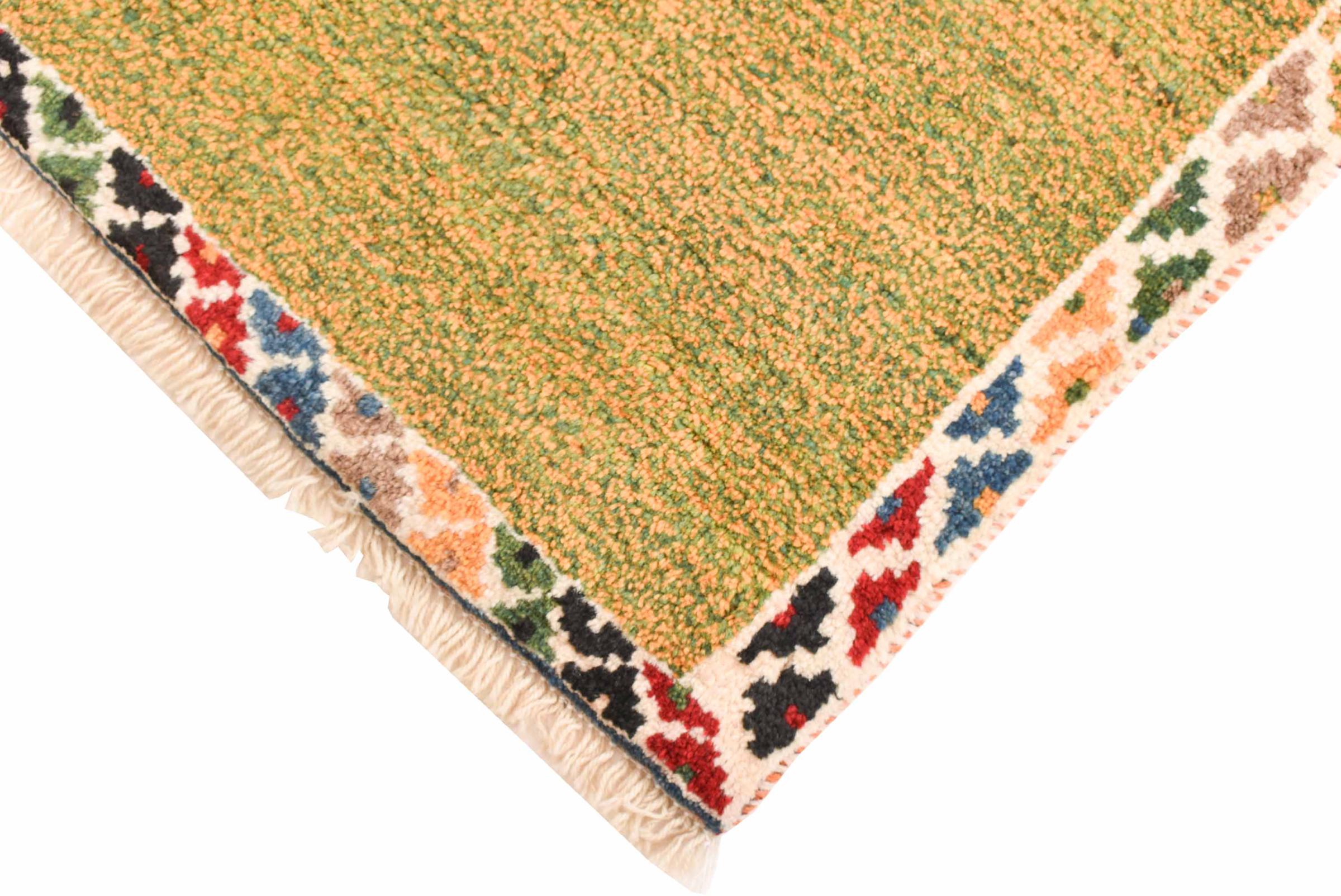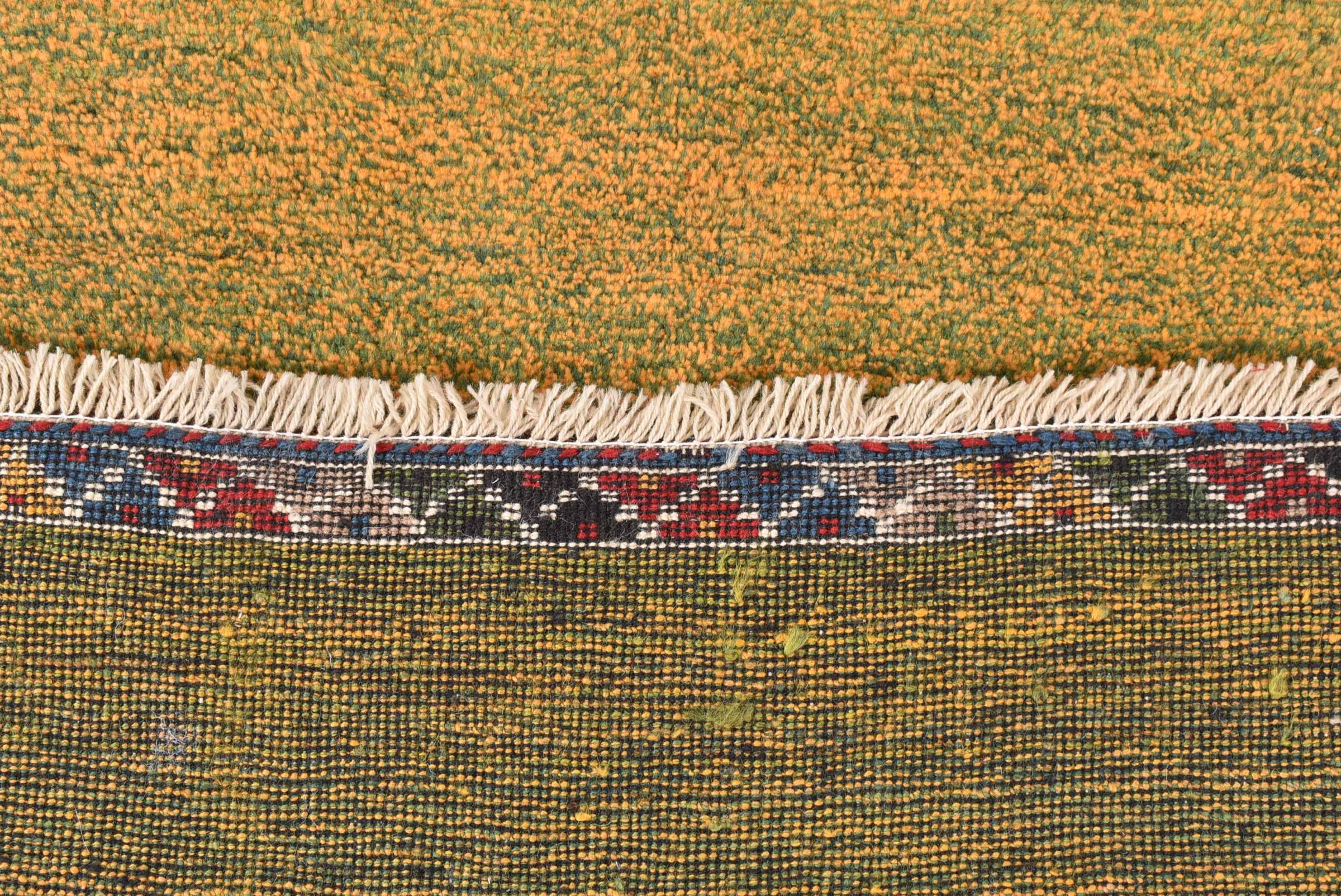 This beautiful rug is a Persian Gabbeh and thus belongs to the highest quality Gabbeh rugs. The rugs are knotted by nomads or semi-nomads in Iran following traditional handicraft. The simple motifs and patterns are mostly inspired by the nomads' close environment. For example camels, trees or bushes can be found on the traditional rugs. Persian Gabbeh rugs are made of wool from locally raised flocks of sheep. The wool is therefore mostly still spun by hand. Thus each of these oriental rugs embodies a unique character of centuries-old culture.