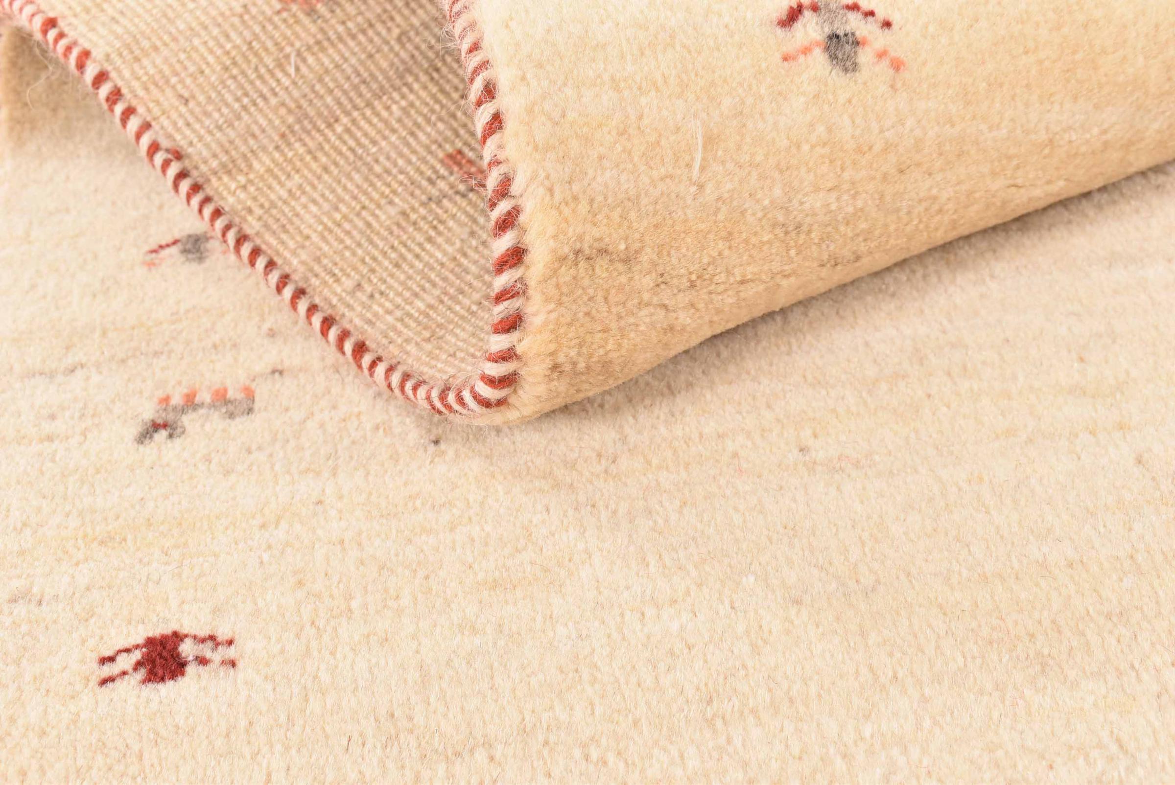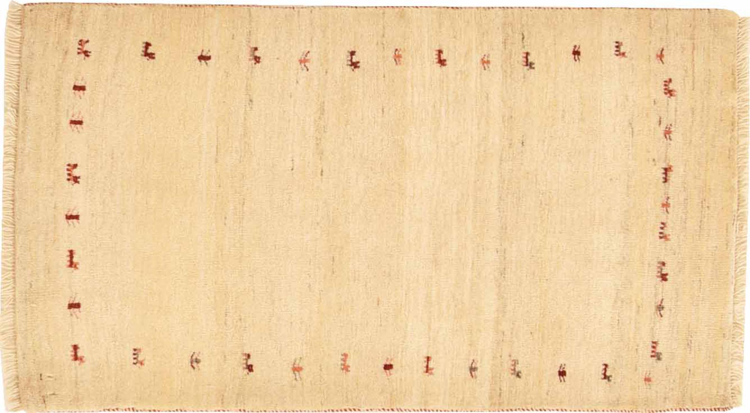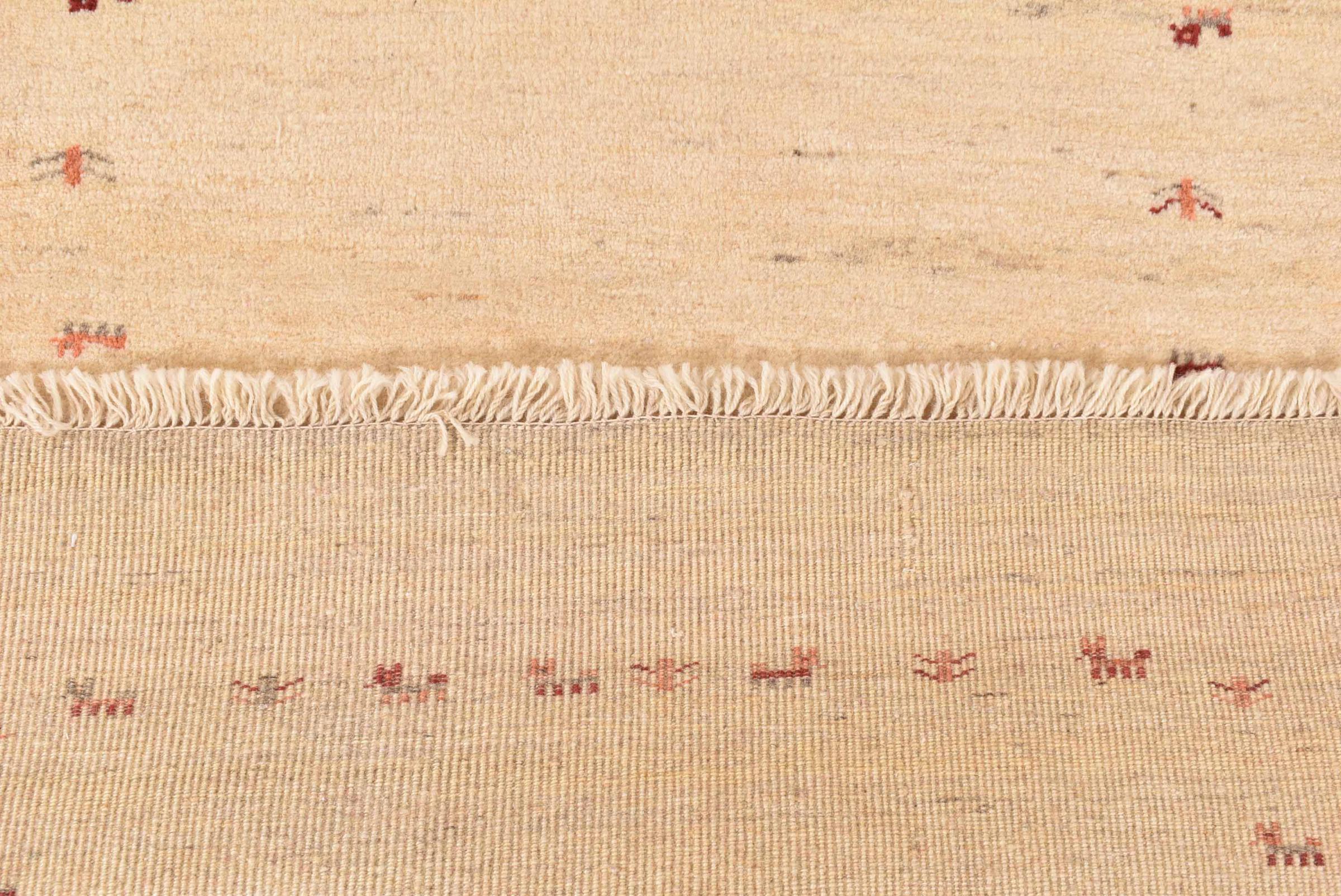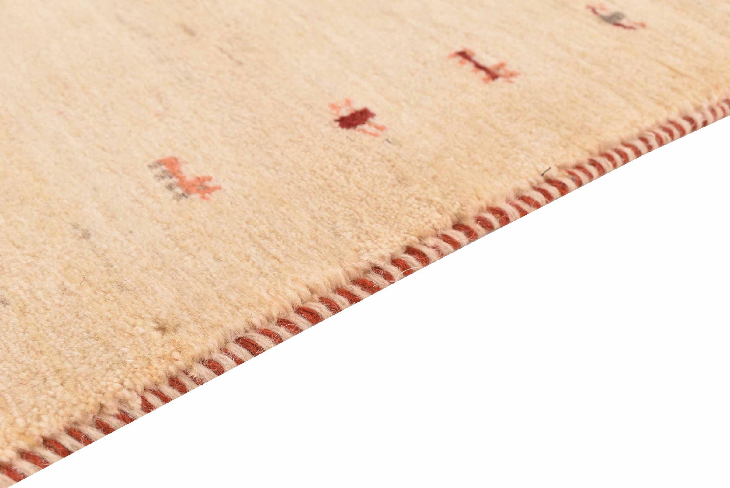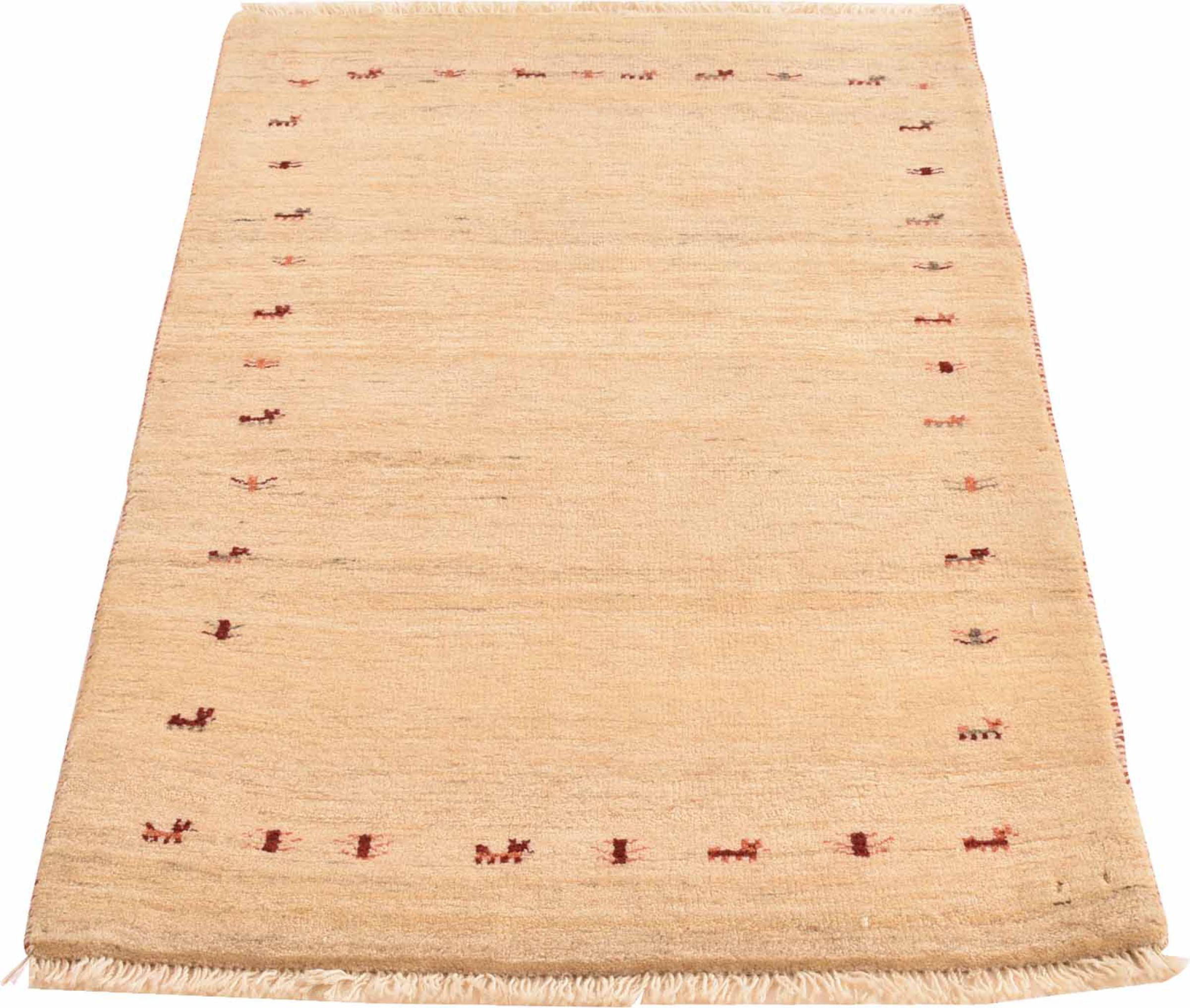 This beautiful rug is a Persian Gabbeh and thus belongs to the highest quality Gabbeh rugs. The rugs are knotted by nomads or semi-nomads in Iran following traditional handicraft. The simple motifs and patterns are mostly inspired by the nomads' close environment. For example camels, trees or bushes can be found on the traditional rugs. Persian Gabbeh rugs are made of wool from locally raised flocks of sheep. The wool is therefore mostly still spun by hand. Thus each of these oriental rugs embodies a unique character of centuries-old culture.