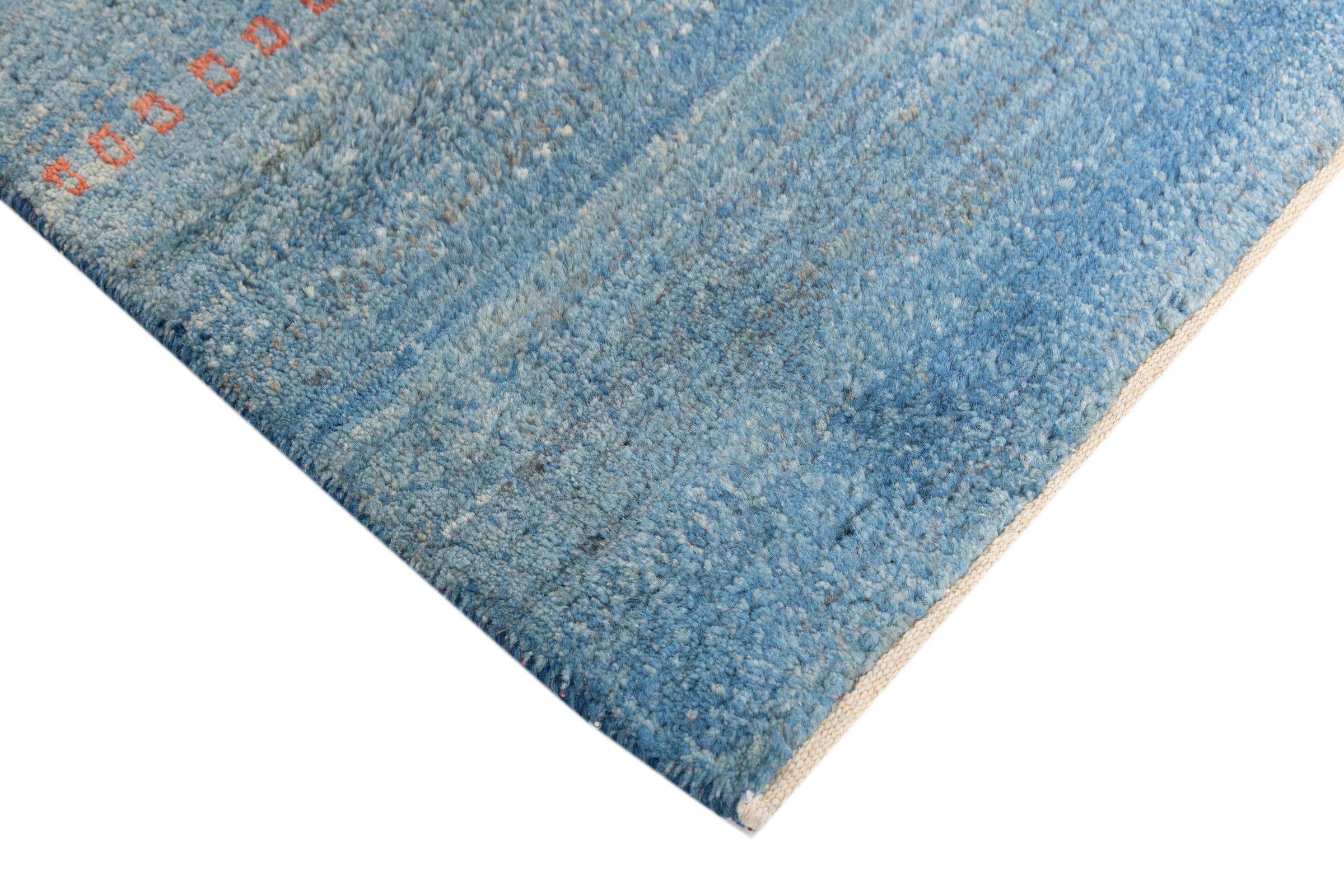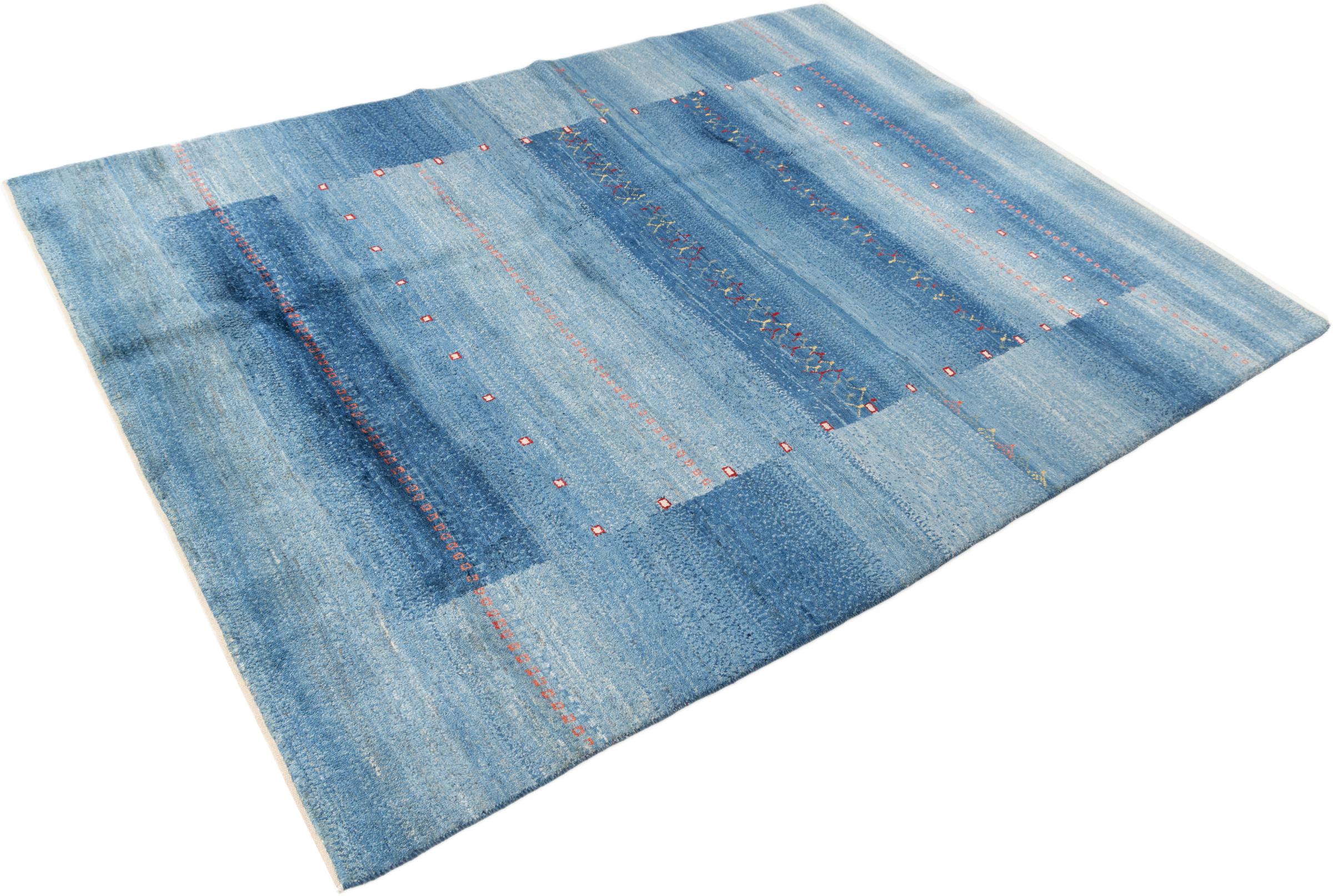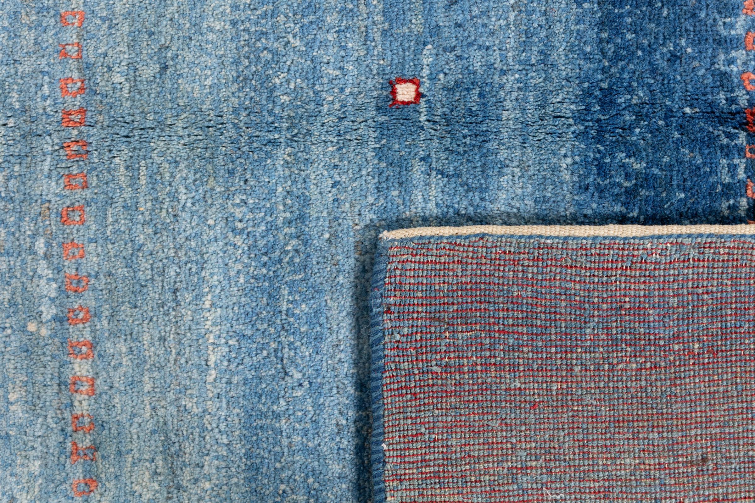 This beautiful rug is a Persian Gabbeh and thus belongs to the highest quality Gabbeh rugs. The rugs are knotted by nomads or semi-nomads in Iran following traditional handicraft. The simple motifs and patterns are mostly inspired by the nomads' close environment. For example camels, trees or bushes can be found on the traditional rugs. Persian Gabbeh rugs are made of wool from locally raised flocks of sheep. The wool is therefore mostly still spun by hand. Thus each of these oriental rugs embodies a unique character of centuries-old culture.