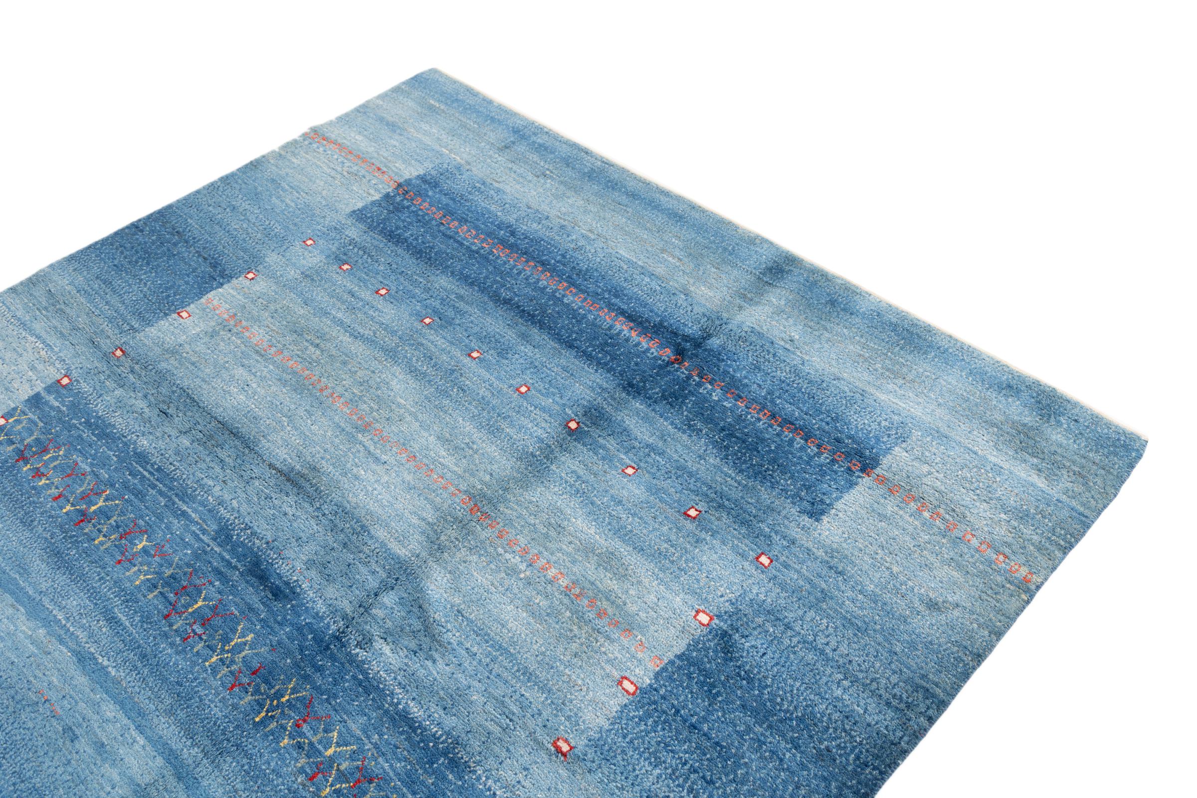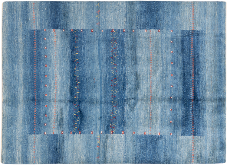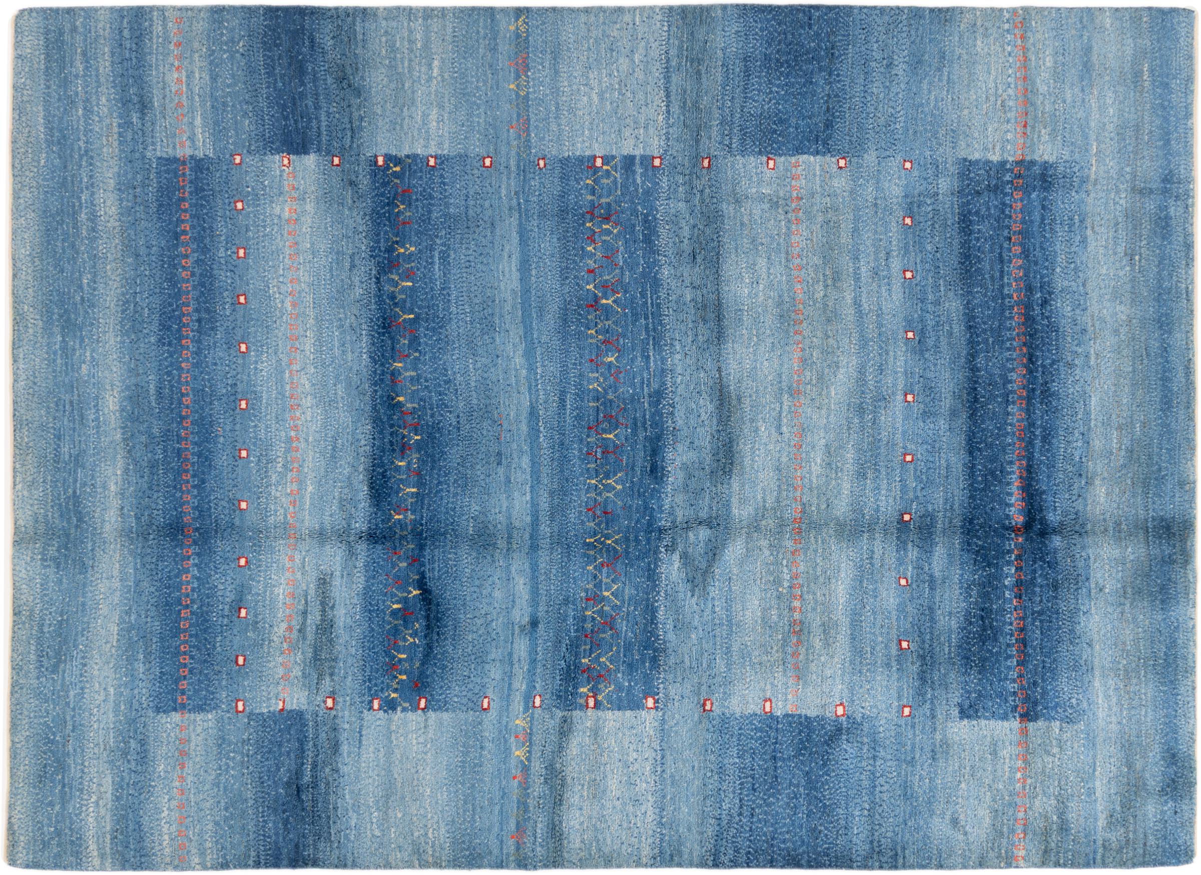 This beautiful rug is a Persian Gabbeh and thus belongs to the highest quality Gabbeh rugs. The rugs are knotted by nomads or semi-nomads in Iran following traditional handicraft. The simple motifs and patterns are mostly inspired by the nomads' close environment. For example camels, trees or bushes can be found on the traditional rugs. Persian Gabbeh rugs are made of wool from locally raised flocks of sheep. The wool is therefore mostly still spun by hand. Thus each of these oriental rugs embodies a unique character of centuries-old culture.
