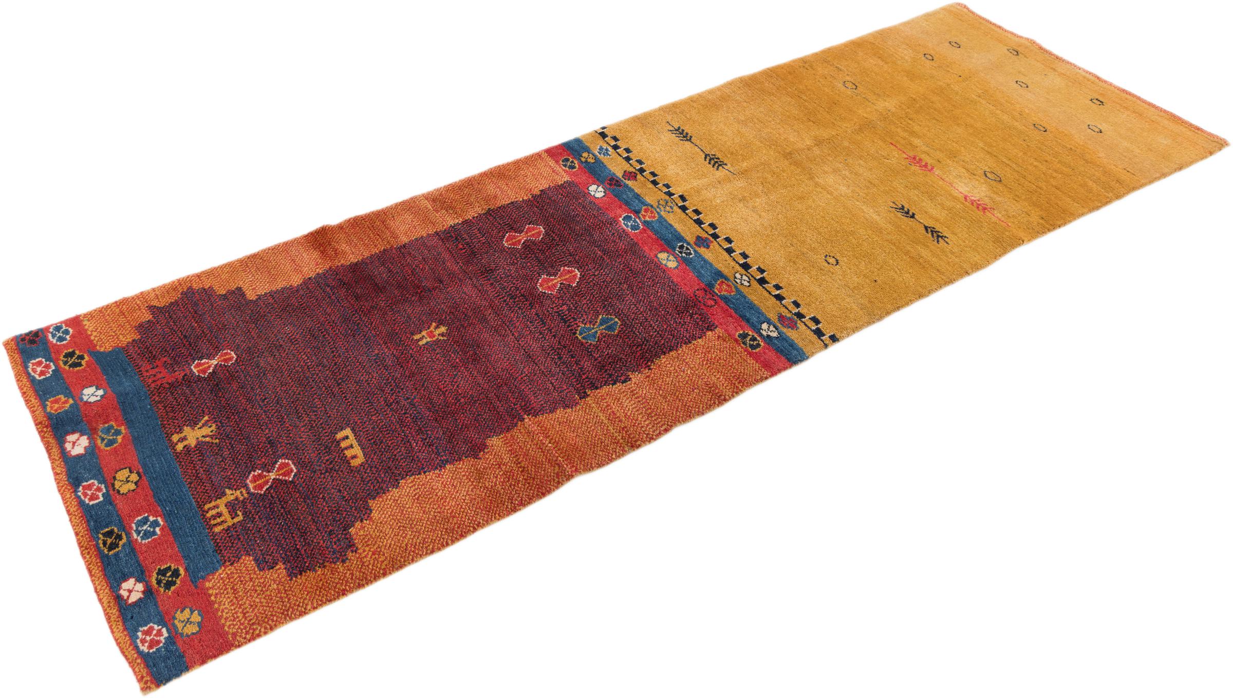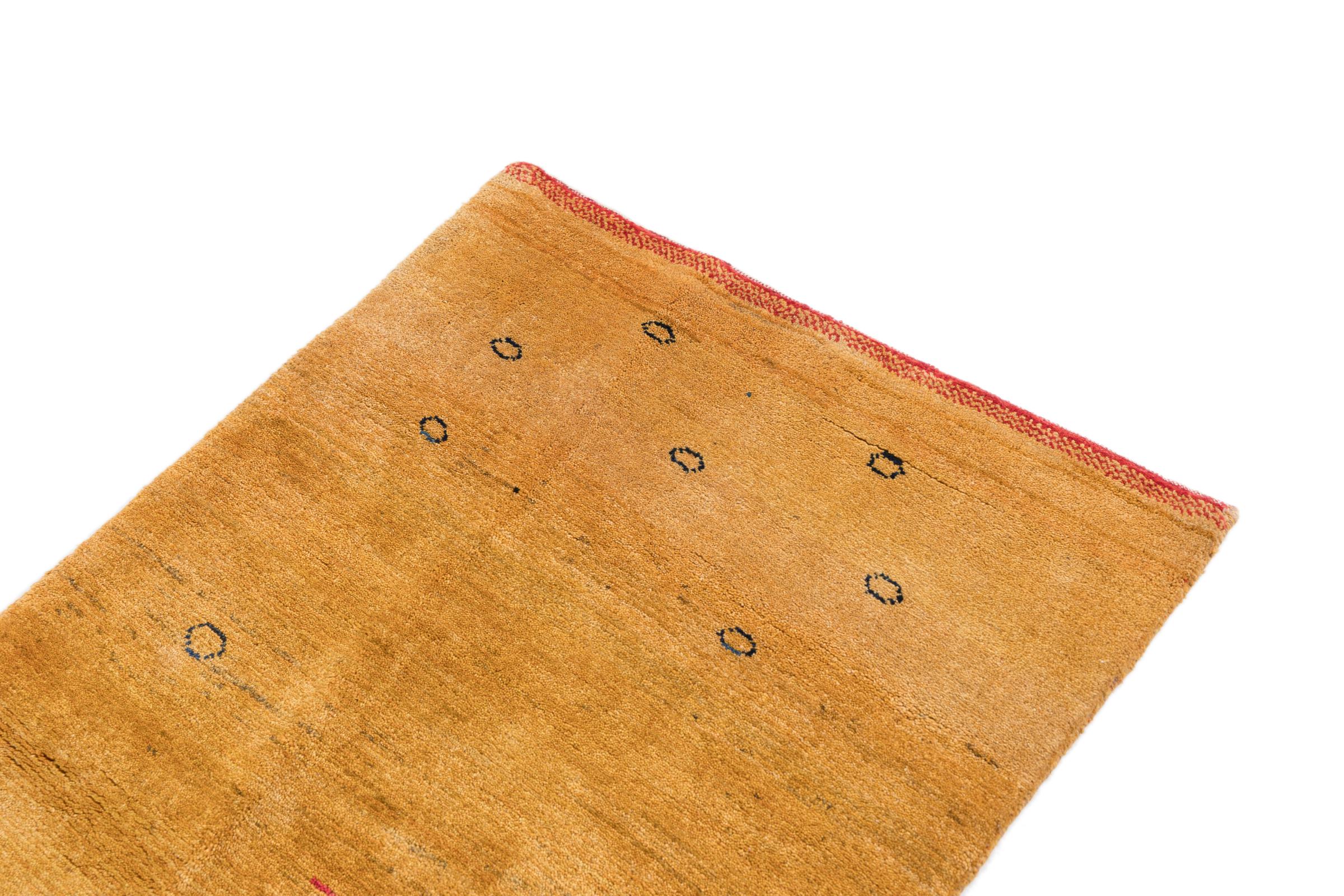 This beautiful rug is a Persian Gabbeh and thus belongs to the highest quality Gabbeh rugs. The rugs are knotted by nomads or semi-nomads in Iran following traditional handicraft. The simple motifs and patterns are mostly inspired by the nomads' close environment. For example camels, trees or bushes can be found on the traditional rugs. Persian Gabbeh rugs are made of wool from locally raised flocks of sheep. The wool is therefore mostly still spun by hand. Thus each of these oriental rugs embodies a unique character of centuries-old culture.