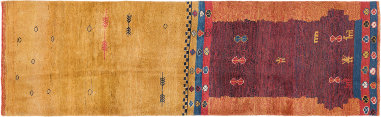 Carpet ID: 296129007688 Size: 281x85 cm Thickness: ap. 18 mm Knot density: 72 000 - 90 000 / m² Manufacturing: Knotted by hand Pile: Handspun wool Warp: Sheep wool Origin: Persia Age: New Weight: ap. 12 kg Also know as Gabbe, Ghabbeh In stock: Unique - Only 1 in stock