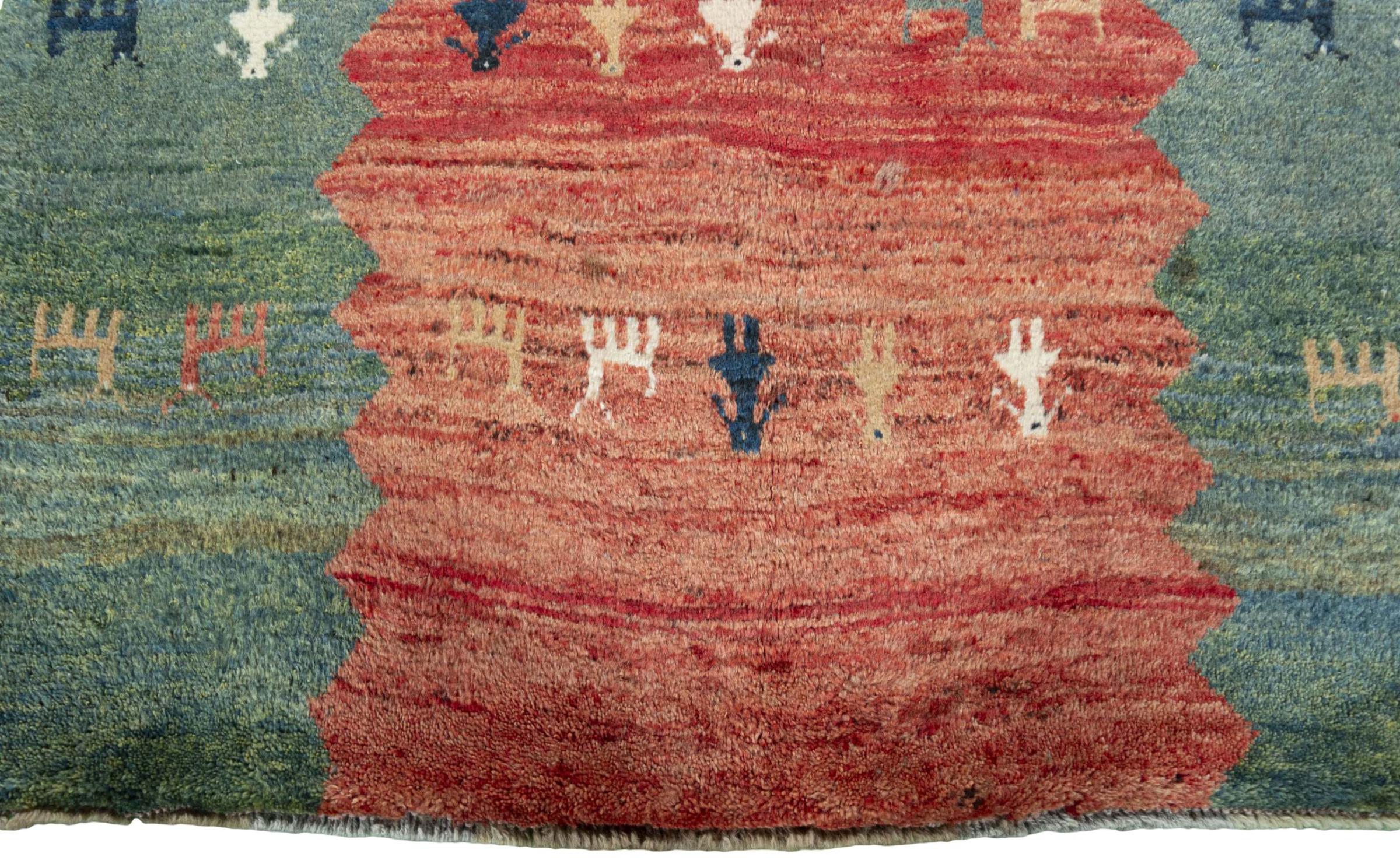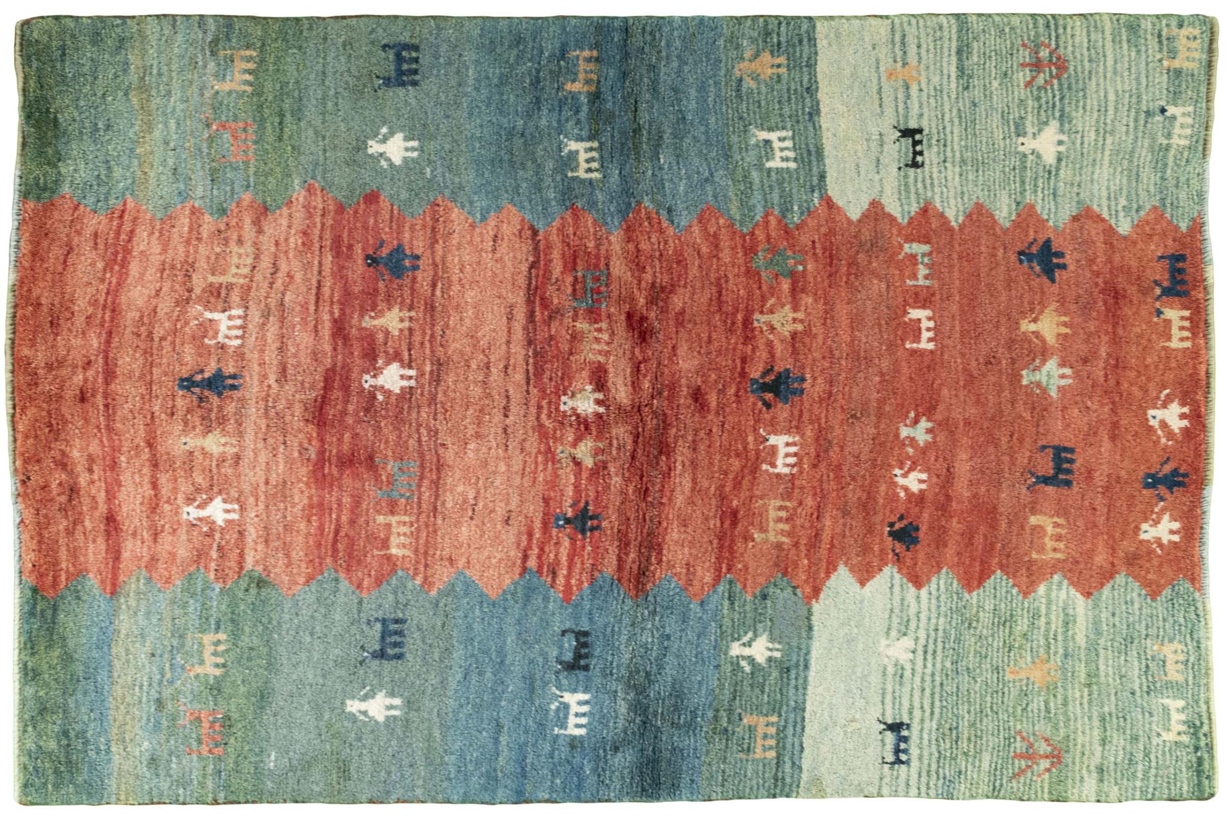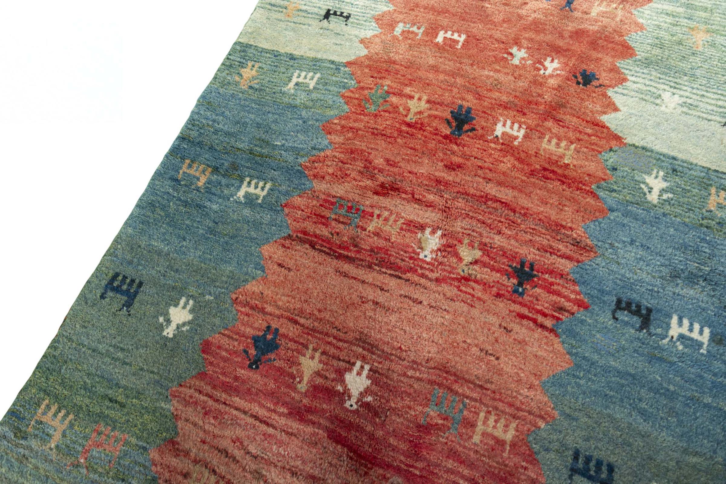 This beautiful rug is a Persian Gabbeh and thus belongs to the highest quality Gabbeh rugs. The rugs are knotted by nomads or semi-nomads in Iran following traditional handicraft. The simple motifs and patterns are mostly inspired by the nomads' close environment. For example camels, trees or bushes can be found on the traditional rugs. Persian Gabbeh rugs are made of wool from locally raised flocks of sheep. The wool is therefore mostly still spun by hand. Thus each of these oriental rugs embodies a unique character of centuries-old culture.