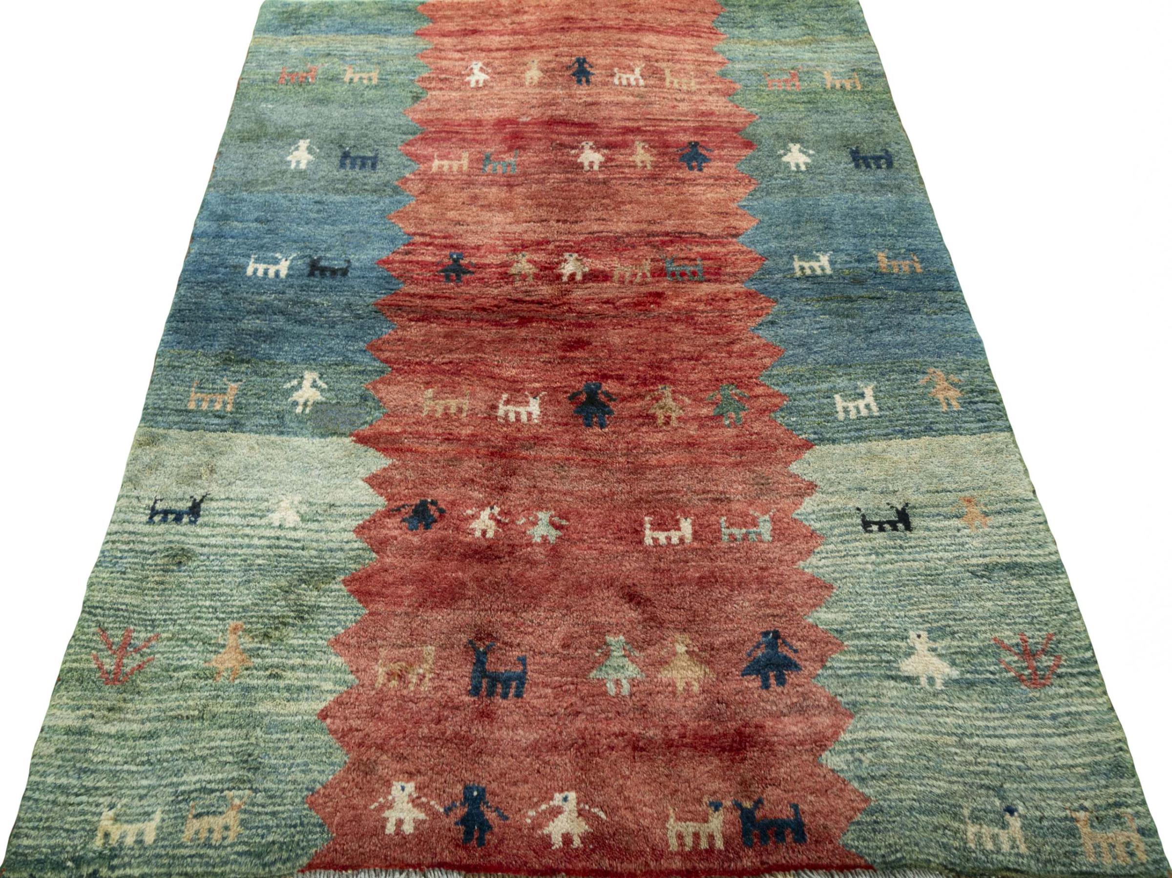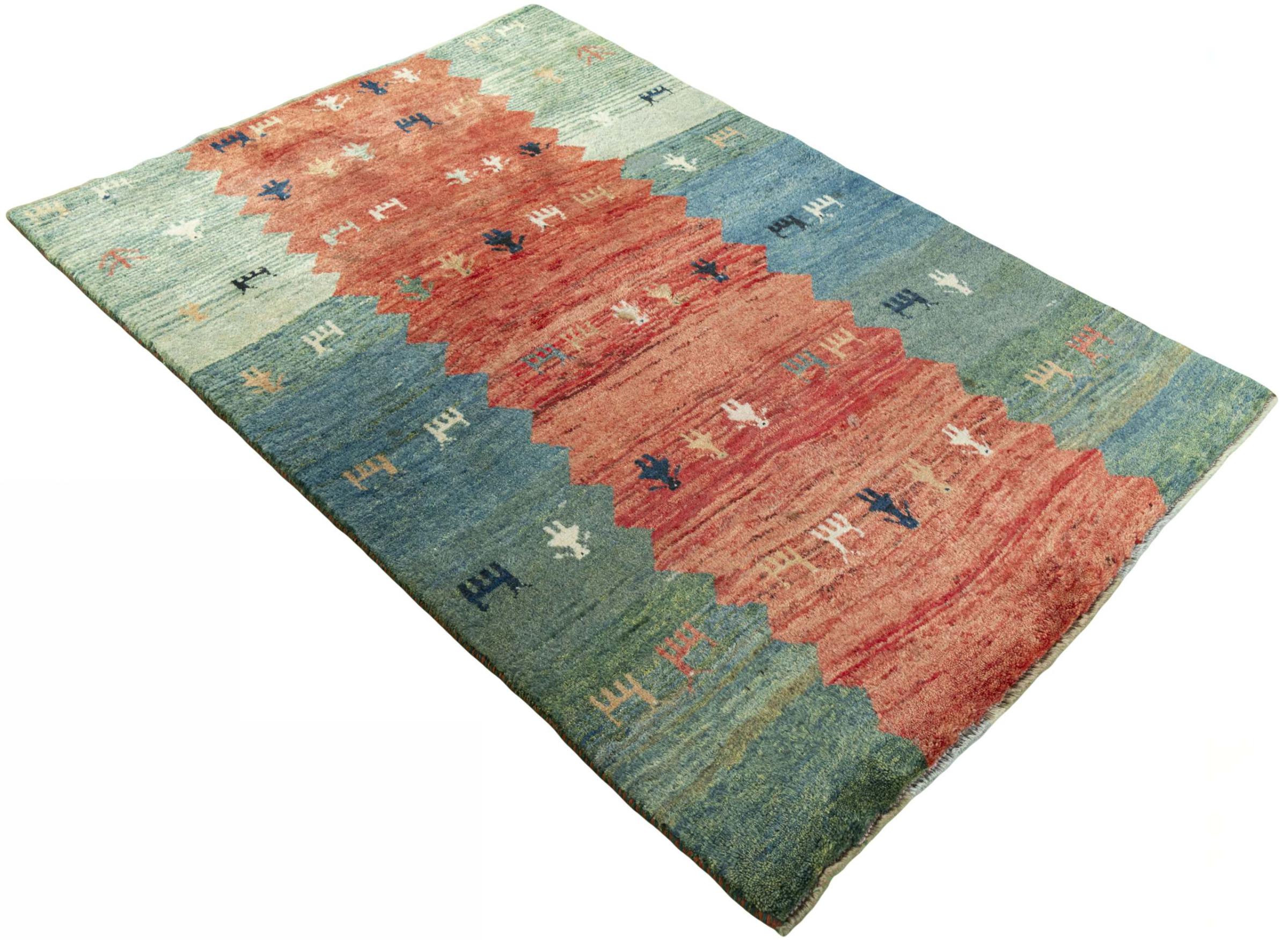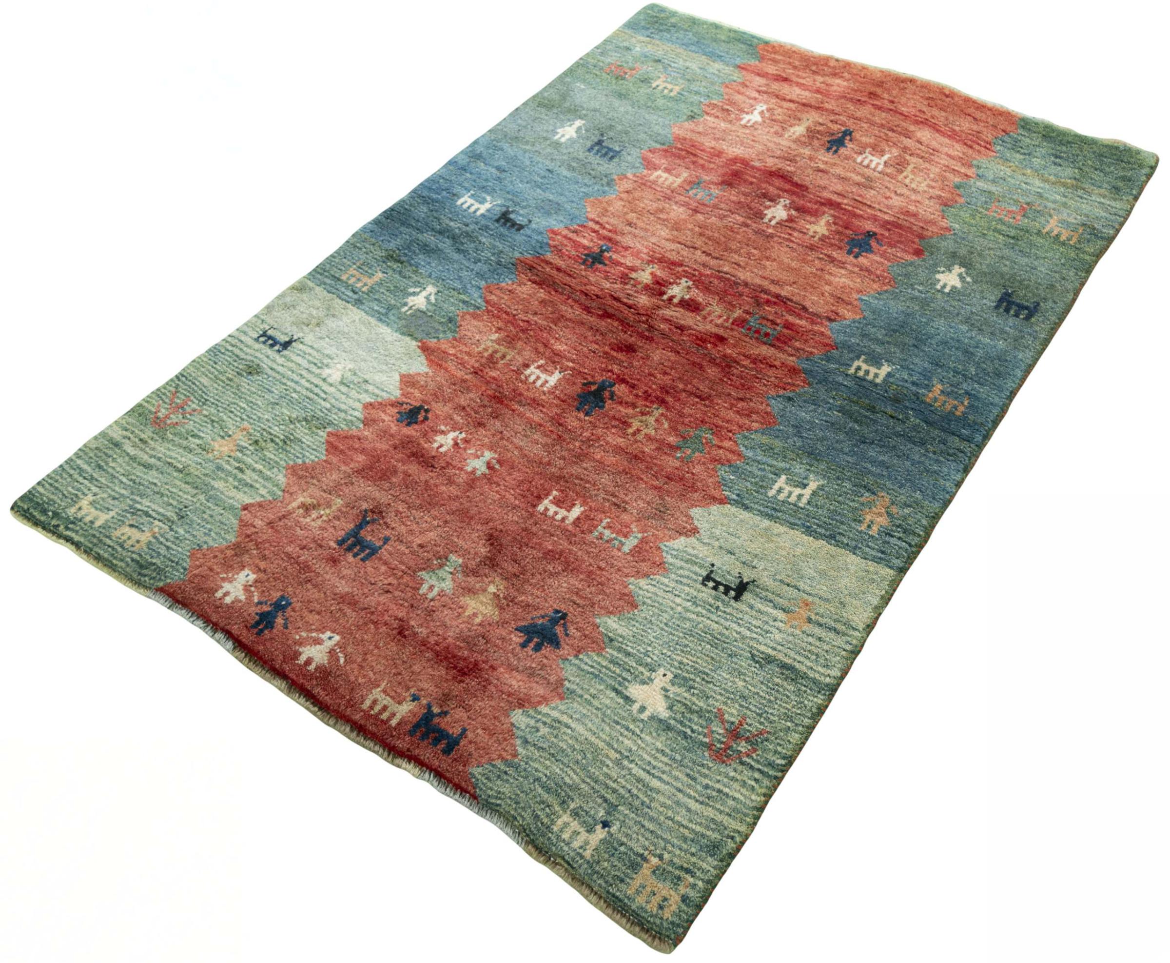 This beautiful rug is a Persian Gabbeh and thus belongs to the highest quality Gabbeh rugs. The rugs are knotted by nomads or semi-nomads in Iran following traditional handicraft. The simple motifs and patterns are mostly inspired by the nomads' close environment. For example camels, trees or bushes can be found on the traditional rugs. Persian Gabbeh rugs are made of wool from locally raised flocks of sheep. The wool is therefore mostly still spun by hand. Thus each of these oriental rugs embodies a unique character of centuries-old culture.