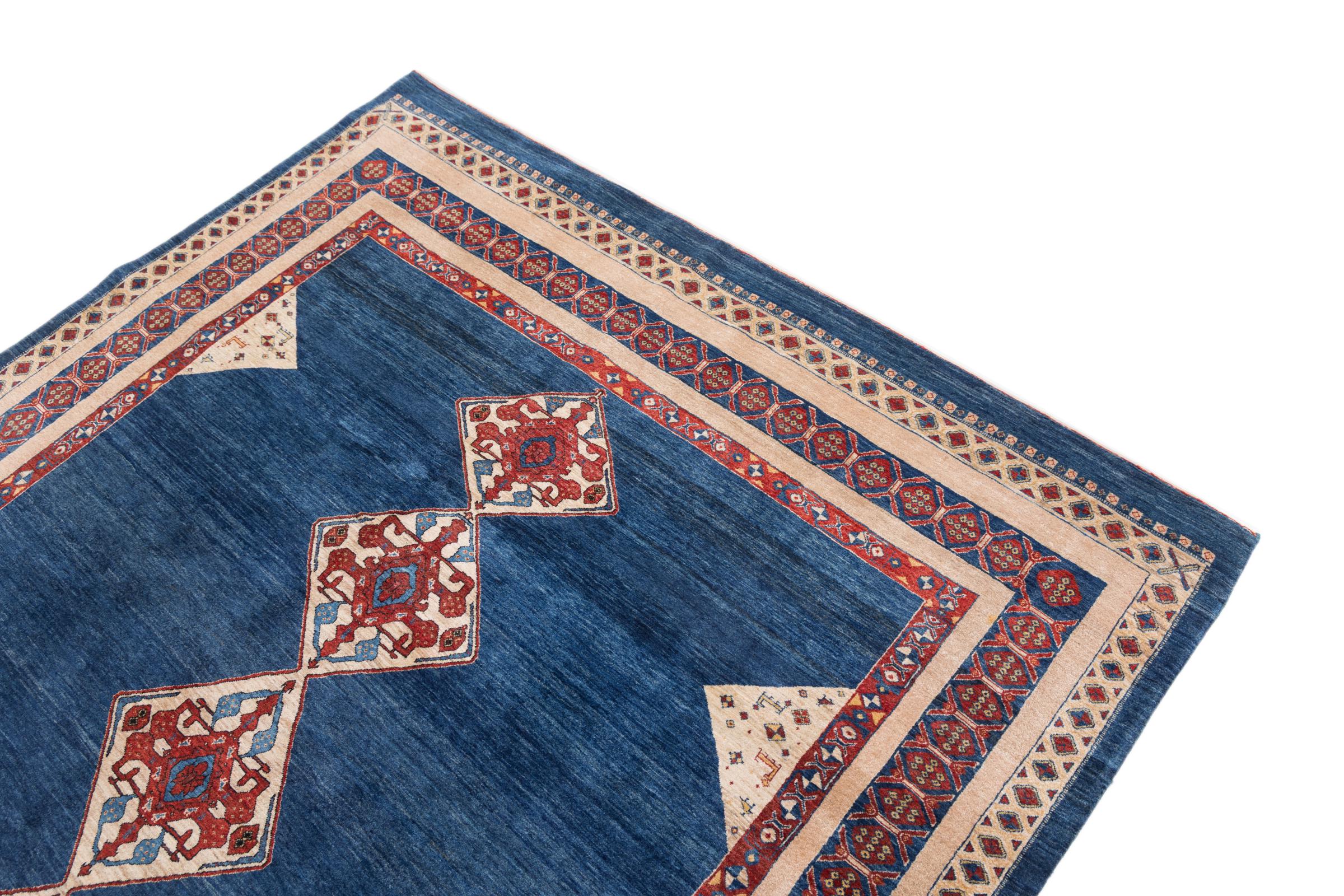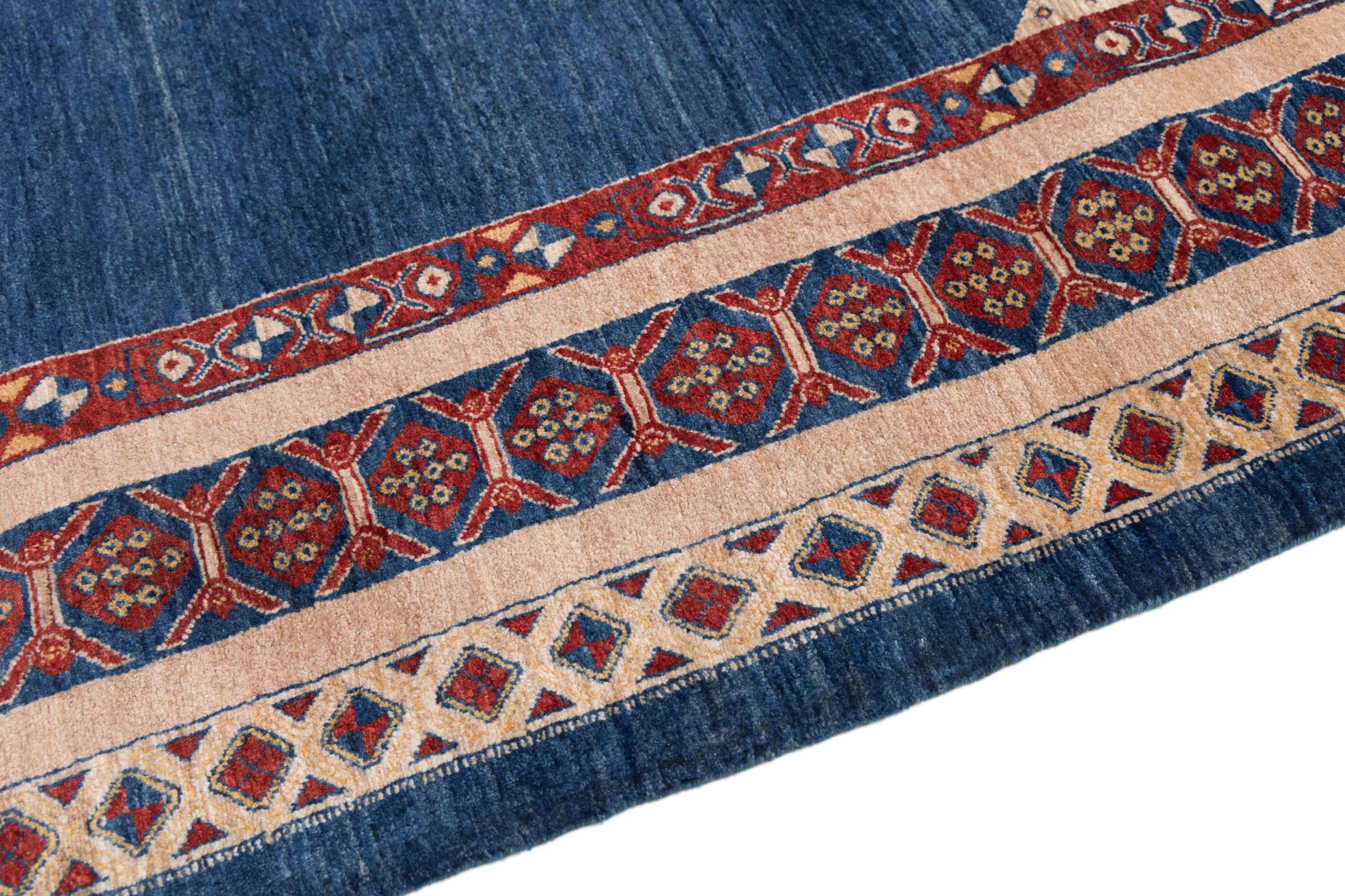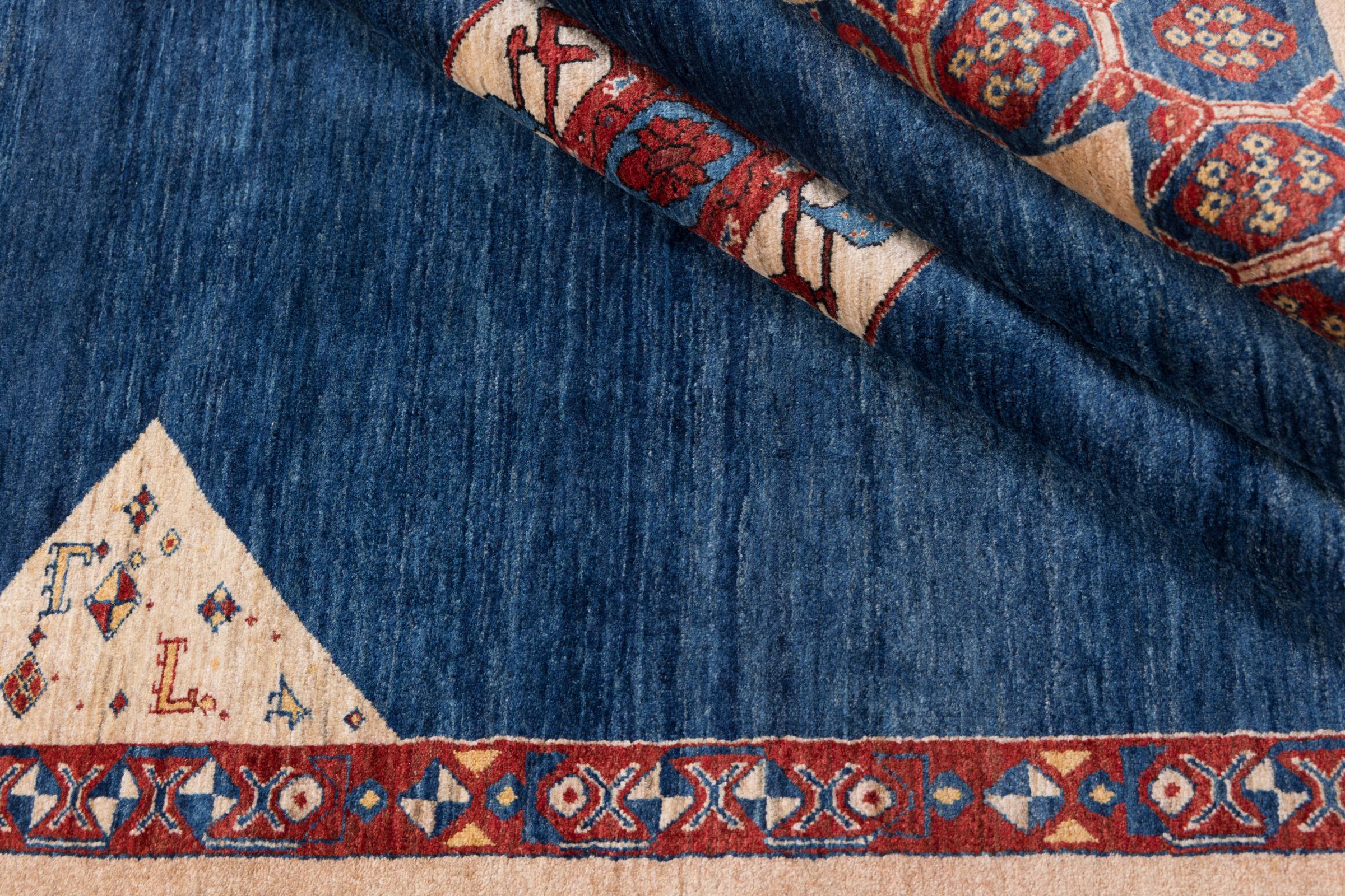 This beautiful rug is a Persian Gabbeh and thus belongs to the highest quality Gabbeh rugs. The rugs are knotted by nomads or semi-nomads in Iran following traditional handicraft. The simple motifs and patterns are mostly inspired by the nomads' close environment. For example camels, trees or bushes can be found on the traditional rugs. Persian Gabbeh rugs are made of wool from locally raised flocks of sheep. The wool is therefore mostly still spun by hand. Thus each of these oriental rugs embodies a unique character of centuries-old culture.