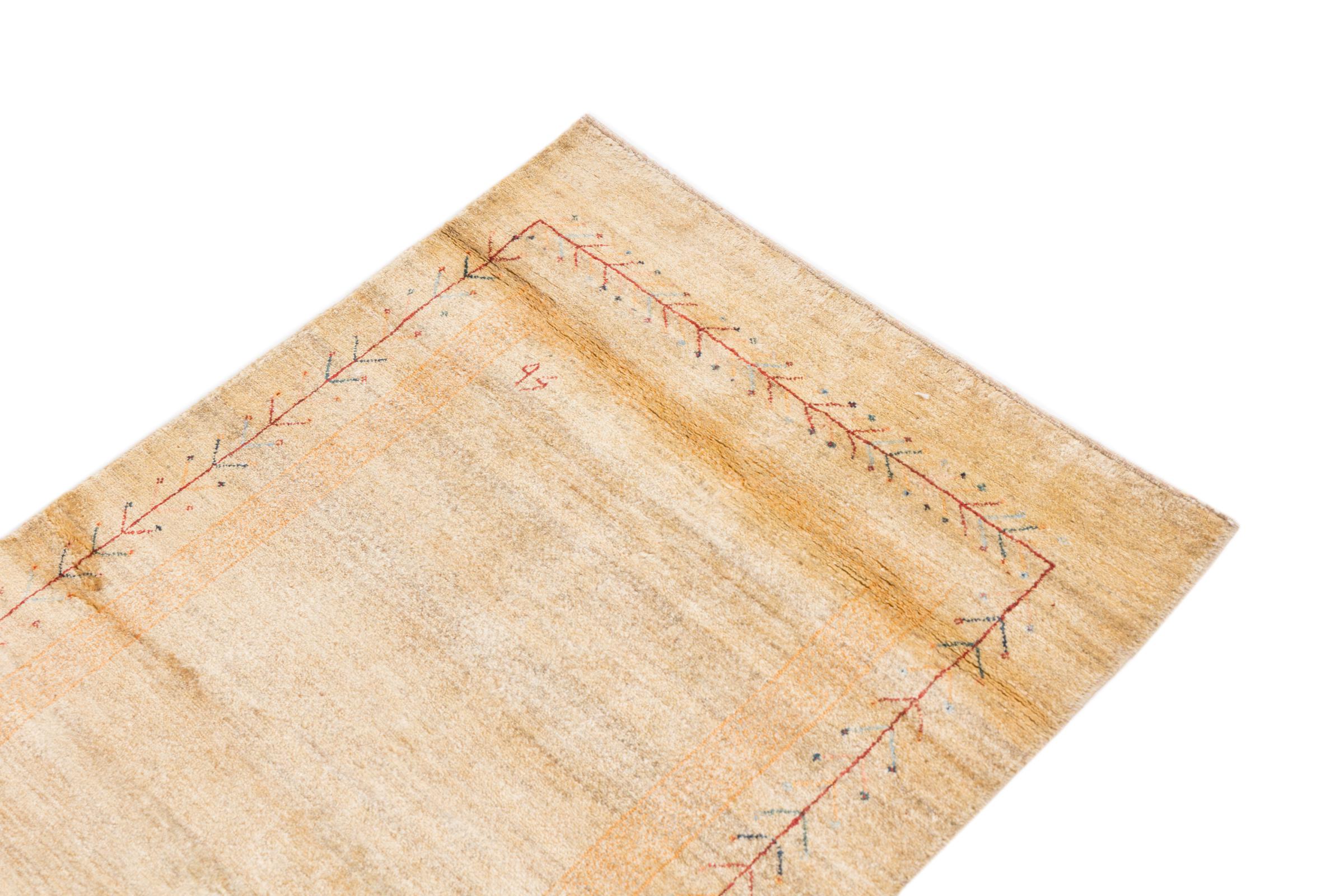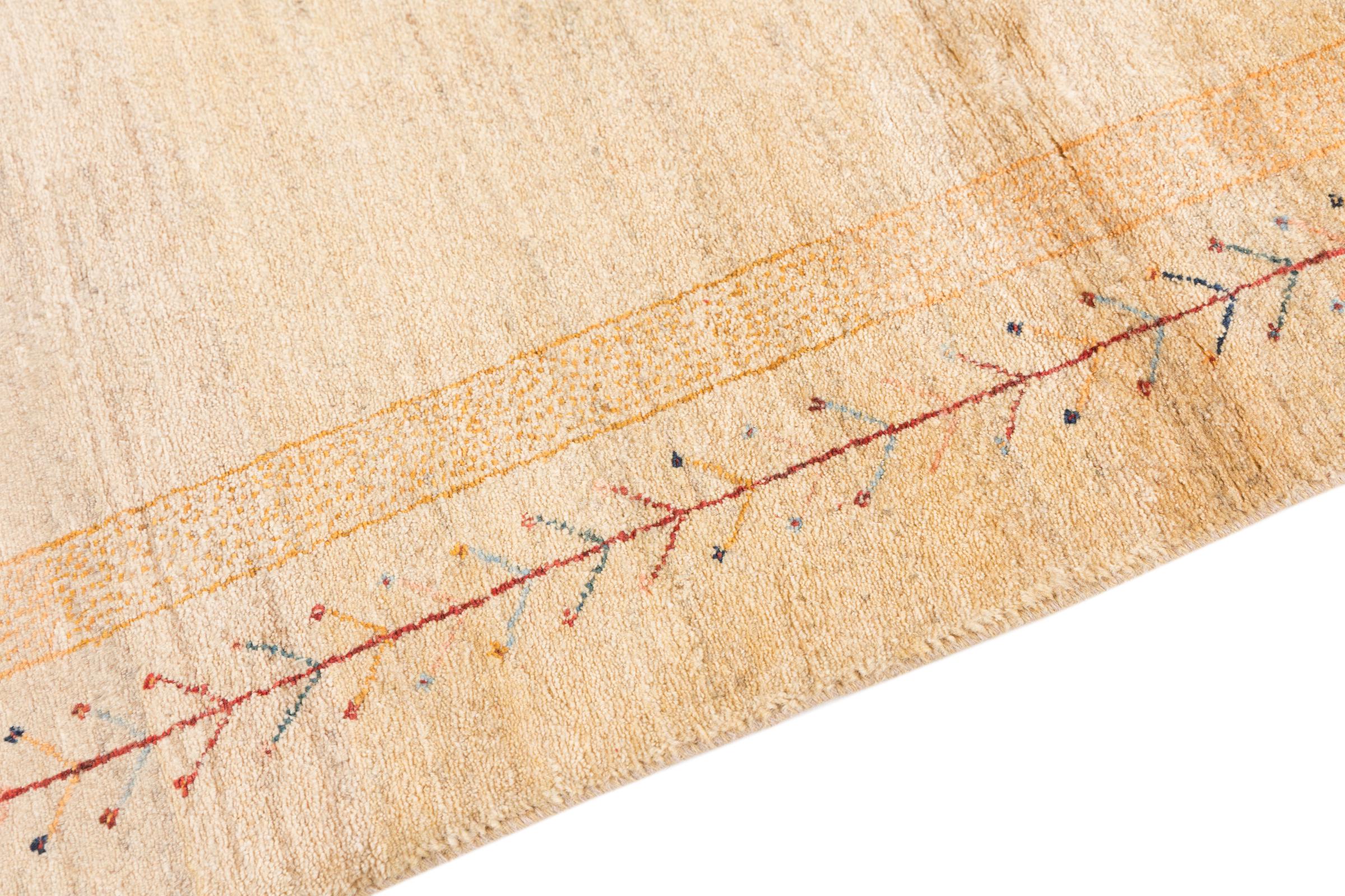This beautiful rug is a Persian Gabbeh and thus belongs to the highest quality Gabbeh rugs. The rugs are knotted by nomads or semi-nomads in Iran following traditional handicraft. The simple motifs and patterns are mostly inspired by the nomads' close environment. For example camels, trees or bushes can be found on the traditional rugs. Persian Gabbeh rugs are made of wool from locally raised flocks of sheep. The wool is therefore mostly still spun by hand. Thus each of these oriental rugs embodies a unique character of centuries-old culture.