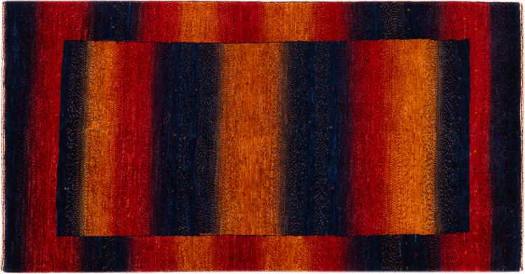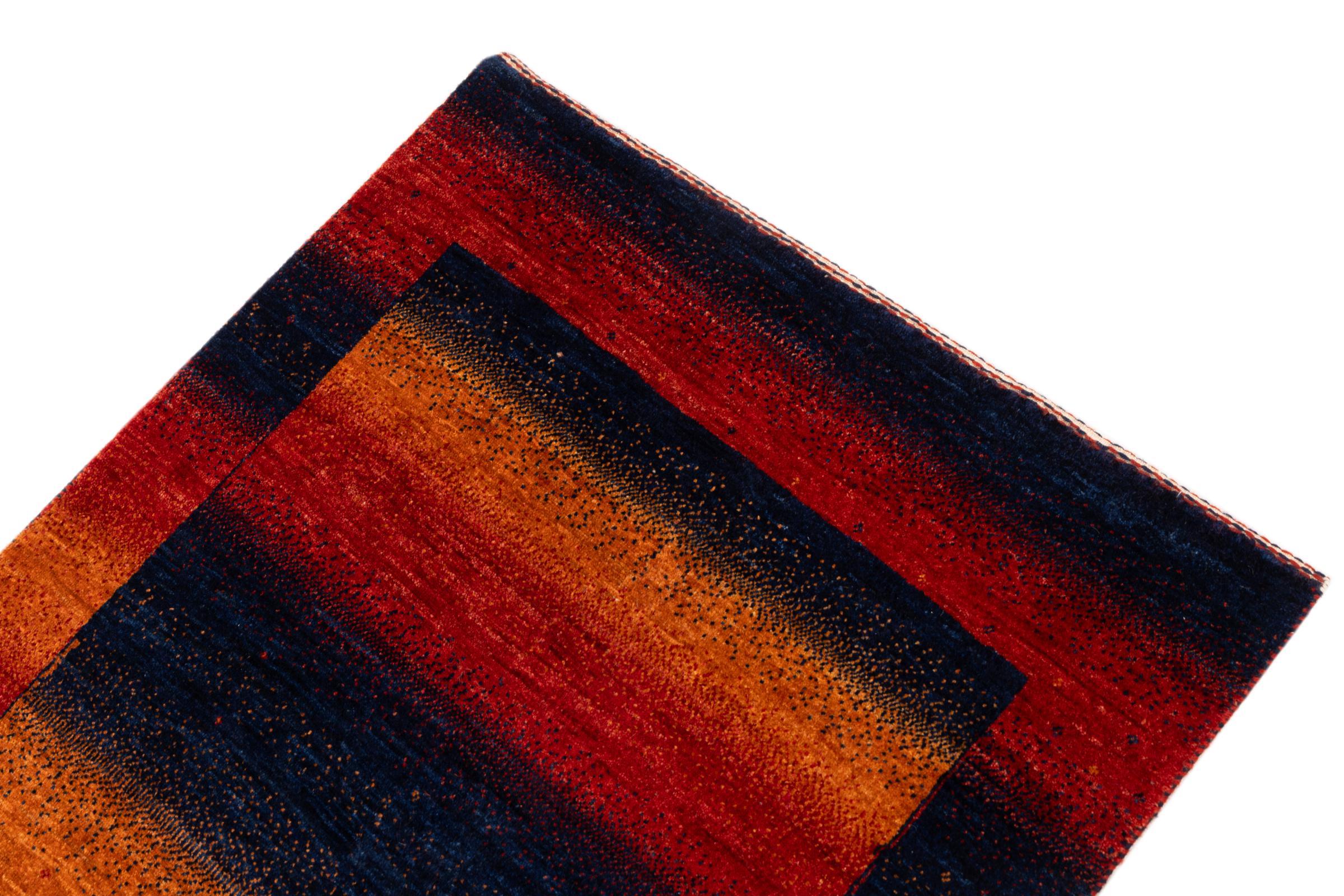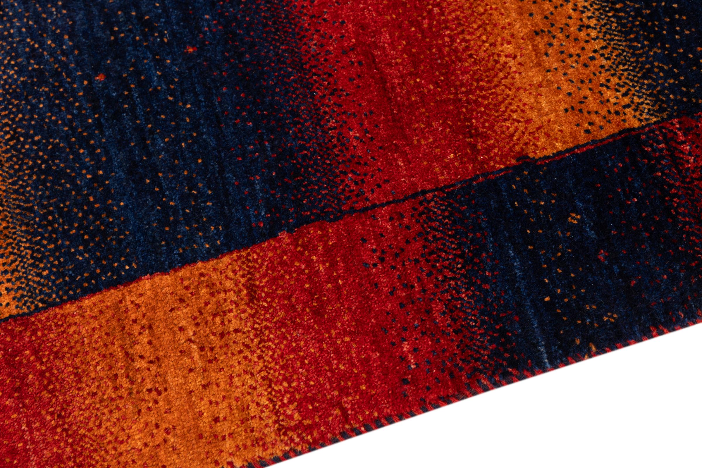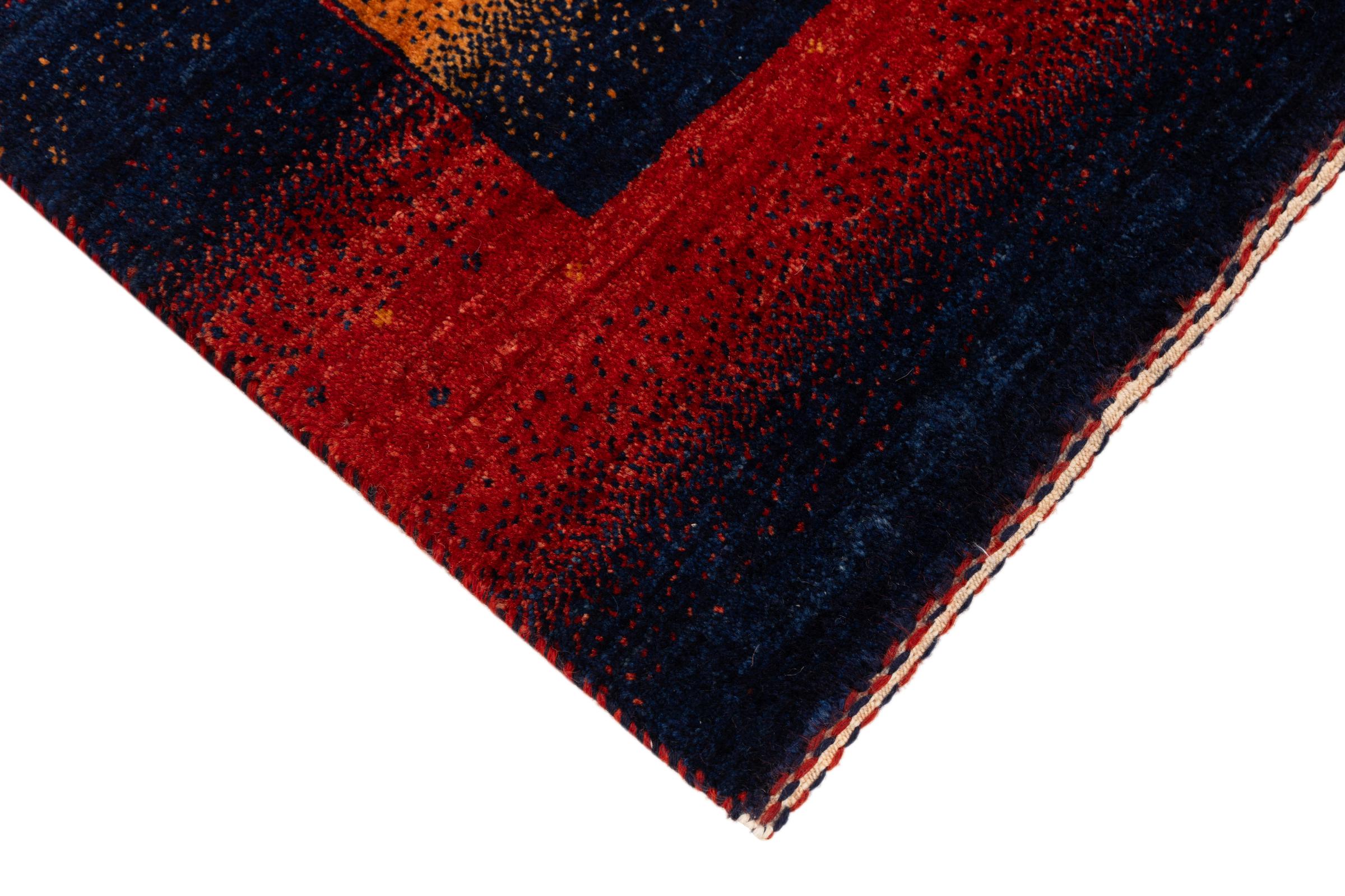 This beautiful rug is a Persian Gabbeh and thus belongs to the highest quality Gabbeh rugs. The rugs are knotted by nomads or semi-nomads in Iran following traditional handicraft. The simple motifs and patterns are mostly inspired by the nomads' close environment. For example camels, trees or bushes can be found on the traditional rugs. Persian Gabbeh rugs are made of wool from locally raised flocks of sheep. The wool is therefore mostly still spun by hand. Thus each of these oriental rugs embodies a unique character of centuries-old culture.