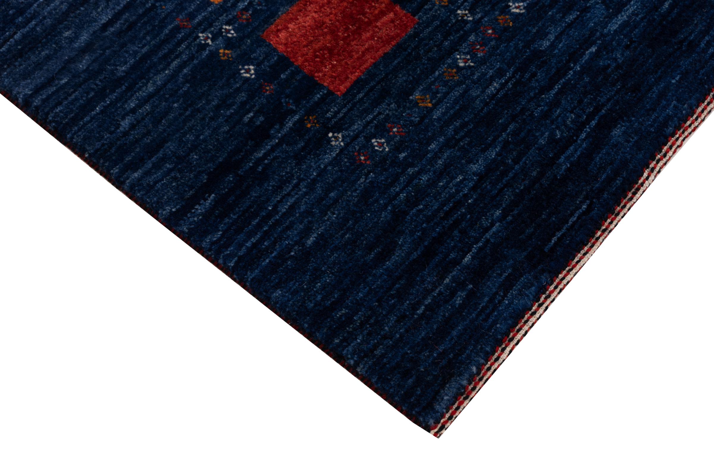 This beautiful rug is a Persian Gabbeh and thus belongs to the highest quality Gabbeh rugs. The rugs are knotted by nomads or semi-nomads in Iran following traditional handicraft. The simple motifs and patterns are mostly inspired by the nomads' close environment. For example camels, trees or bushes can be found on the traditional rugs. Persian Gabbeh rugs are made of wool from locally raised flocks of sheep. The wool is therefore mostly still spun by hand. Thus each of these oriental rugs embodies a unique character of centuries-old culture.