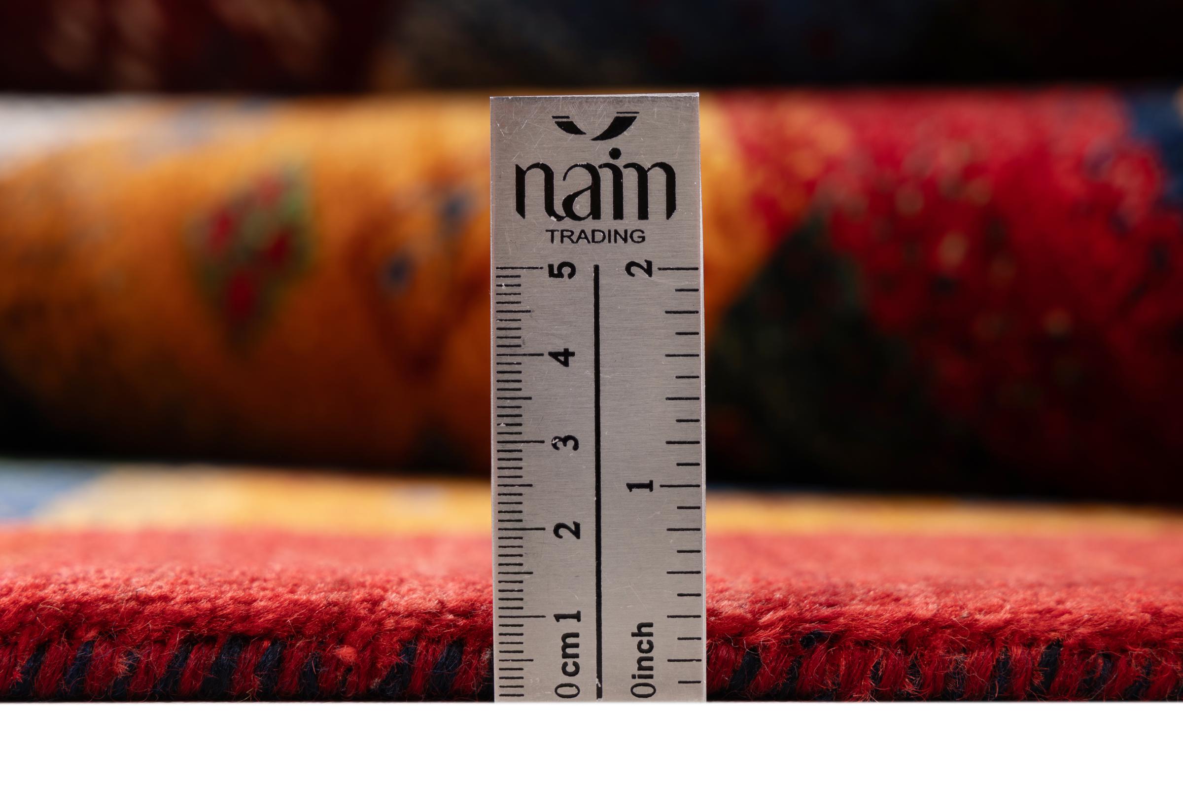 This beautiful rug is a Persian Gabbeh and thus belongs to the highest quality Gabbeh rugs. The rugs are knotted by nomads or semi-nomads in Iran following traditional handicraft. The simple motifs and patterns are mostly inspired by the nomads' close environment. For example camels, trees or bushes can be found on the traditional rugs. Persian Gabbeh rugs are made of wool from locally raised flocks of sheep. The wool is therefore mostly still spun by hand. Thus each of these oriental rugs embodies a unique character of centuries-old culture.