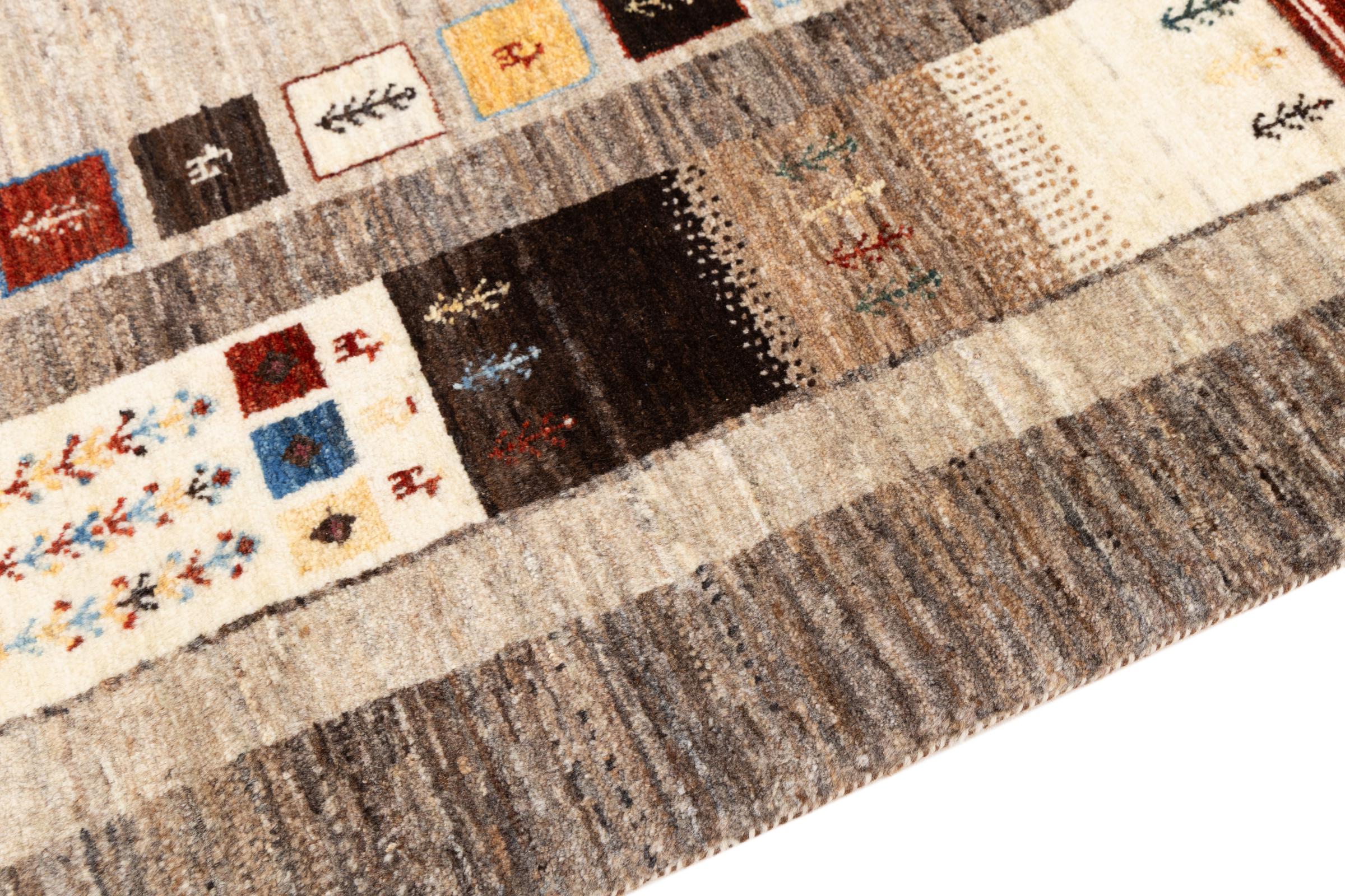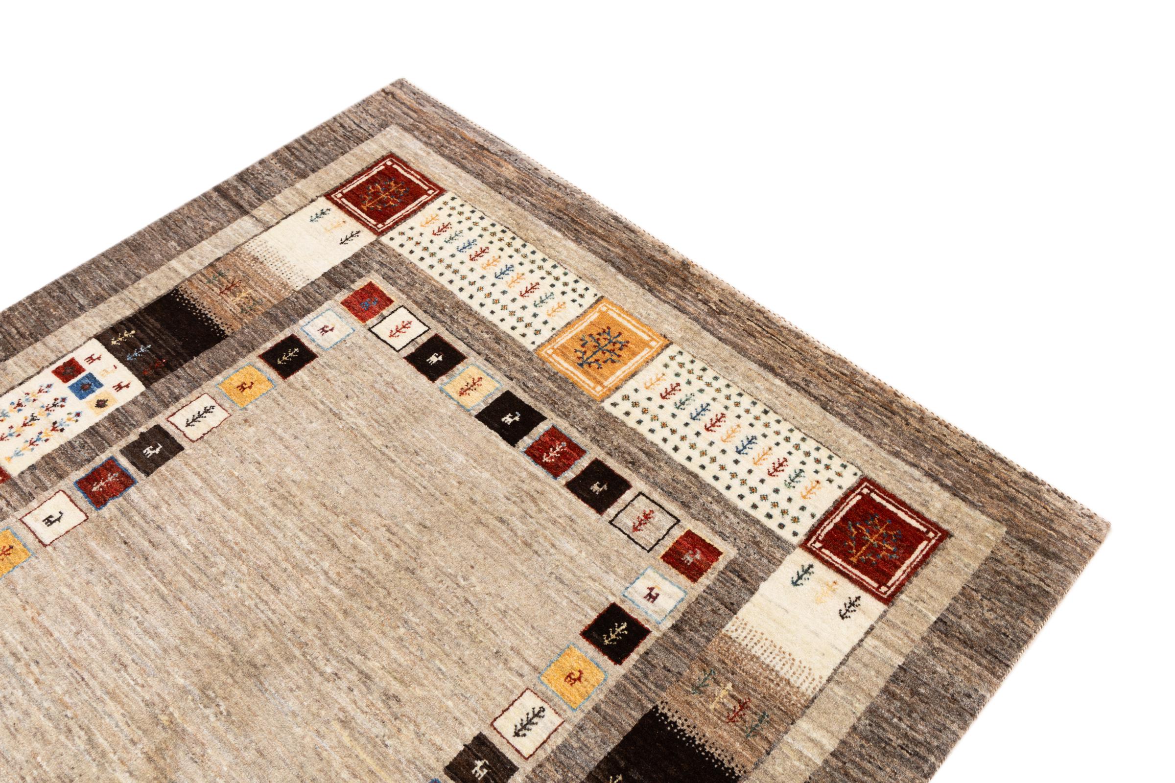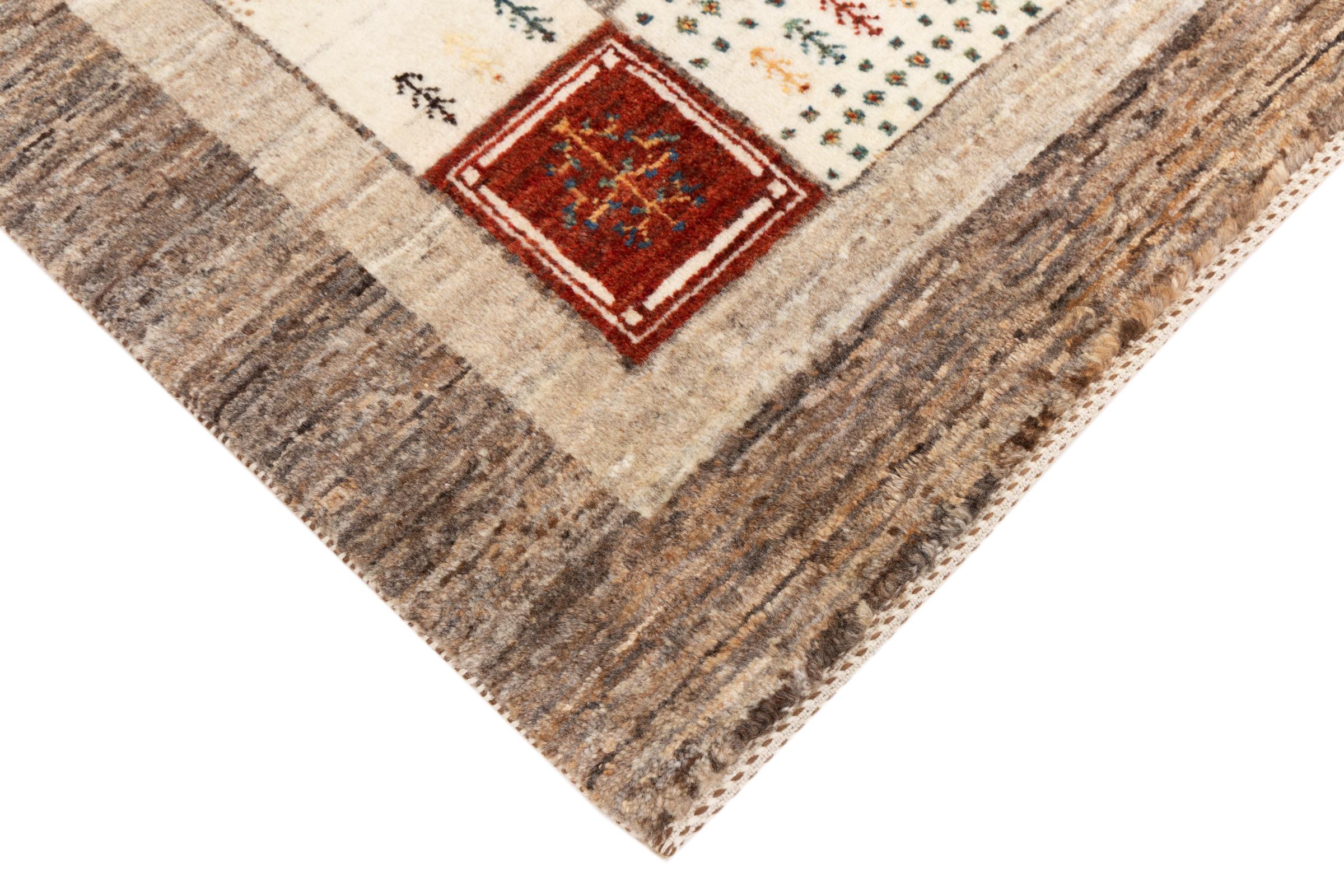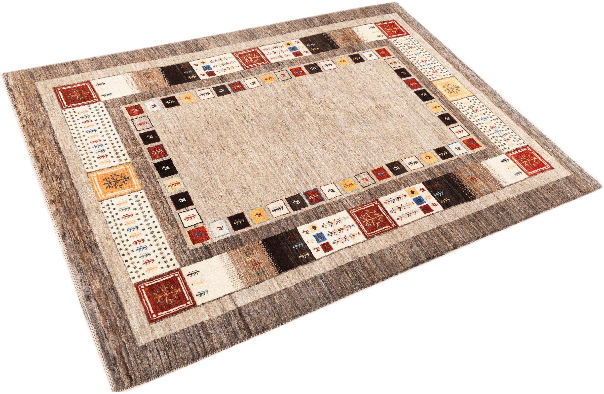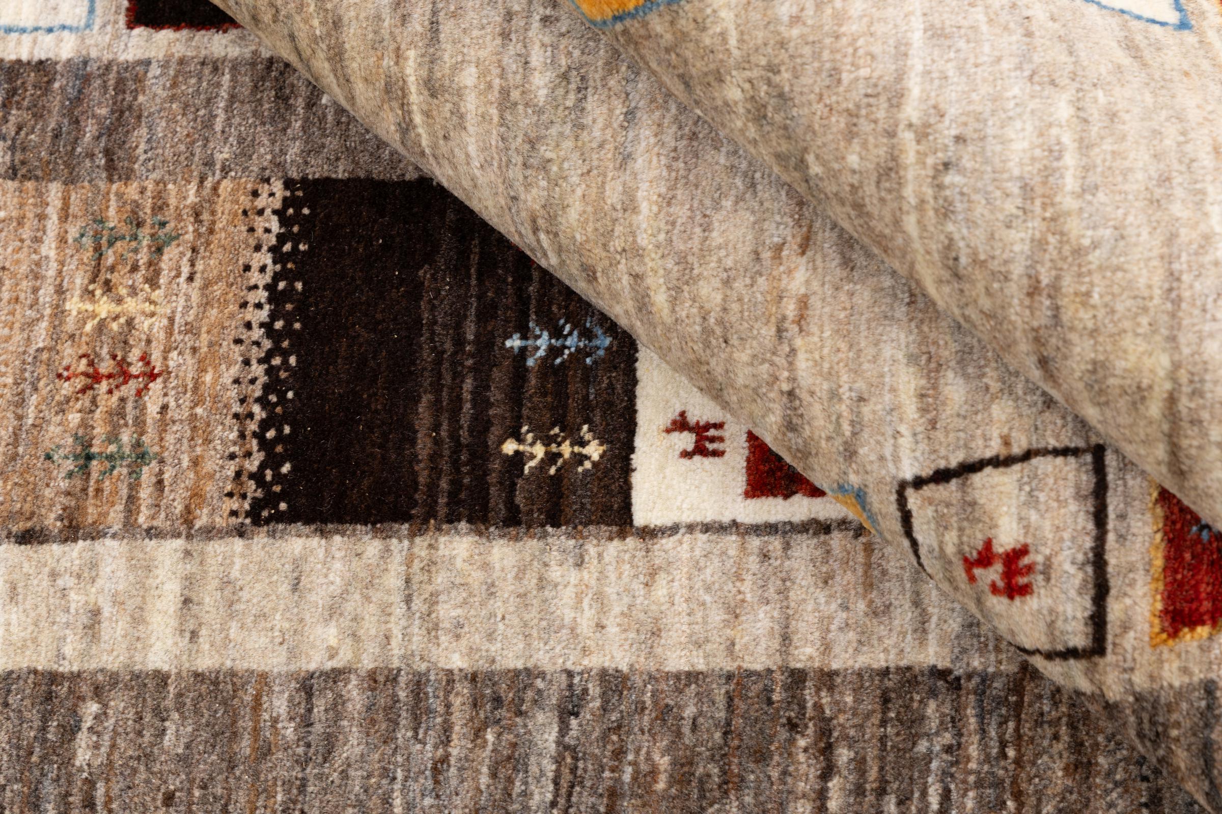 This beautiful rug is a Persian Gabbeh and thus belongs to the highest quality Gabbeh rugs. The rugs are knotted by nomads or semi-nomads in Iran following traditional handicraft. The simple motifs and patterns are mostly inspired by the nomads' close environment. For example camels, trees or bushes can be found on the traditional rugs. Persian Gabbeh rugs are made of wool from locally raised flocks of sheep. The wool is therefore mostly still spun by hand. Thus each of these oriental rugs embodies a unique character of centuries-old culture.