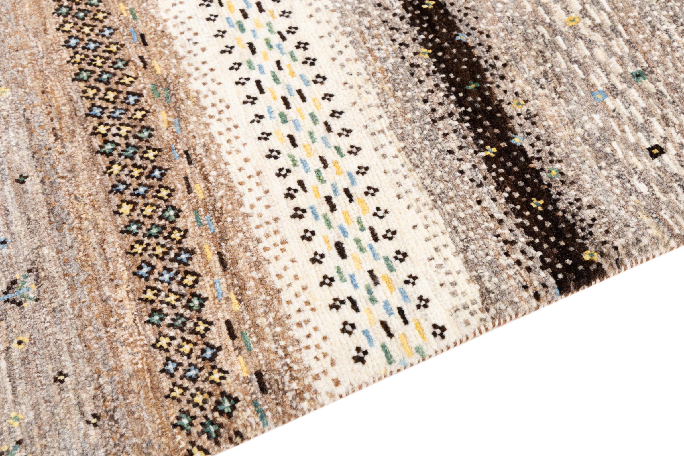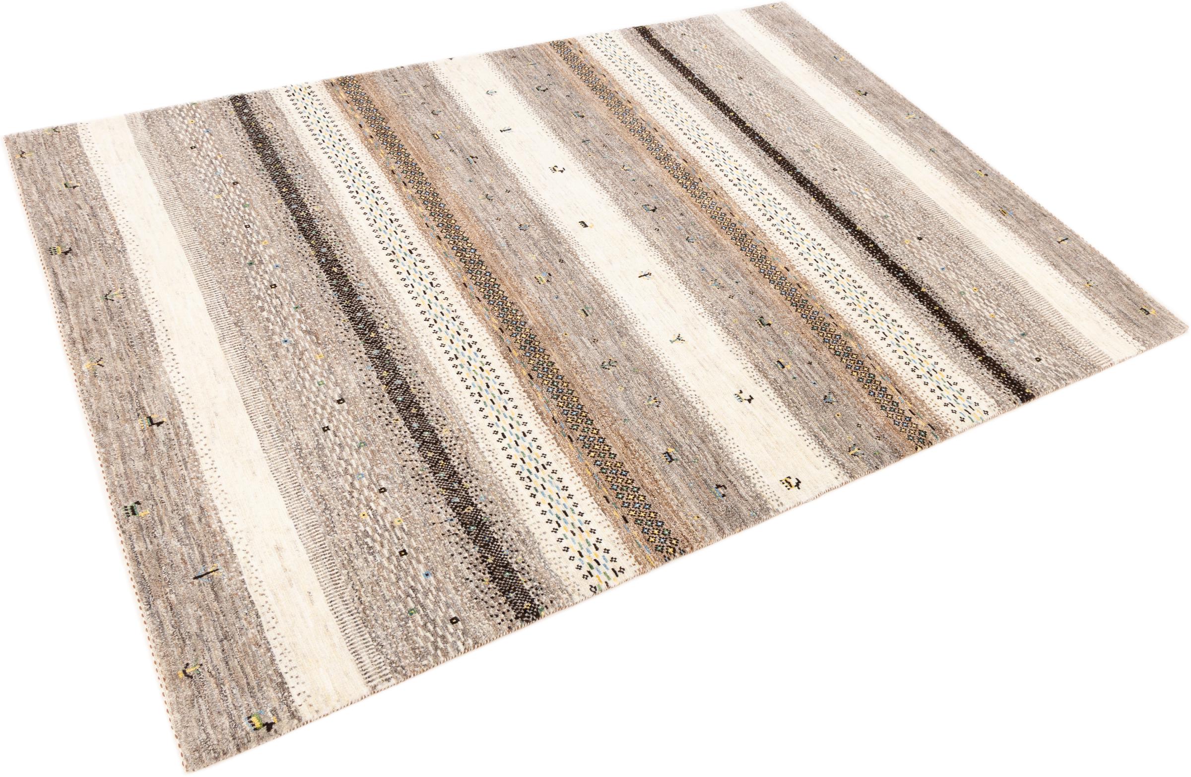This beautiful rug is a Persian Gabbeh and thus belongs to the highest quality Gabbeh rugs. The rugs are knotted by nomads or semi-nomads in Iran following traditional handicraft. The simple motifs and patterns are mostly inspired by the nomads' close environment. For example camels, trees or bushes can be found on the traditional rugs. Persian Gabbeh rugs are made of wool from locally raised flocks of sheep. The wool is therefore mostly still spun by hand. Thus each of these oriental rugs embodies a unique character of centuries-old culture.