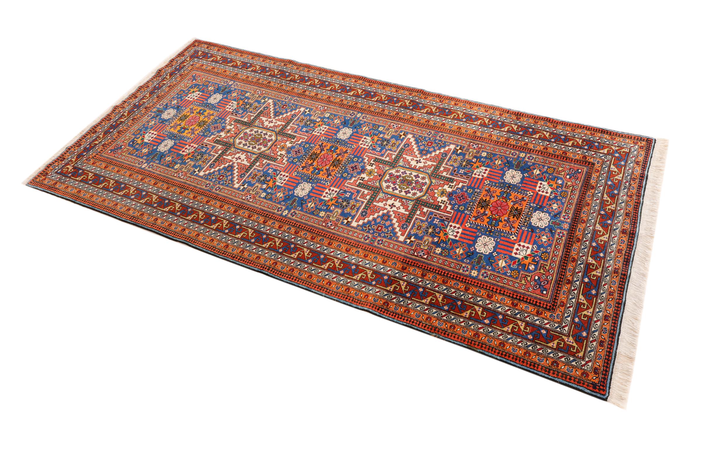 Carpet ID: 204073002580164 Size: 229x105 cm Thickness: ap. 5 mm Knot density: 200 000 - 250 000 / m² Manufacturing: Knotted by hand Pile: Handspun wool Warp: Cotton Origin: Azerbaijan / Russia Age: New Weight: ap. 5 kg In stock: Unique - Only 1 in stock