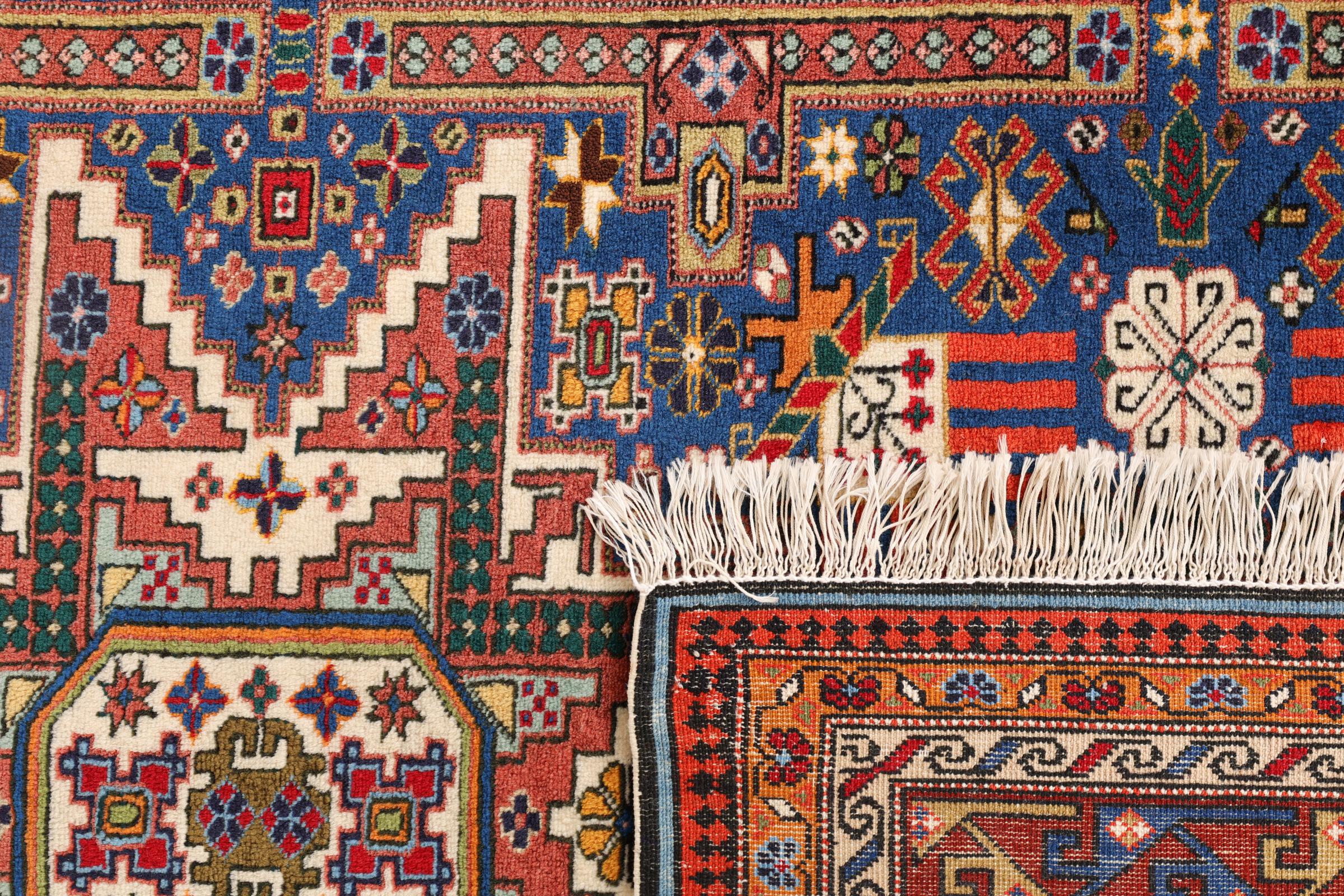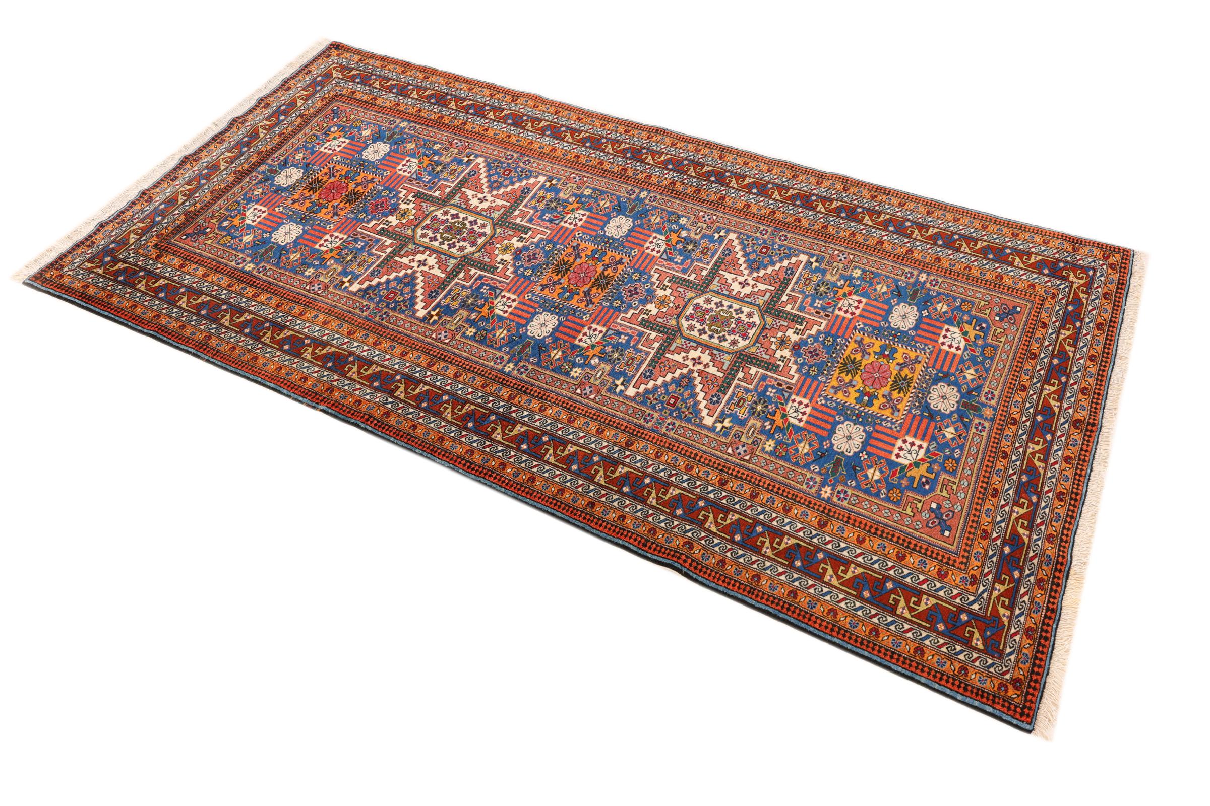 This rug comes from Russia and was knotted by hand using traditional methods. High-quality wool from locally reared sheep was used. The rug features typical Russian patterns and ornaments reminiscent of the Tsarist era.