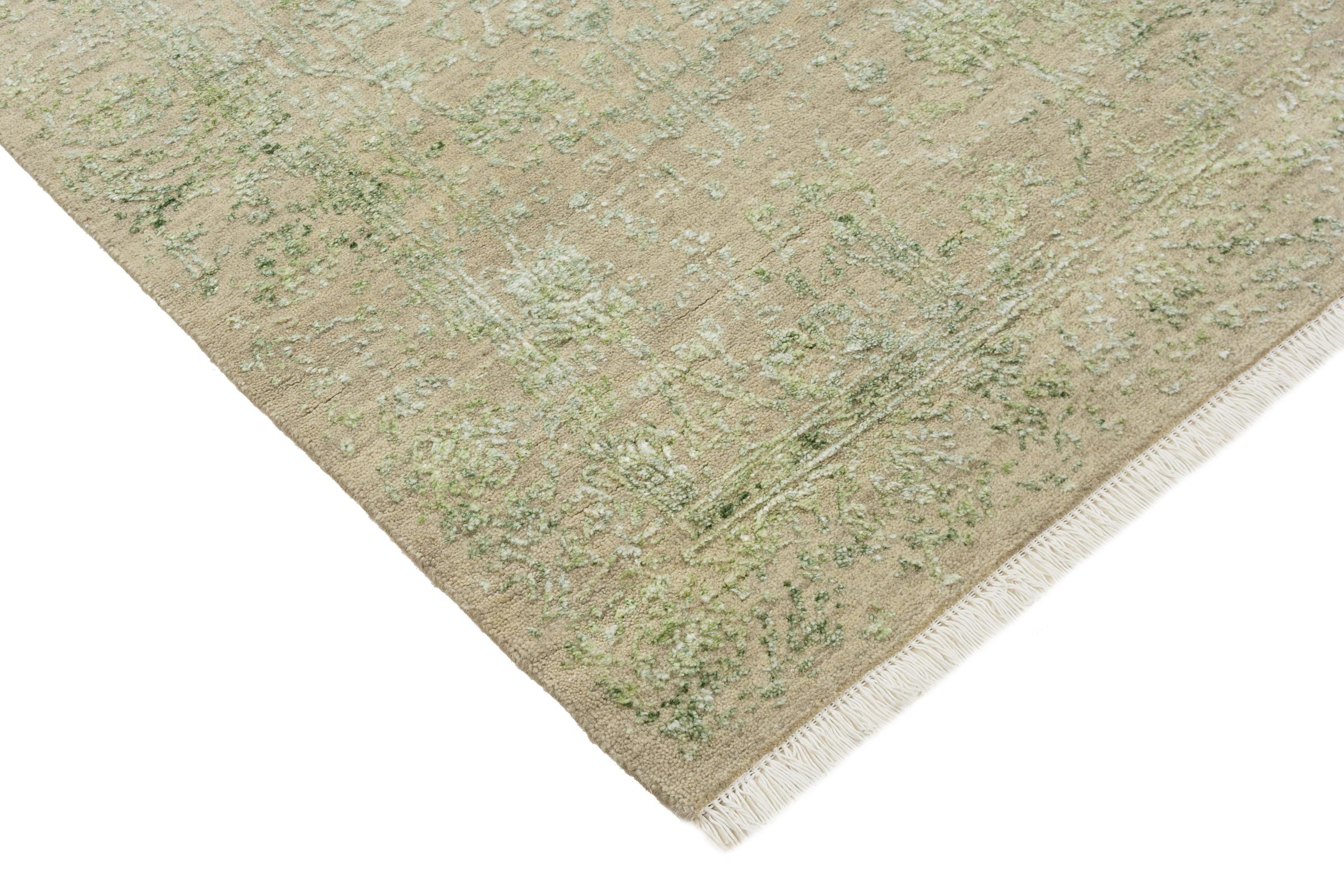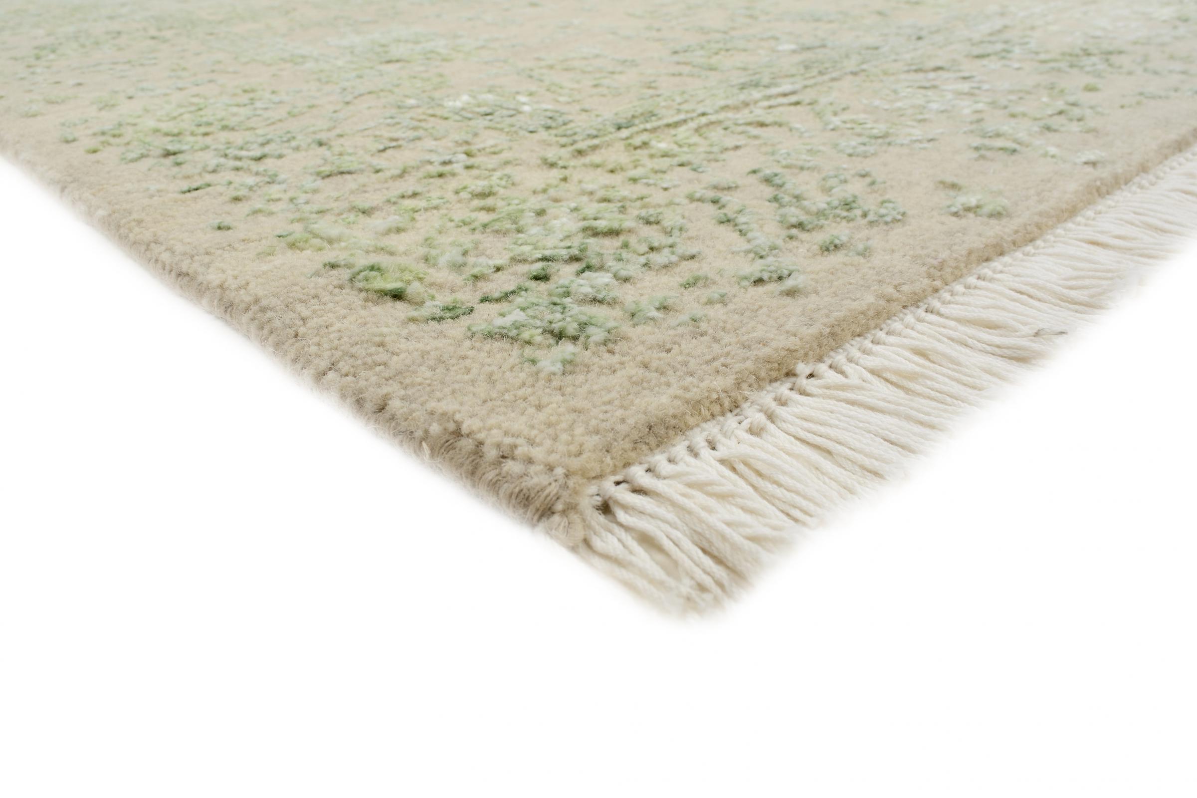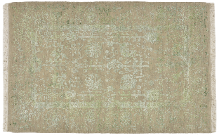 Carpet ID: 126727006799621 Size: 120x79 cm Thickness: ap. 12 mm Knot density: 200 000 - 250 000 / m² Manufacturing: Knotted by hand Pile: Wool with bamboo-silk Warp: Cotton Origin: India Age: New Weight: ap. 4 kg In stock: Unique - Only 1 in stock