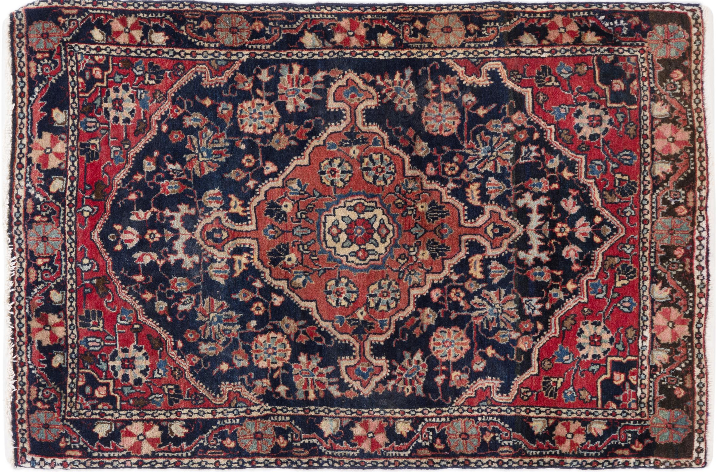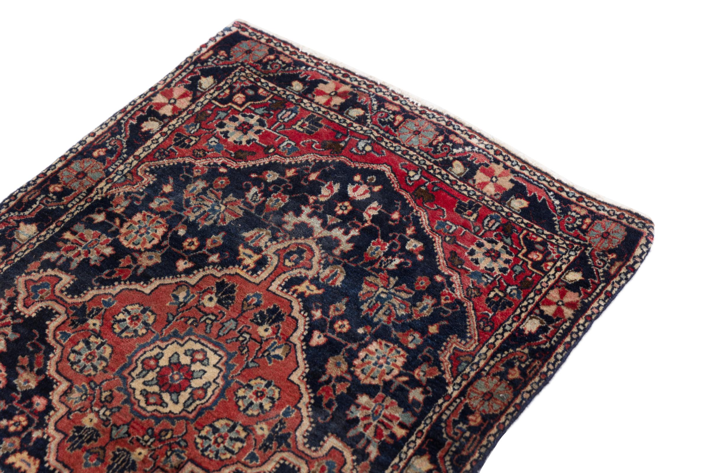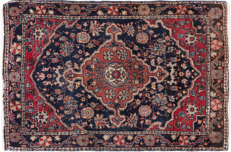 Carpet ID: 296246004450 Size: 95x63 cm Thickness: ap. 10 mm Knot density: 128 000 - 160 000 / m² Manufacturing: Knotted by hand Pile: Handspun wool Warp: Cotton Origin: Persia Age: Old/Semi antique, over 50 years Weight: ap. 2 kg In stock: Unique - Only 1 in stock