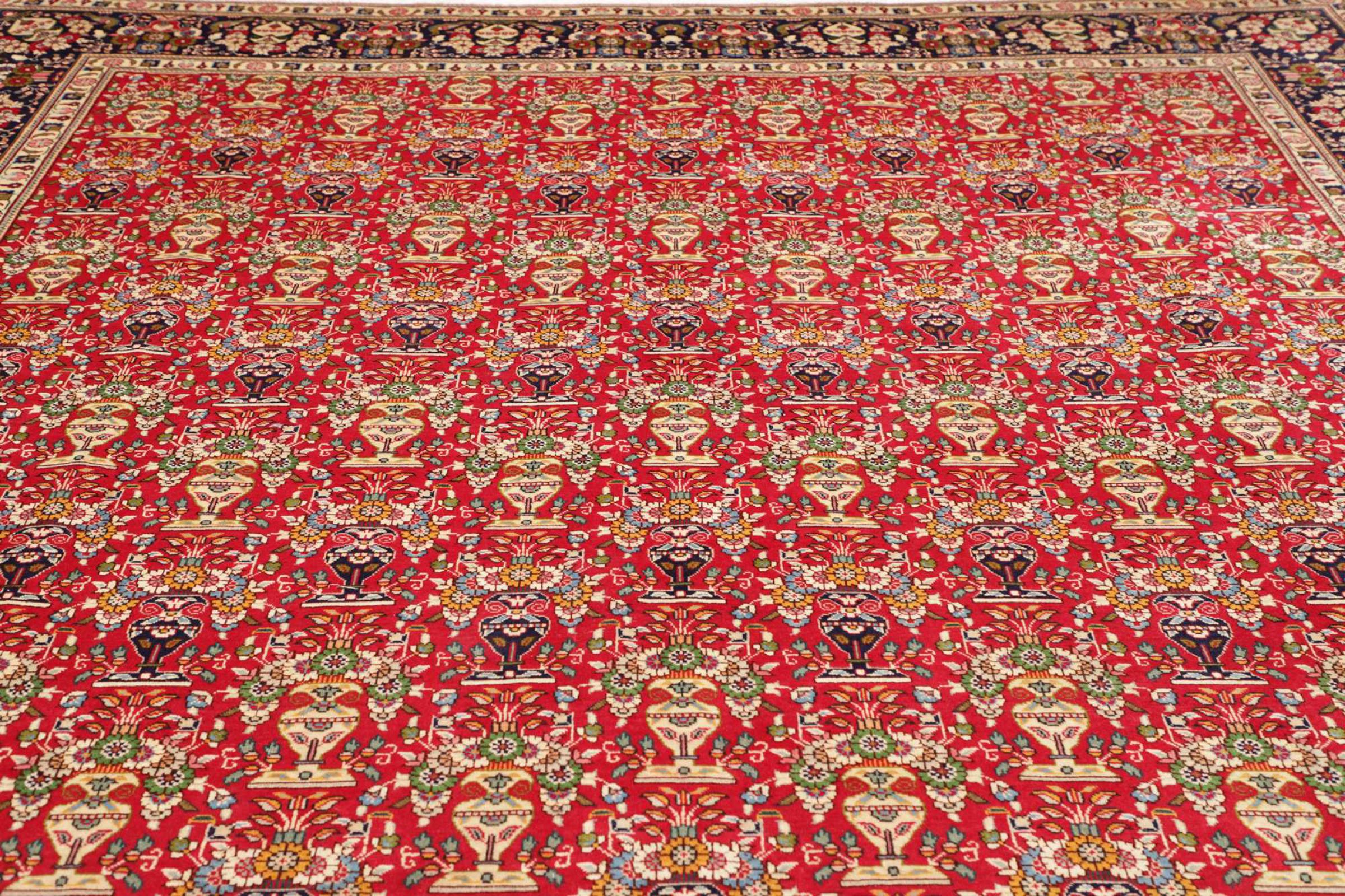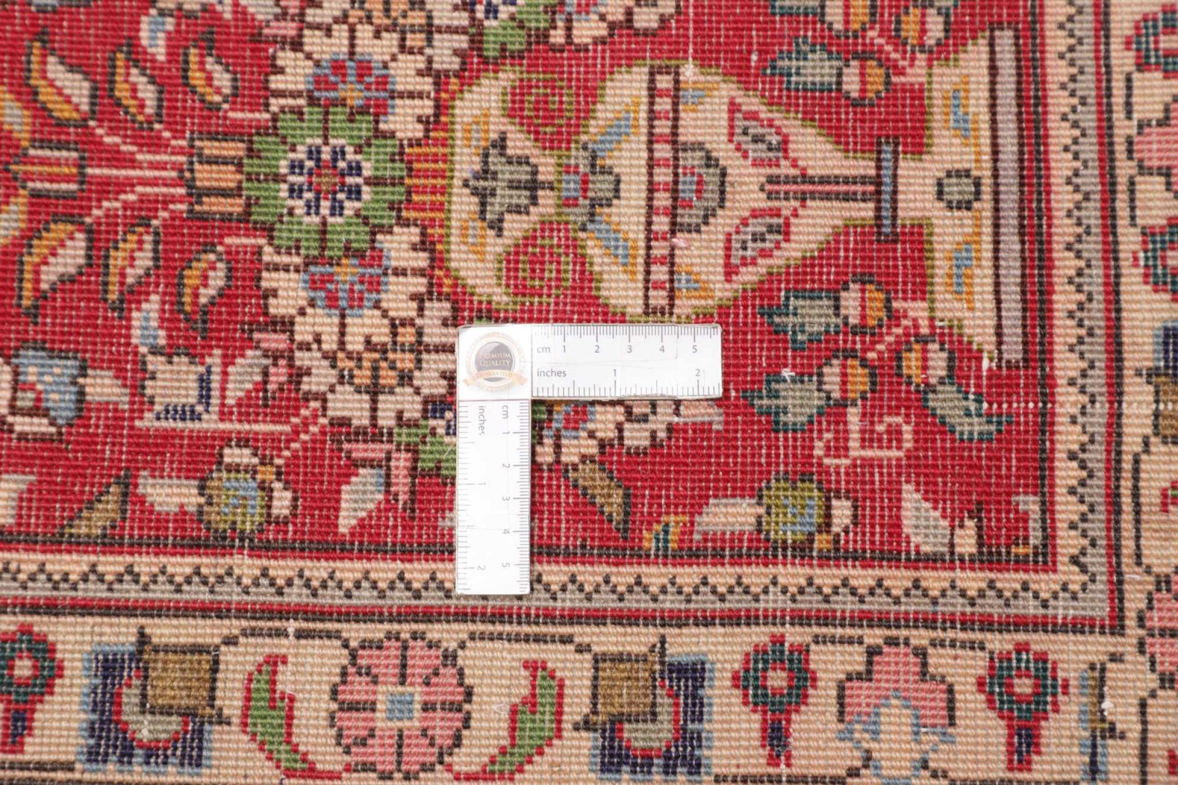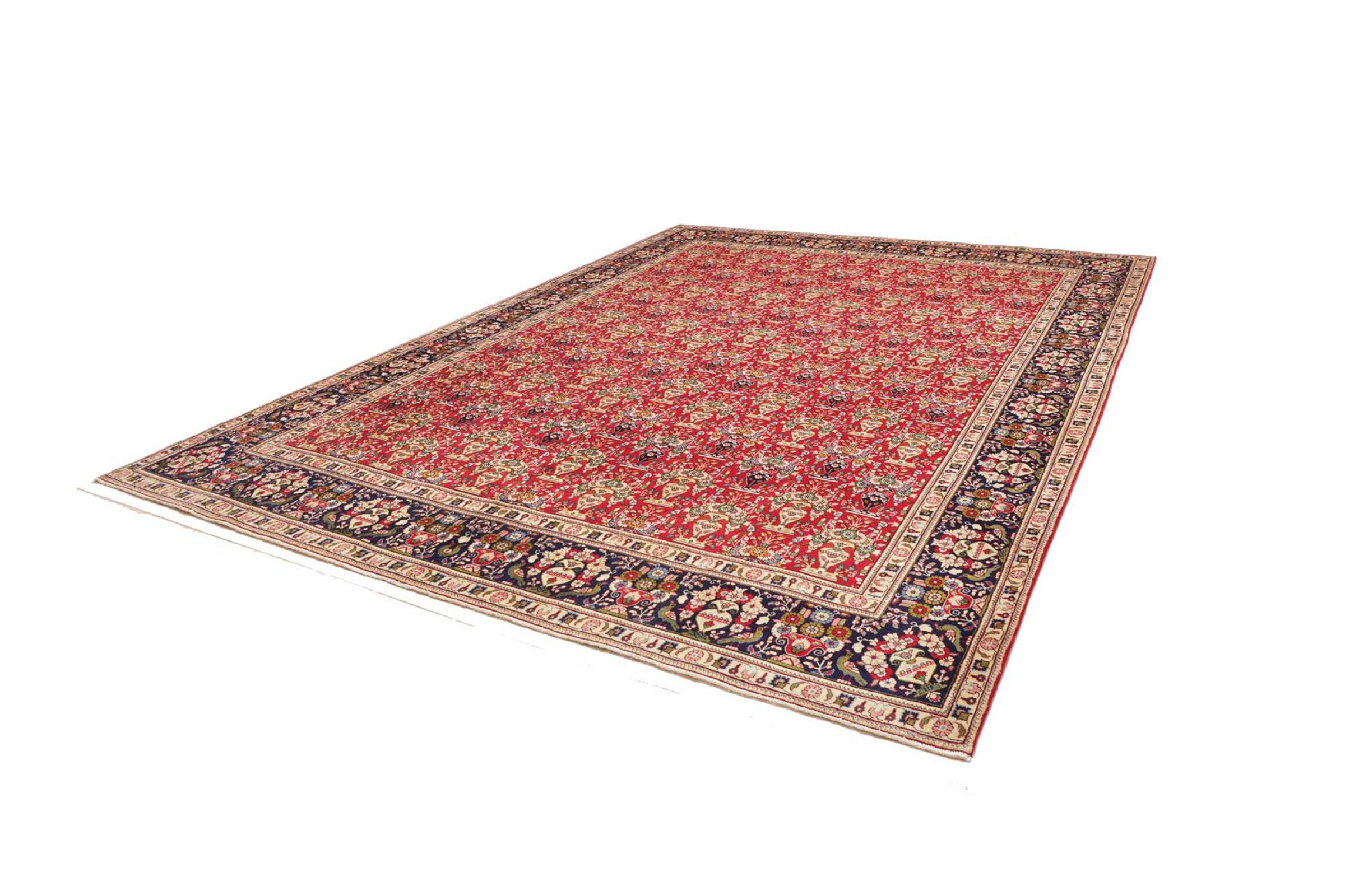 Carpet ID: 306267001460661 Size: 386x302 cm Thickness: ap. 10 mm Knot density: 128 000 - 160 000 / m² Manufacturing: Knotted by hand Pile: Handspun wool Warp: Cotton Origin: Persia Age: New Weight: ap. 41 kg Also know as Tabris, Tabriz, Tebris, Tebriz, Täbris, Village In stock: Unique - Only 1 in stock
