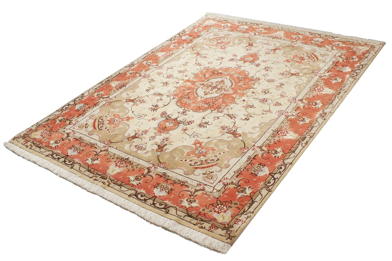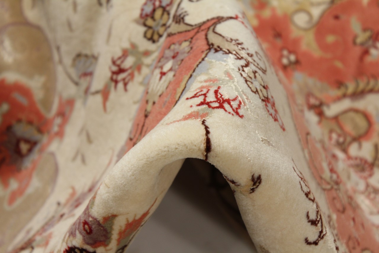 Carpet ID: 76380029156 Size: 210x152 cm Thickness: ap. 7 mm Knot density: 450 000 - 500 000 / m² Manufacturing: Knotted by hand Pile: Wool with silk Warp: Cotton Origin: Persia Age: New Weight: ap. 10 kg Also know as Tabriz, Tabris, Täbris, Tebriz, Tebris, 40Raj, 50Raj In stock: Unique - Only 1 in stock