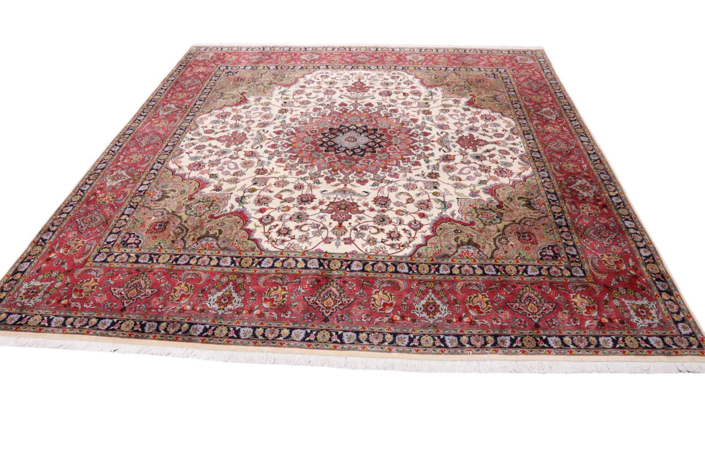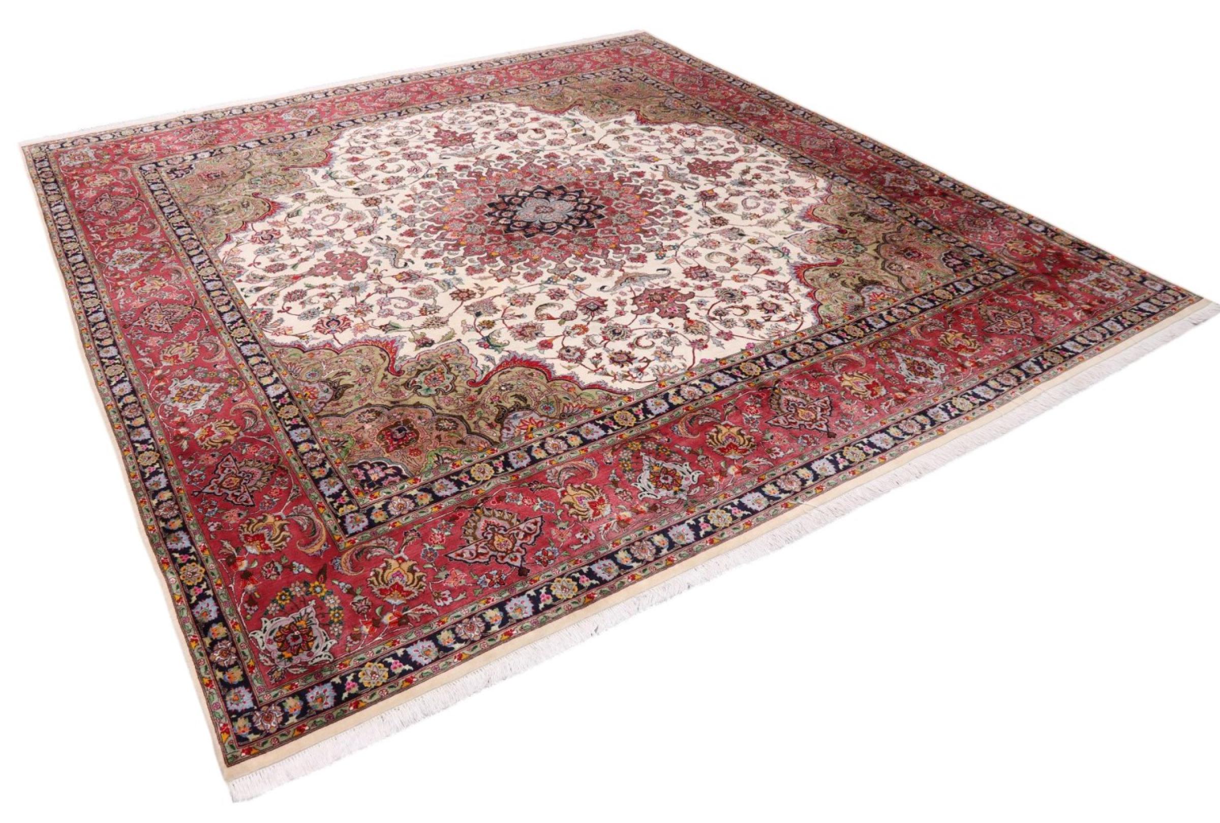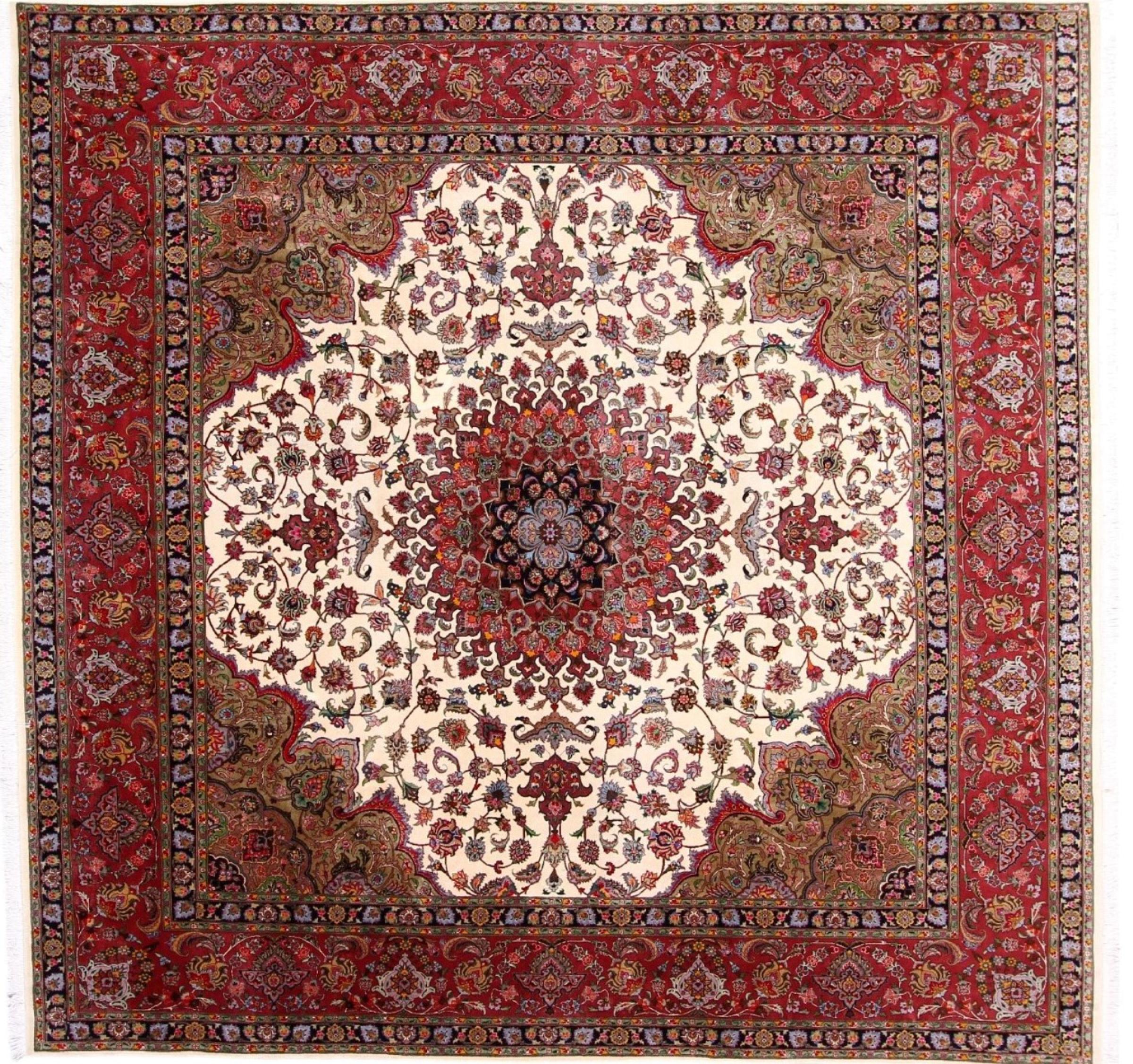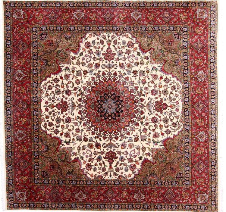 Carpet ID: 291968003364133 Size: 305x301 cm Thickness: ap. 7 mm Knot density: 450 000 - 500 000 / m² Manufacturing: Knotted by hand Pile: Wool with silk Warp: Cotton Origin: Persia Age: New Weight: ap. 28 kg Also know as Tabriz, Tabris, Täbris, Tebriz, Tebris, 40Raj, 50Raj In stock: Unique - Only 1 in stock