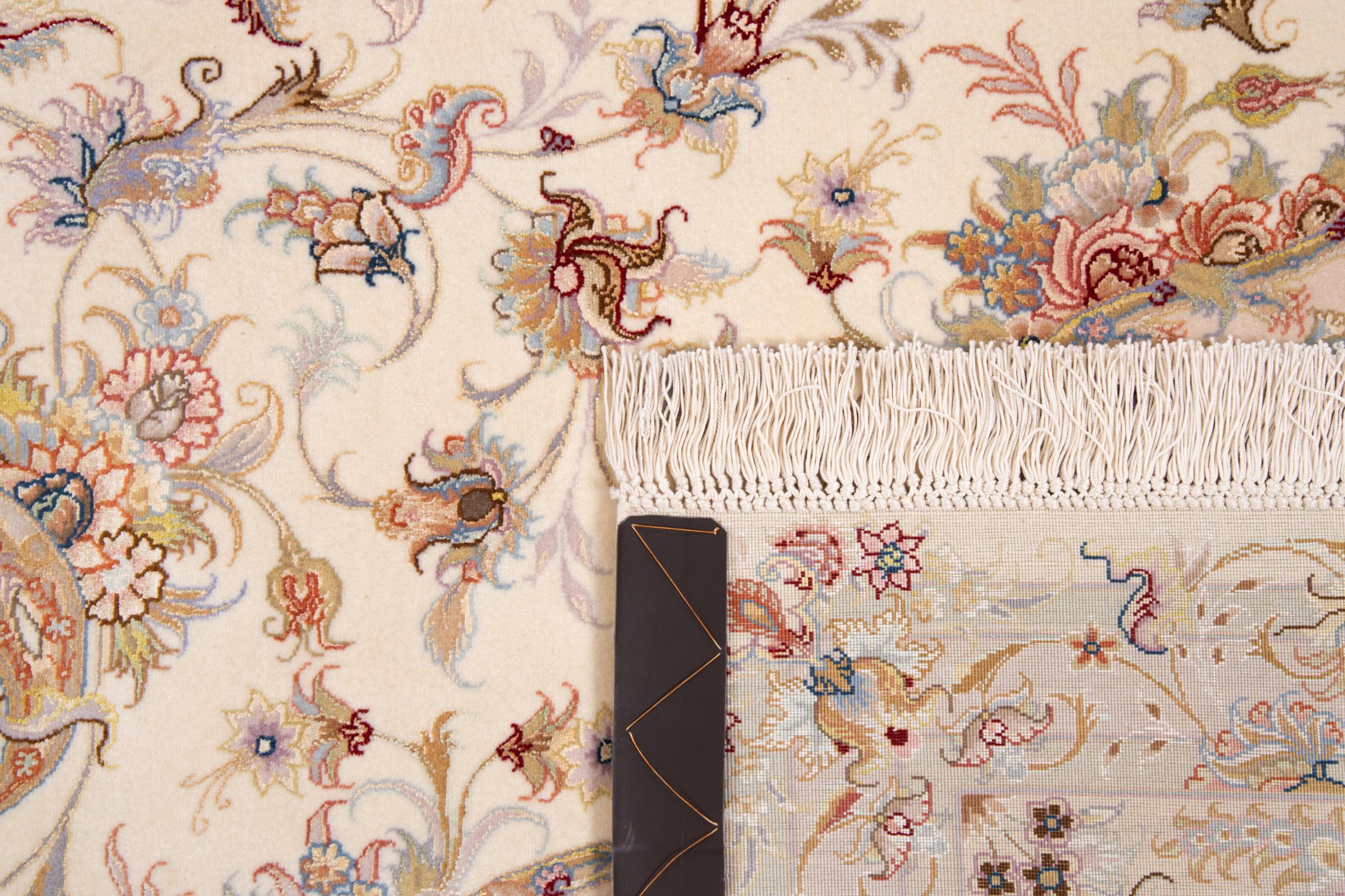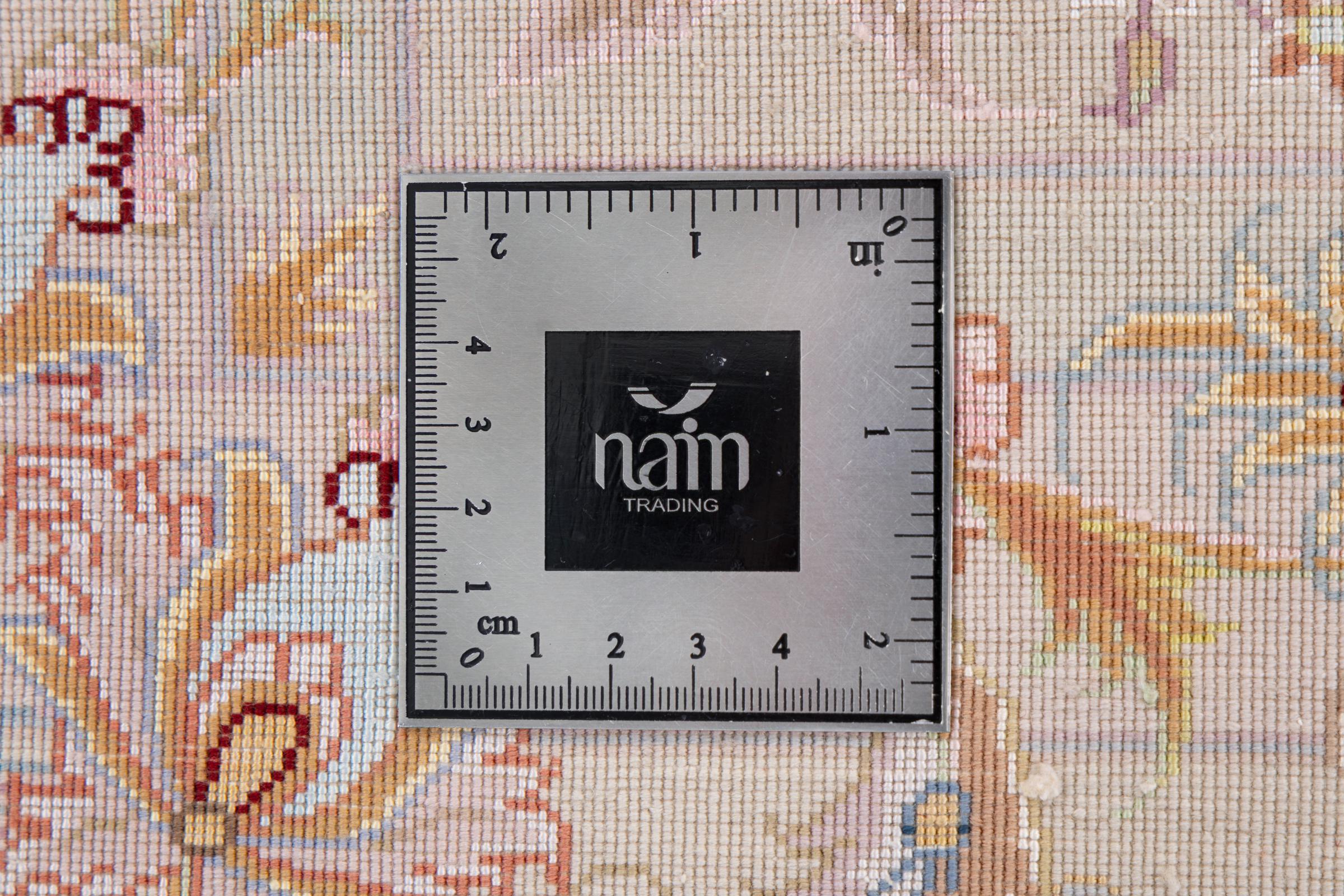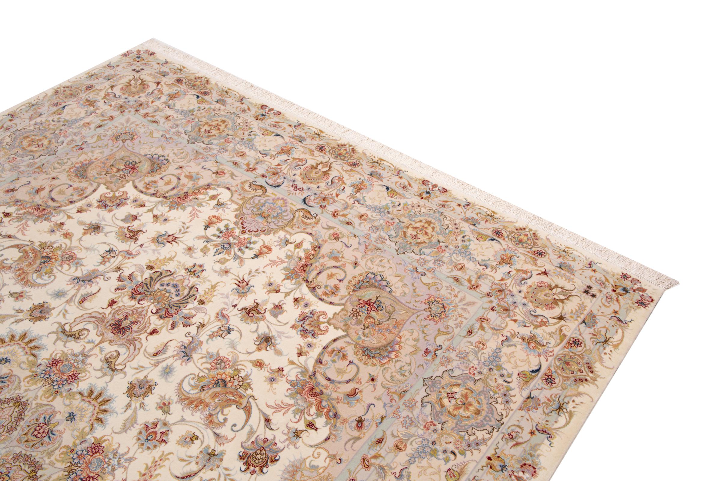 Carpet ID: 293823008126275 Size: 347x245 cm Thickness: ap. 6 mm Knot density: 650 000 / m² Manufacturing: Knotted by hand Pile: Wool with silk Warp: Silk Origin: Persia Age: New Weight: ap. 26 kg Also know as Tabris, Tabriz, Tebris, Tebriz, Täbris, 60Raj In stock: Unique - Only 1 in stock