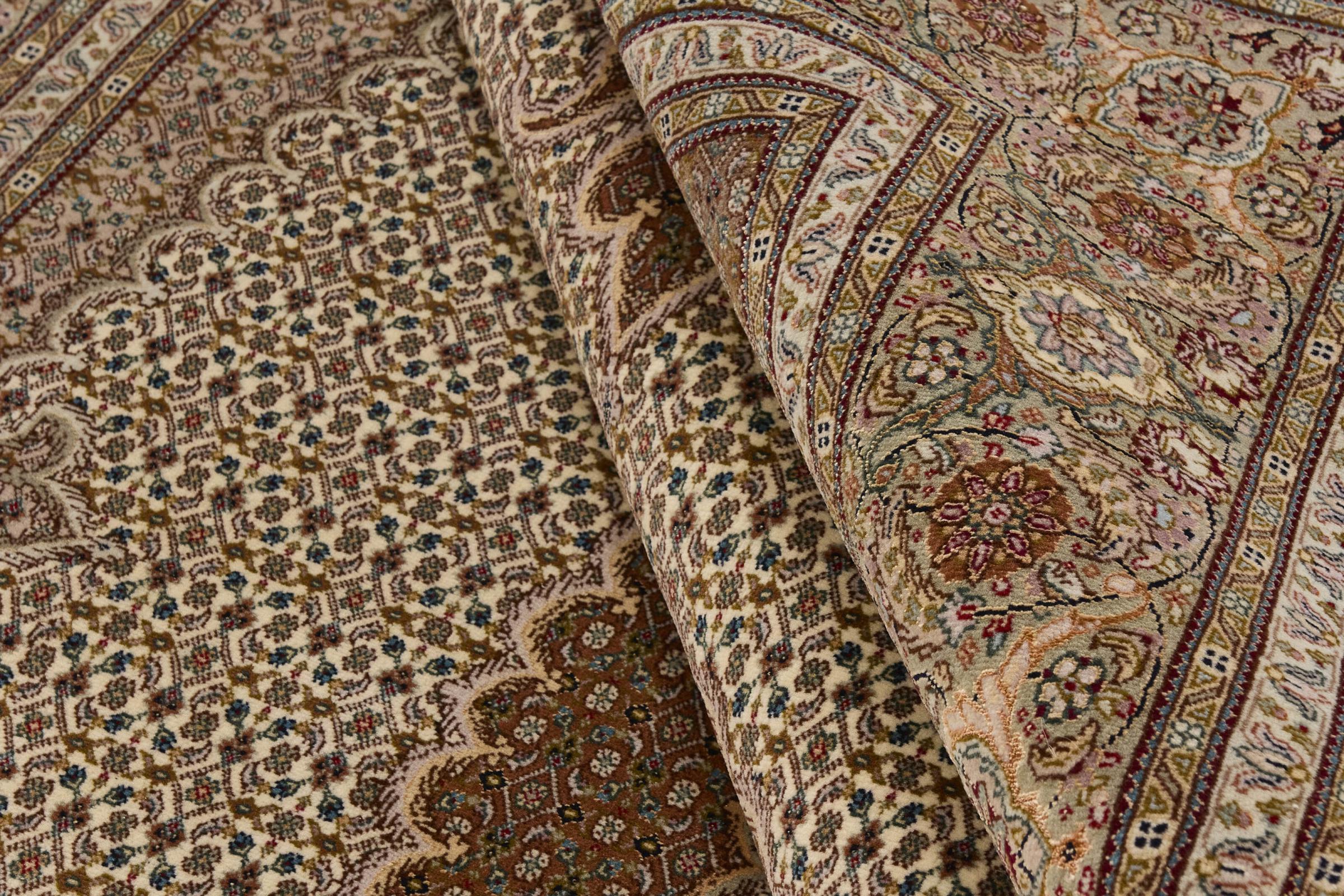 Carpet ID: 310238009647963 Size: 304x205 cm Thickness: ap. 7 mm Knot density: 410 000 - 450 000 / m² Manufacturing: Knotted by hand Pile: Wool with silk Warp: Cotton Origin: Persia Age: New Weight: ap. 19 kg Also know as Tabris, Tabriz, Tebris, Tebriz, Täbris In stock: Unique - Only 1 in stock