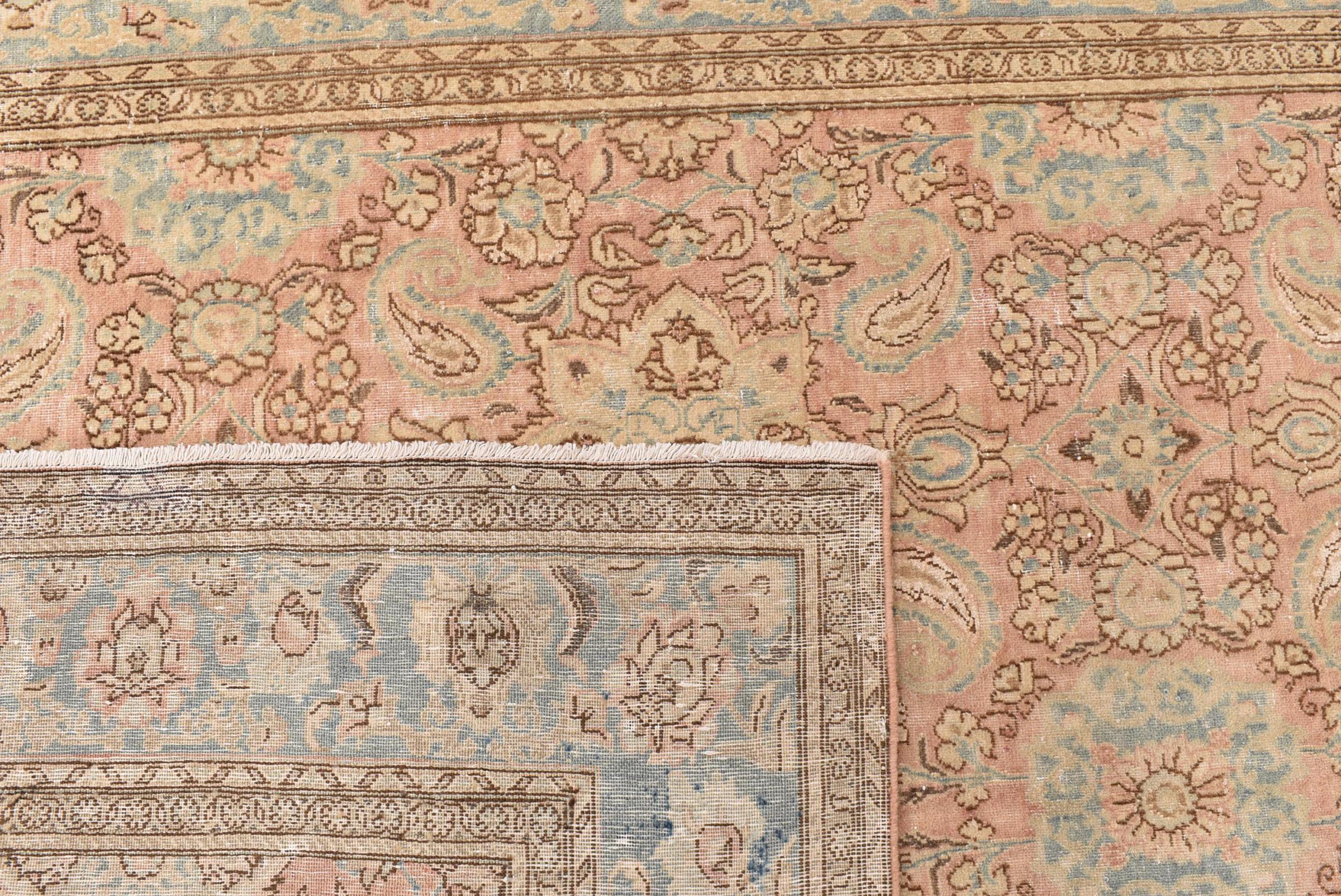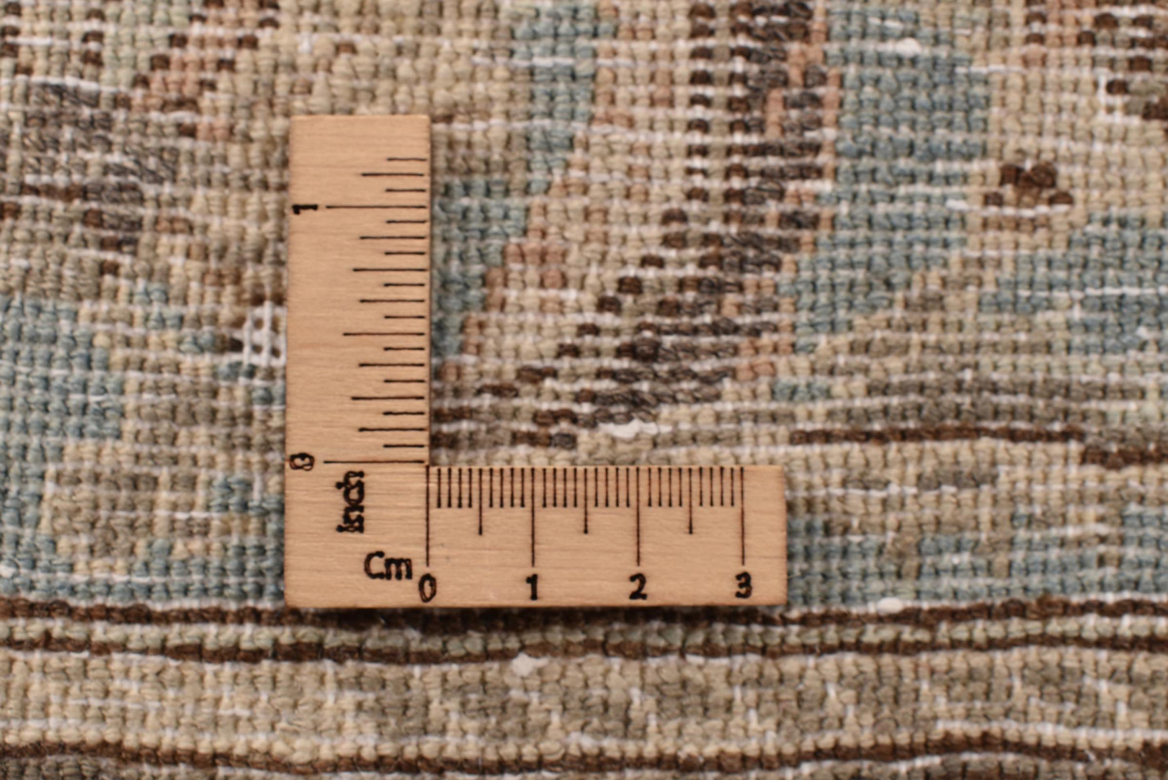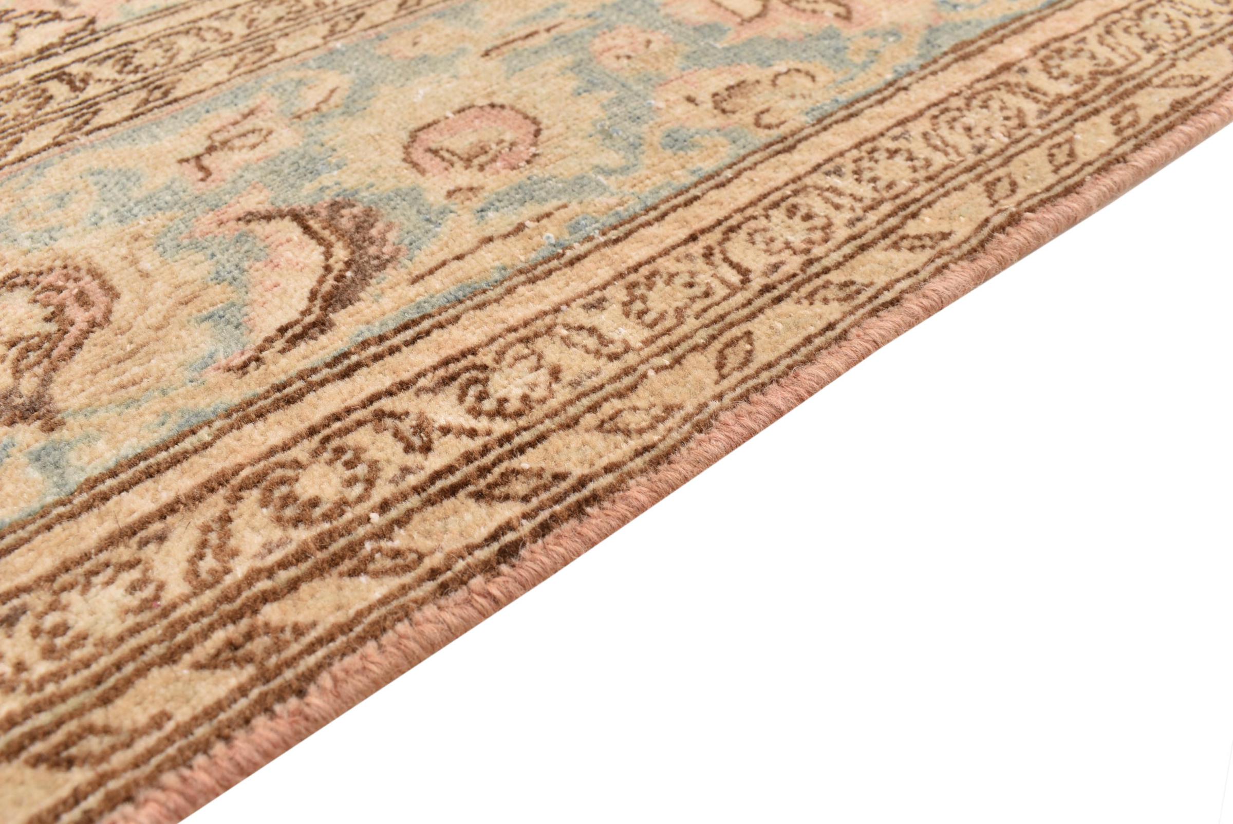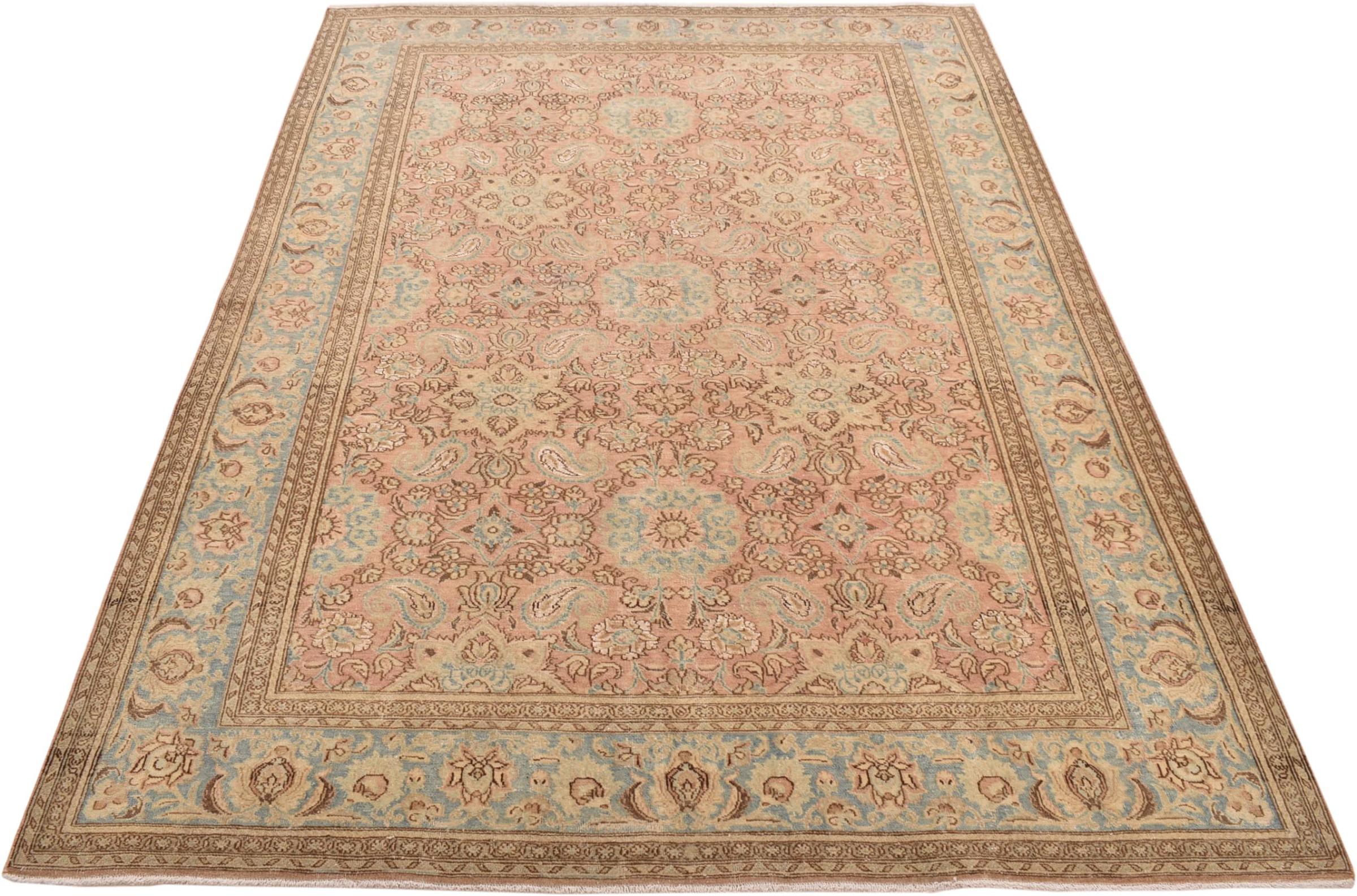 This is a hand-knotted Persian carpet that is at least 20 years old. Such a carpet can last for generations with the right care. The carpet has been completely re-dyed without completely over-dyeing the originally knotted ornaments. This gives the high quality Persian carpet a unique modern vintage character.