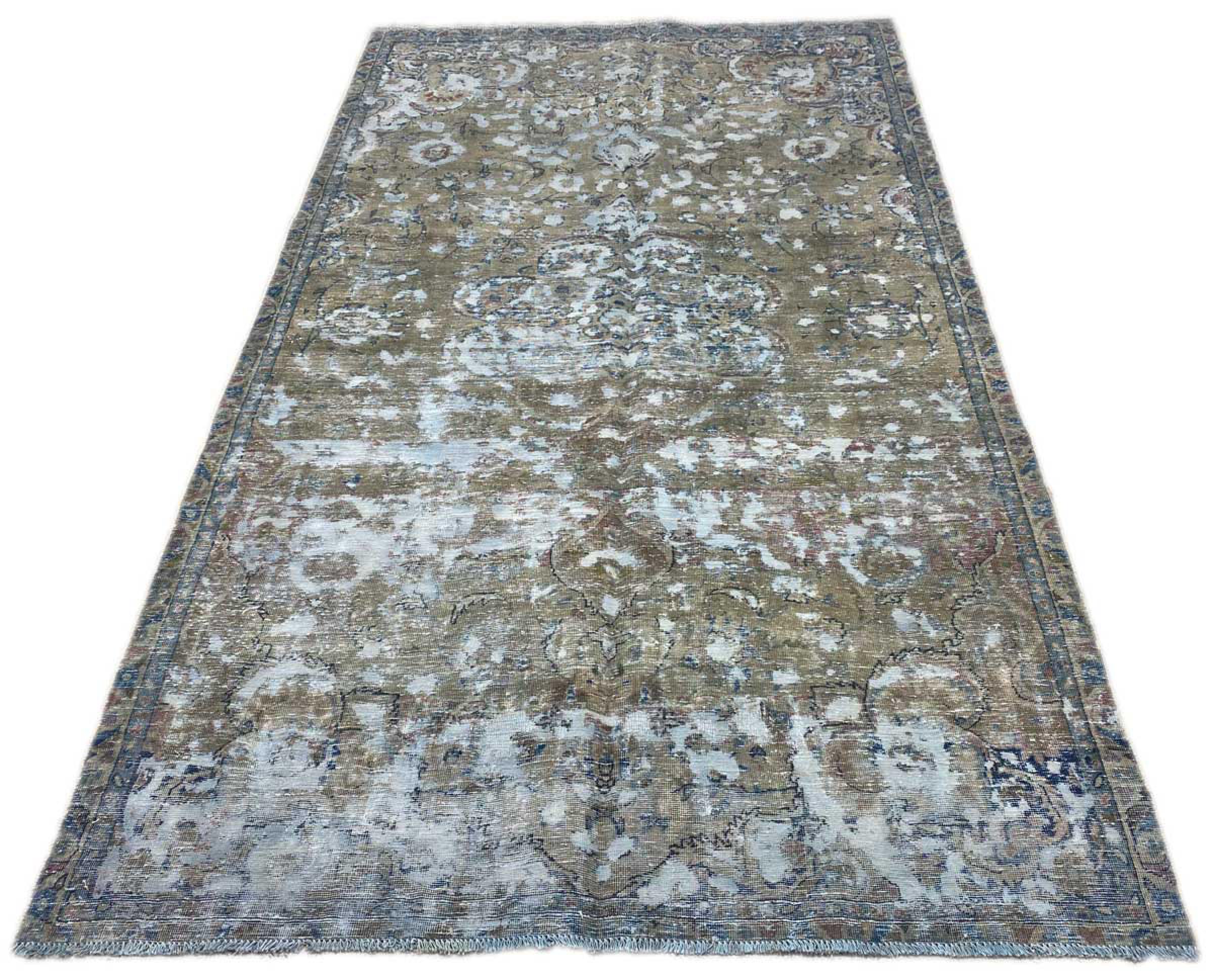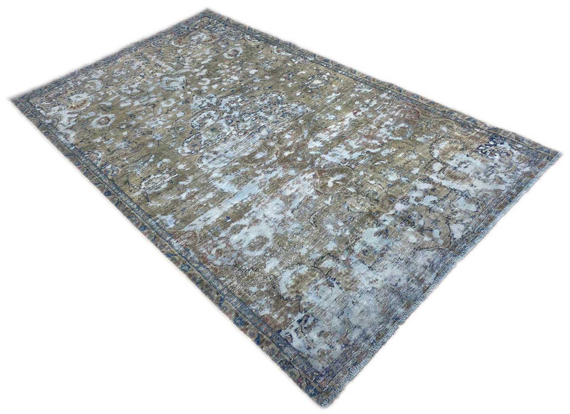 This is a hand-knotted Persian carpet that is at least 20 years old. Such a carpet can last for generations with the right care. The carpet has been completely re-dyed without completely over-dyeing the originally knotted ornaments. This gives the high quality Persian carpet a unique modern vintage character.
