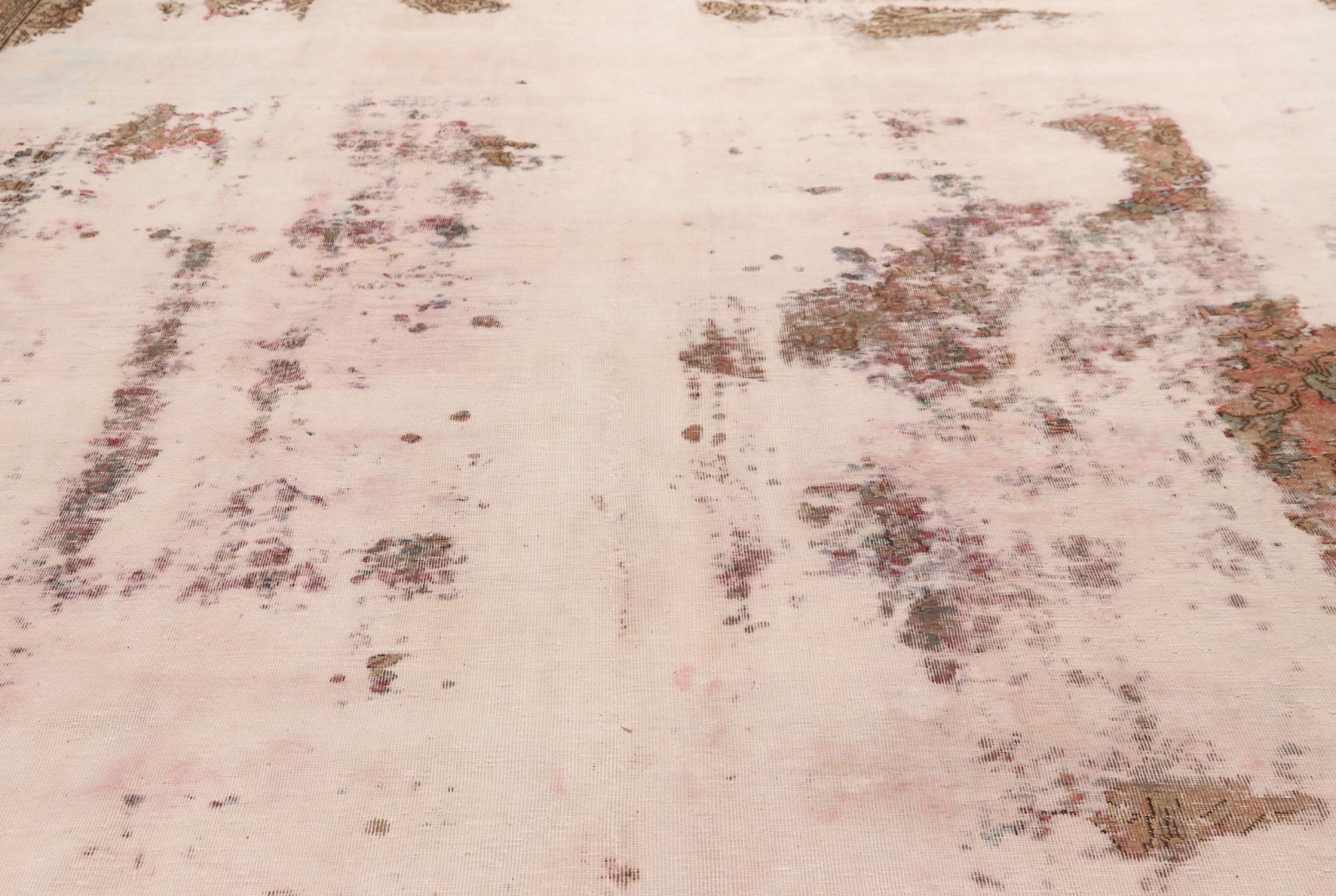 This is a hand-knotted Persian carpet that is at least 20 years old. Such a carpet can last for generations with the right care. The carpet has been completely re-dyed without completely over-dyeing the originally knotted ornaments. This gives the high quality Persian carpet a unique modern vintage character.